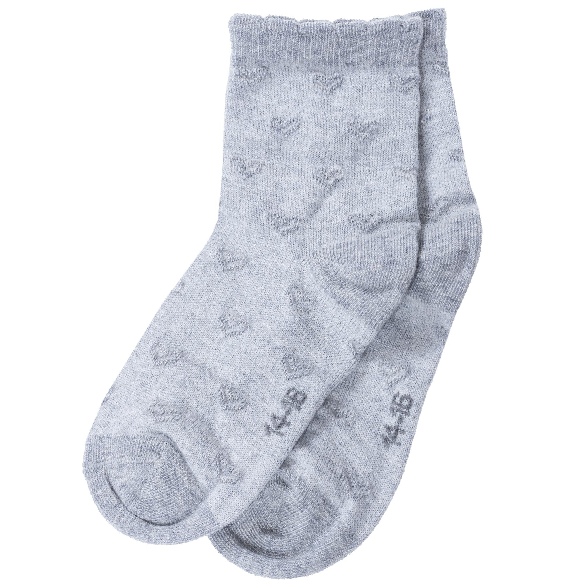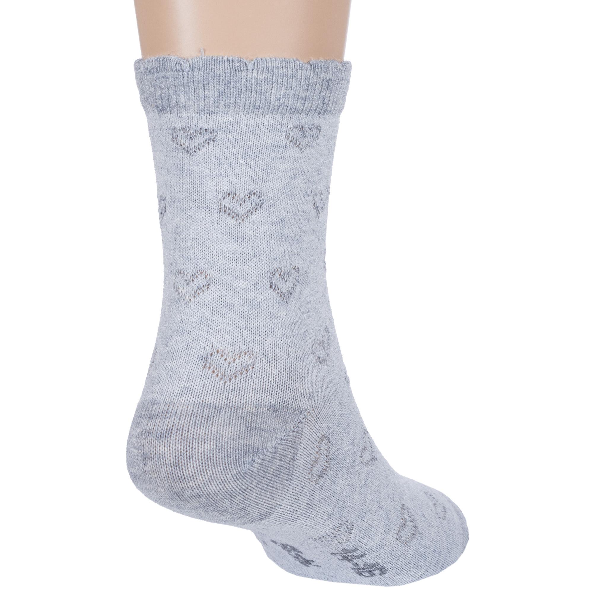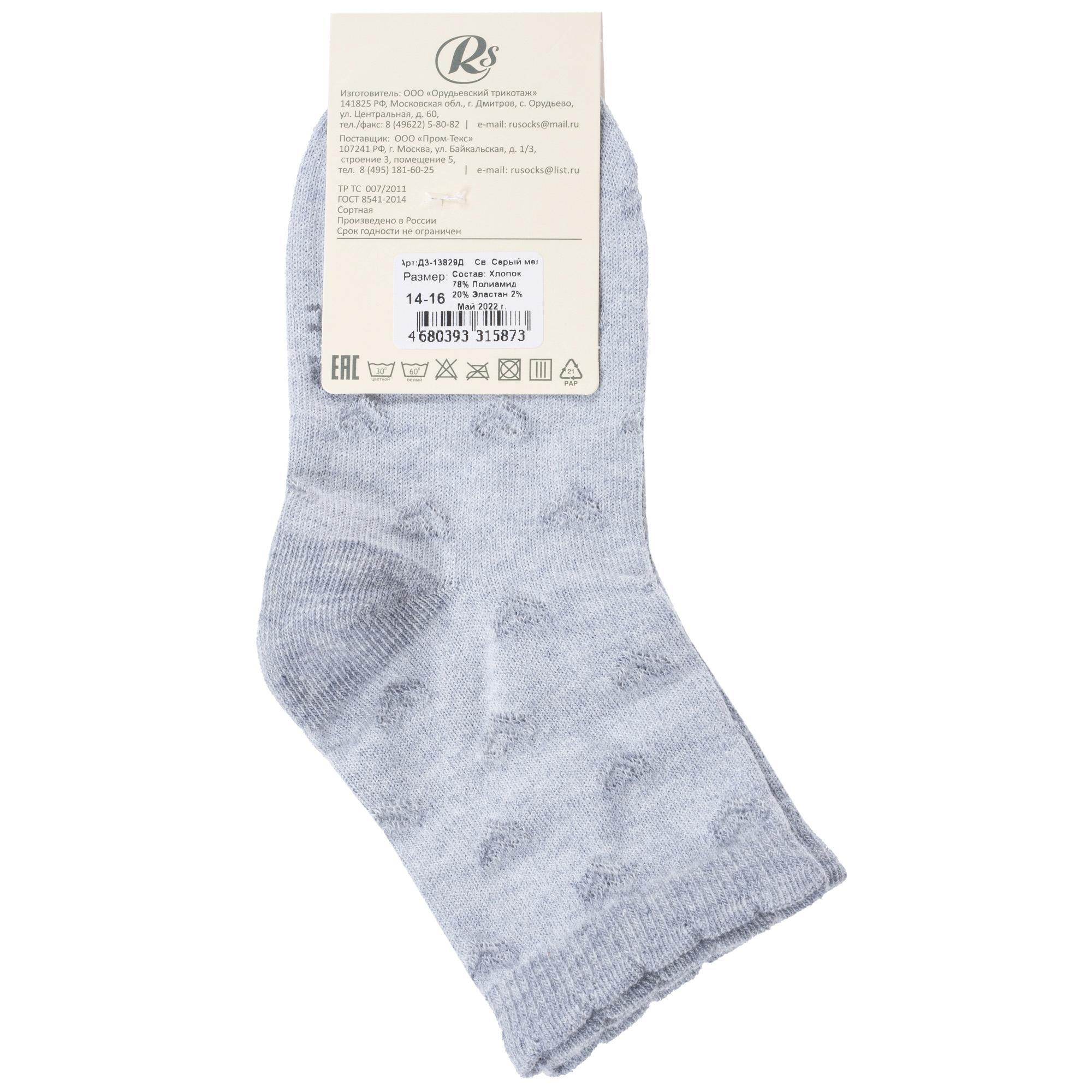 Межсезонные или летние укороченные детские носки, цвет светло-серый, классические, конструкция без шва, принт (рисунок): сердечки / поцелуи / любовь, кружево (или имитация), с узором, однотонный, состав: 78% хлопок, 20% полиамид, 2% эластан, арт. Д3-13829Д. Производитель «ООО Орудьевский трикотаж, Россия» под брендом «Rusocks (орудьевский трикотаж)».