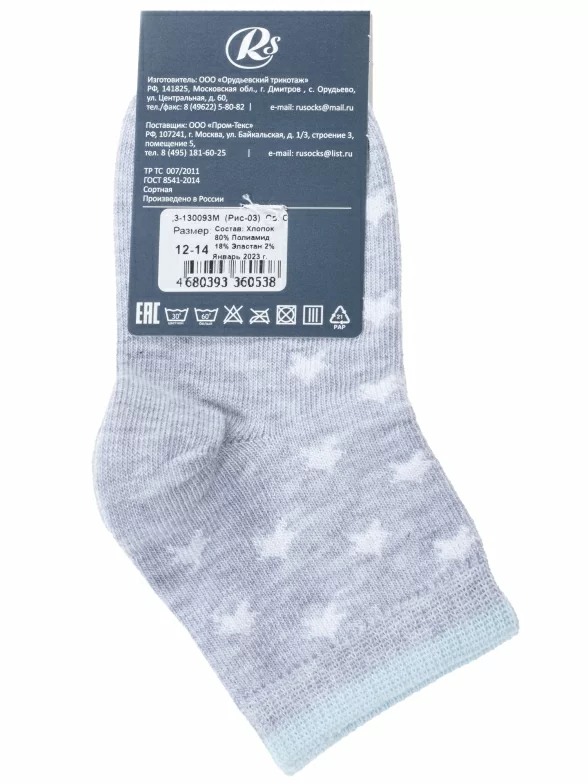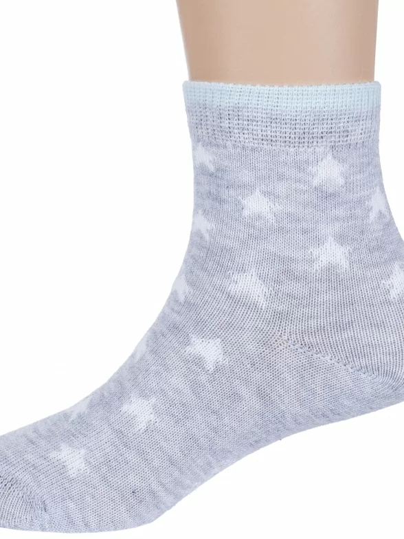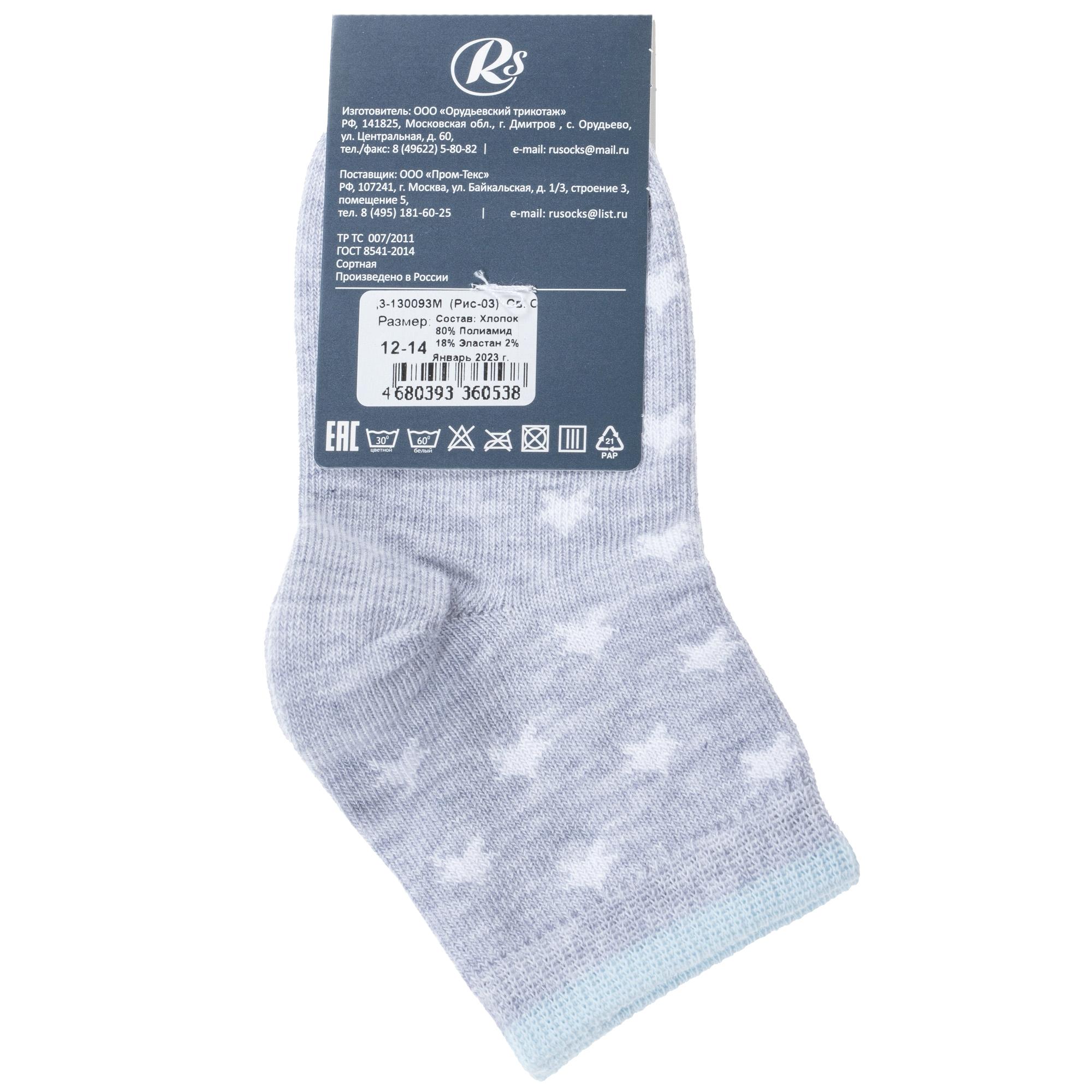 Круглогодичные укороченные детские носки, цвет светло-серый, повседневные, шов кеттельный (бесшовная технология), принт (рисунок): мелкий принт, контрастные пятка / мысок / резинка, звезды / небо, с узором, состав: 80% хлопок, 18% полиамид, 2% эластан, арт. Д3-130093М. Производитель «ООО Орудьевский трикотаж, Россия» под брендом «Rusocks (орудьевский трикотаж)».