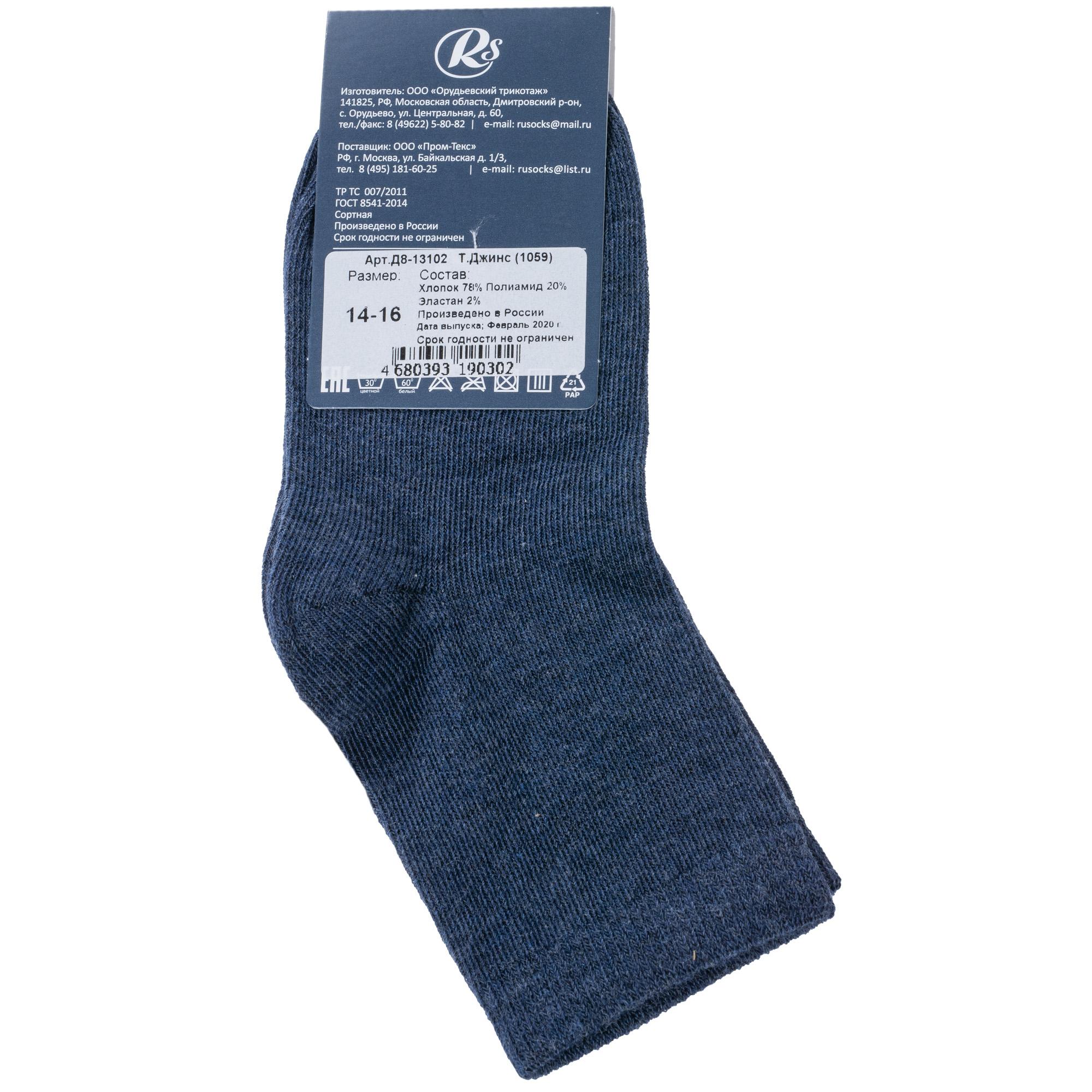 Круглогодичные укороченные детские носки, цвет джинс, классические, шов кеттельный (бесшовная технология), принт (рисунок): однотонный, без рисунков/узоров, состав: 78% хлопок, 20% полиамид, 2% эластан, арт. Д8-13102. Производитель «ООО Орудьевский трикотаж, Россия» под брендом «Rusocks (орудьевский трикотаж)».
