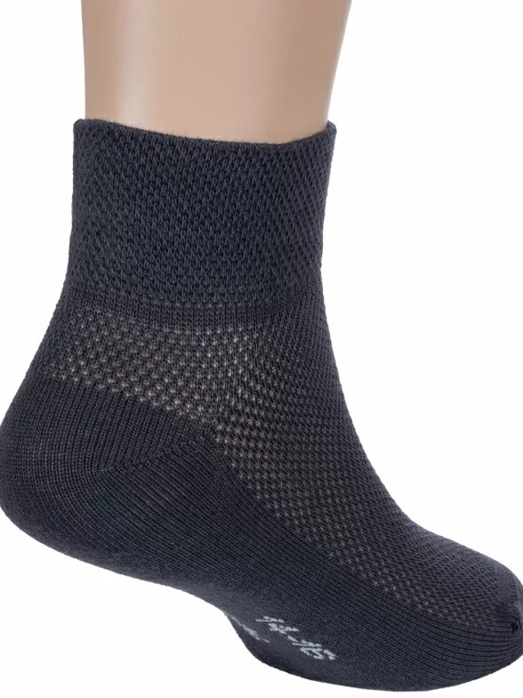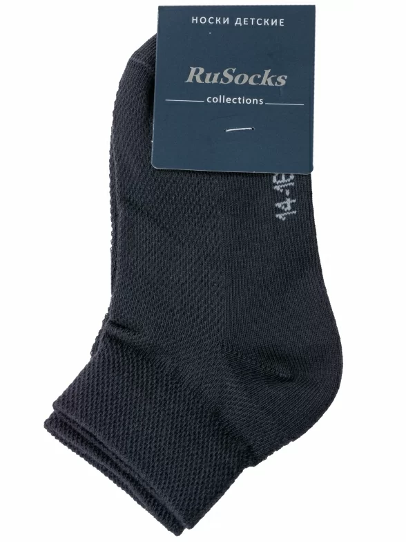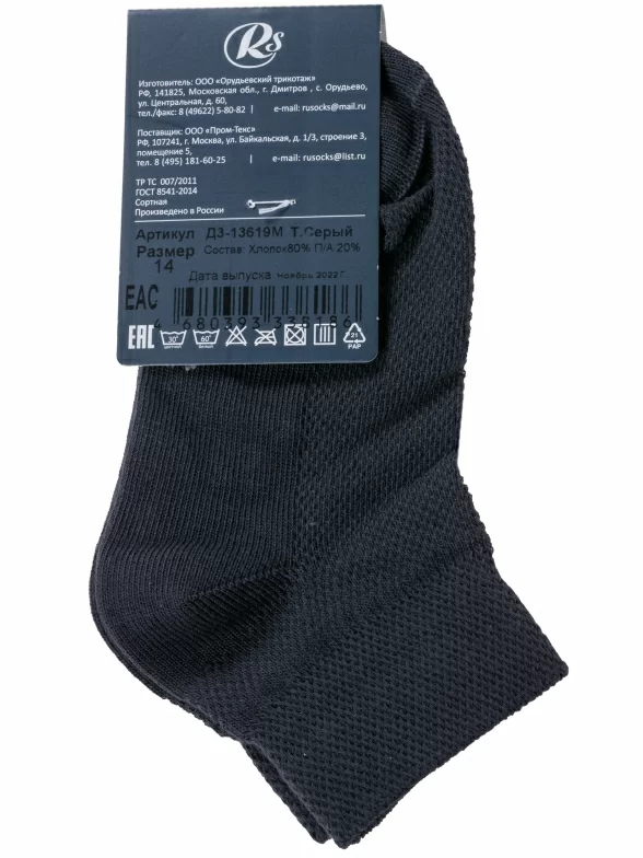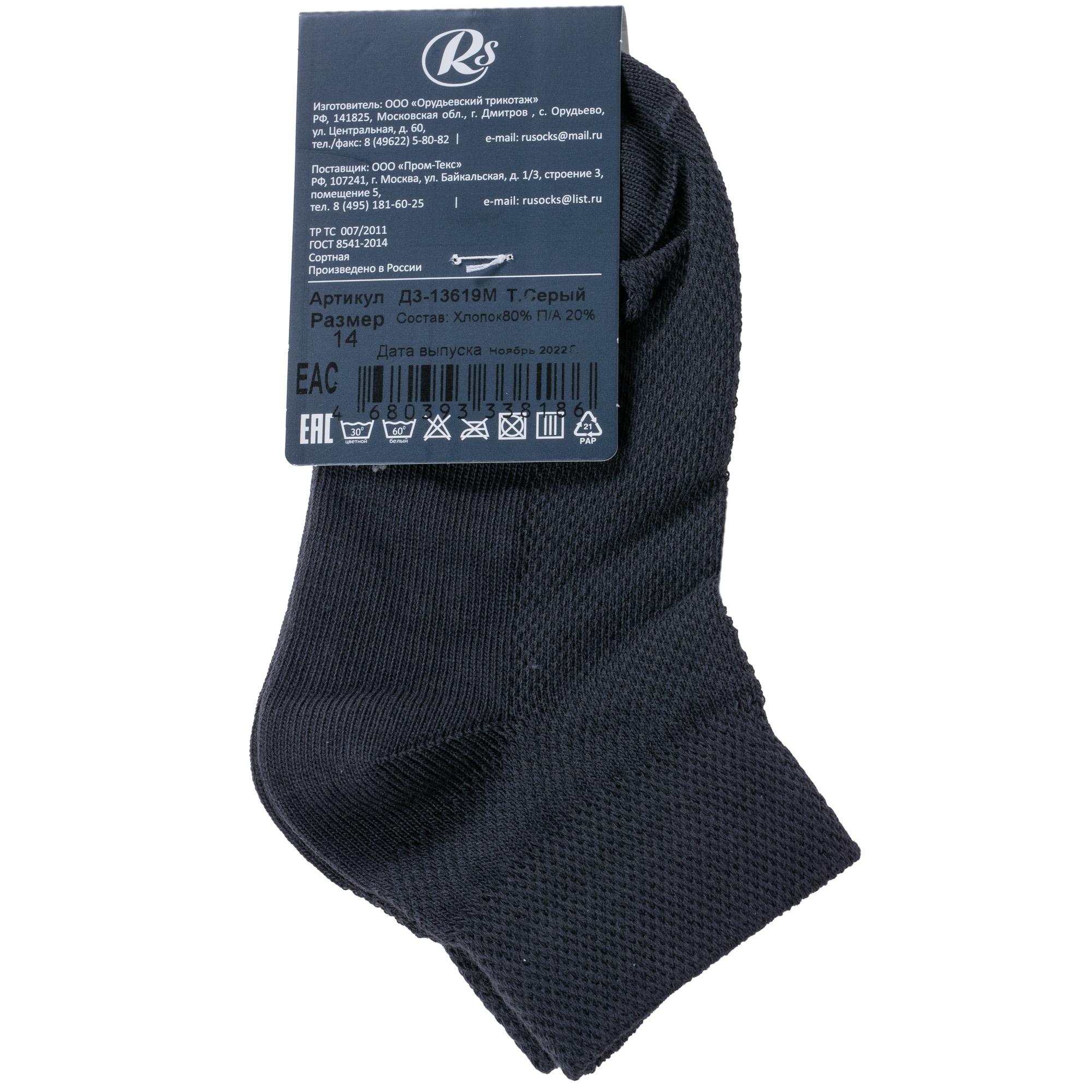 Летние короткие детские носки, цвет темно-серый, в сеточку, спортивные, классические, конструкция без шва, принт (рисунок): однотонный, без рисунков/узоров, состав: 80% хлопок, 20% полиамид, арт. Д3-13619М. Производитель «ООО Орудьевский трикотаж, Россия» под брендом «Rusocks (орудьевский трикотаж)».