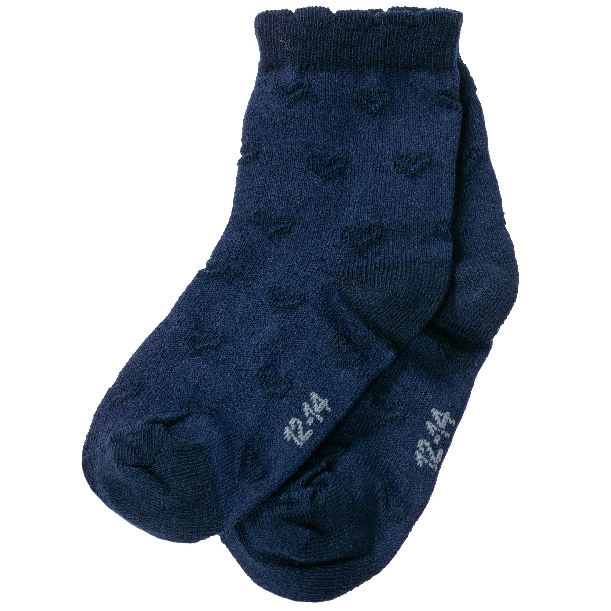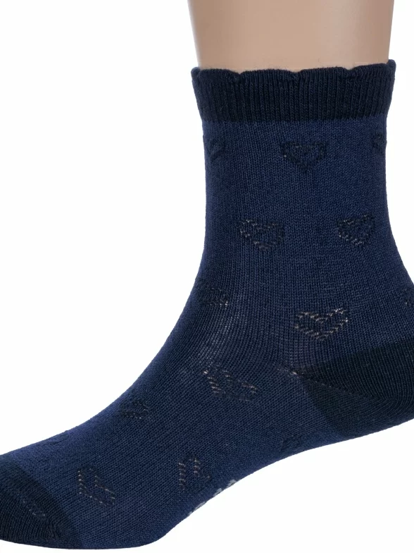 Межсезонные или летние укороченные детские носки, цвет темно-синий, классические, конструкция без шва, принт (рисунок): сердечки / поцелуи / любовь, кружево (или имитация), с узором, однотонный, состав: 78% хлопок, 20% полиамид, 2% эластан, арт. Д3-13829Д. Производитель «ООО Орудьевский трикотаж, Россия» под брендом «Rusocks (орудьевский трикотаж)».