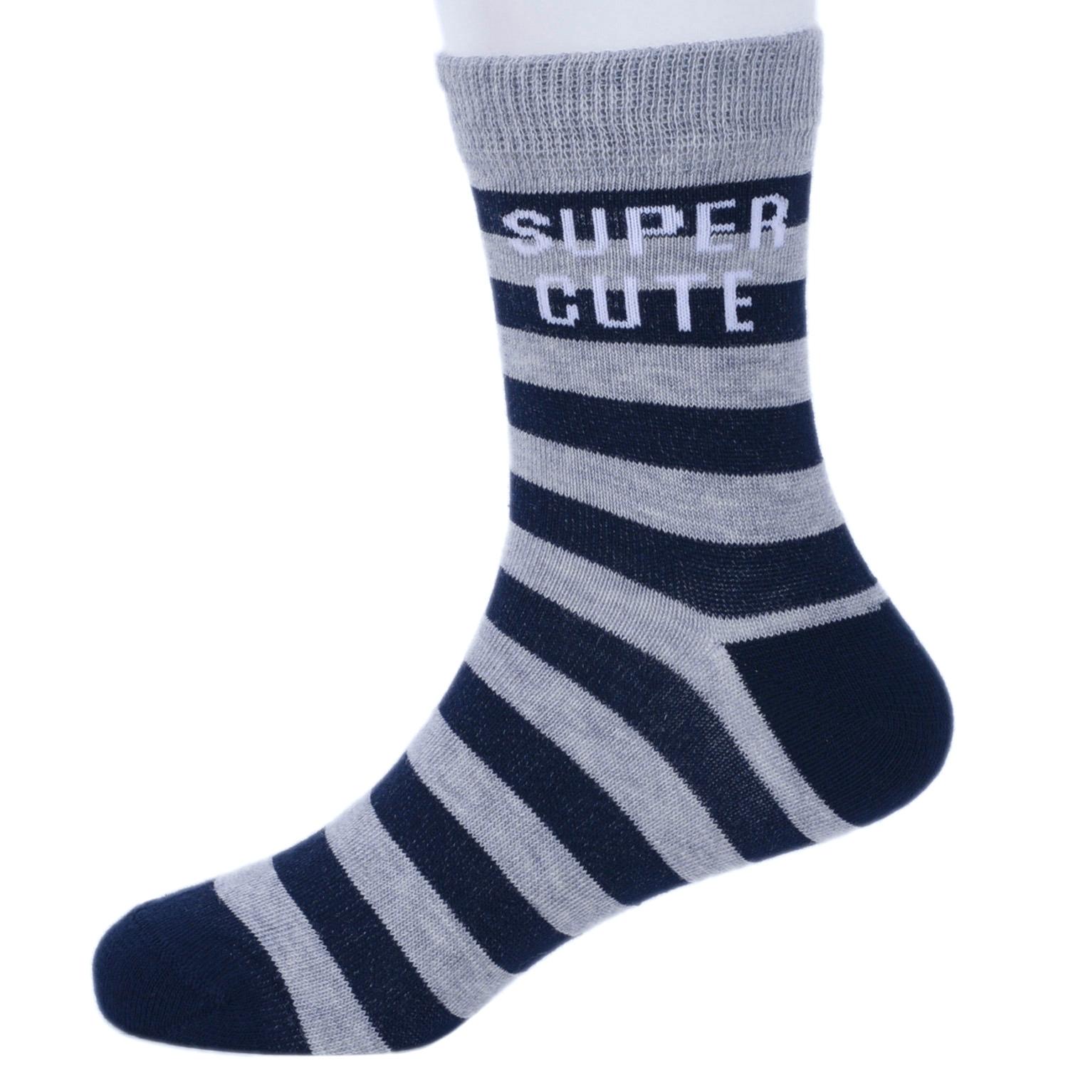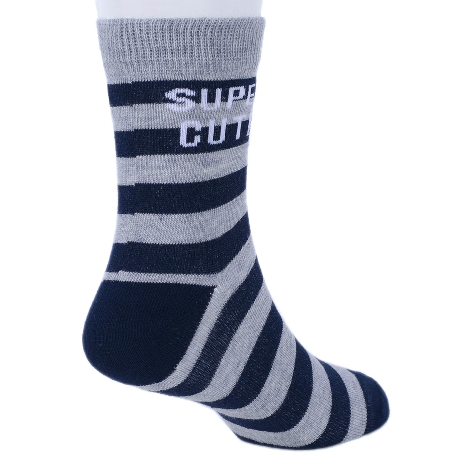 Круглогодичные средней длины детские носки, цвет темно-синий, повседневные, шов кеттельный (бесшовная технология), принт (рисунок): полоски, надписи, с узором, состав: 78% хлопок, 20% полиамид, 2% эластан, арт. Д-31354. Производитель «ООО Орудьевский трикотаж, Россия» под брендом «Rusocks (орудьевский трикотаж)».