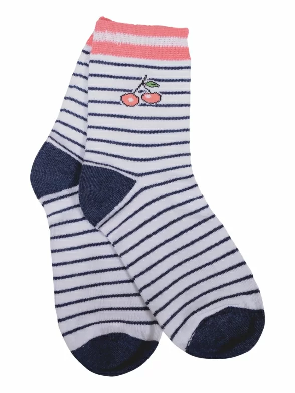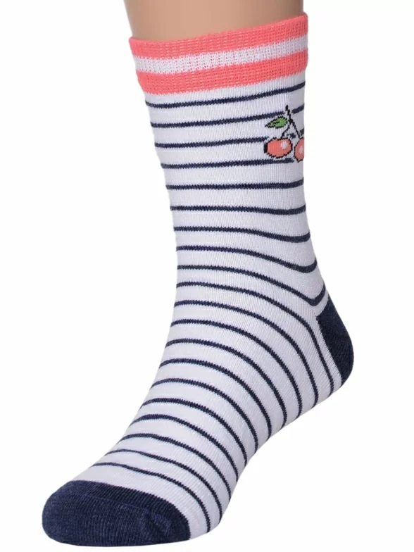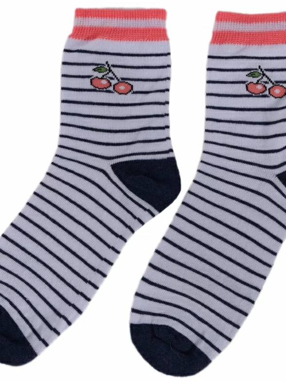 Круглогодичные укороченные детские носки, цвет многоцветные (мультиколор)-белый, повседневные, шов кеттельный (бесшовная технология), принт (рисунок): овощи / фрукты / ягоды, полоски, еда и напитки, с узором, состав: 78% хлопок, 20% полиамид, 2% эластан, арт. Д-31353. Производитель «ООО Орудьевский трикотаж, Россия» под брендом «Rusocks (орудьевский трикотаж)».