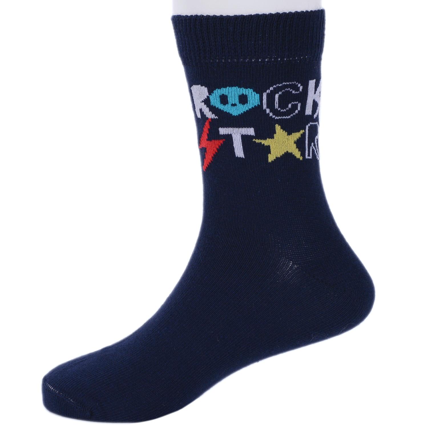 Круглогодичные средней длины детские носки, цвет темно-синий, повседневные, шов кеттельный (бесшовная технология), принт (рисунок): надписи, музыка, с узором, крупные контрастные рисунки, состав: 78% хлопок, 20% полиамид, 2% эластан, арт. Д-31354. Производитель «ООО Орудьевский трикотаж, Россия» под брендом «Rusocks (орудьевский трикотаж)».