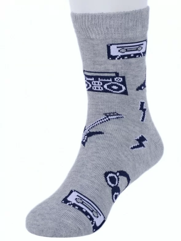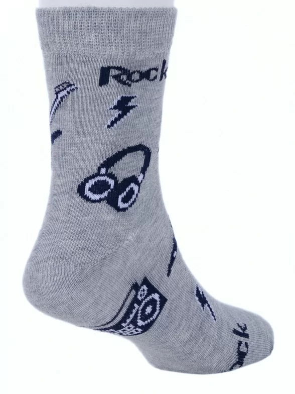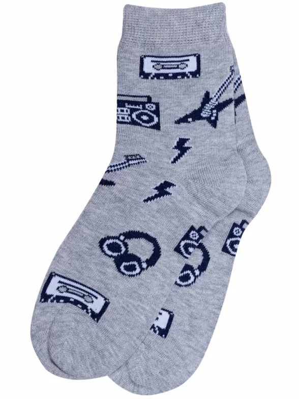 Круглогодичные средней длины детские носки, цвет серый, повседневные, шов кеттельный (бесшовная технология), принт (рисунок): техника, музыка, с узором, крупные контрастные рисунки, состав: 78% хлопок, 20% полиамид, 2% эластан, арт. Д-31354. Производитель «ООО Орудьевский трикотаж, Россия» под брендом «Rusocks (орудьевский трикотаж)».