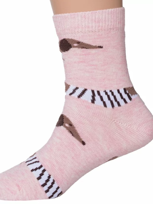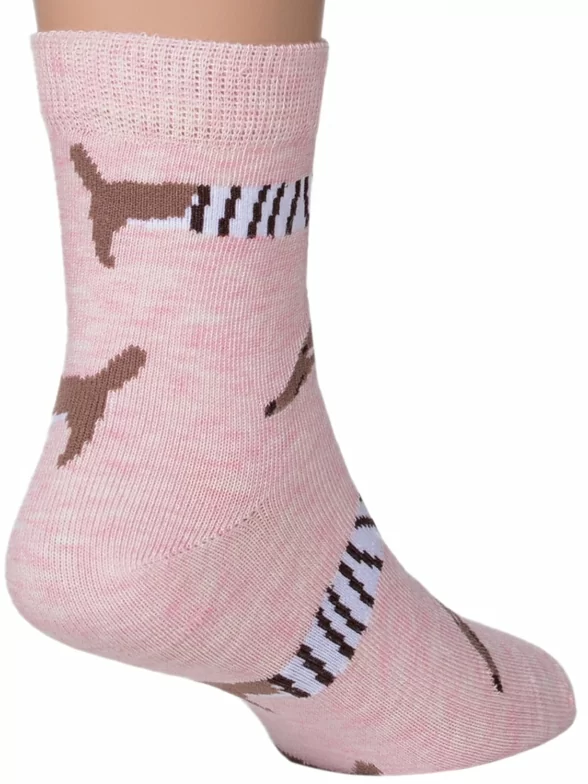 Круглогодичные укороченные детские носки, цвет розовый, повседневные, шов кеттельный (бесшовная технология), принт (рисунок): крупные контрастные рисунки, животные, с узором, состав: 78% хлопок, 20% полиамид, 2% эластан, арт. Д-31353. Производитель «ООО Орудьевский трикотаж, Россия» под брендом «Rusocks (орудьевский трикотаж)».