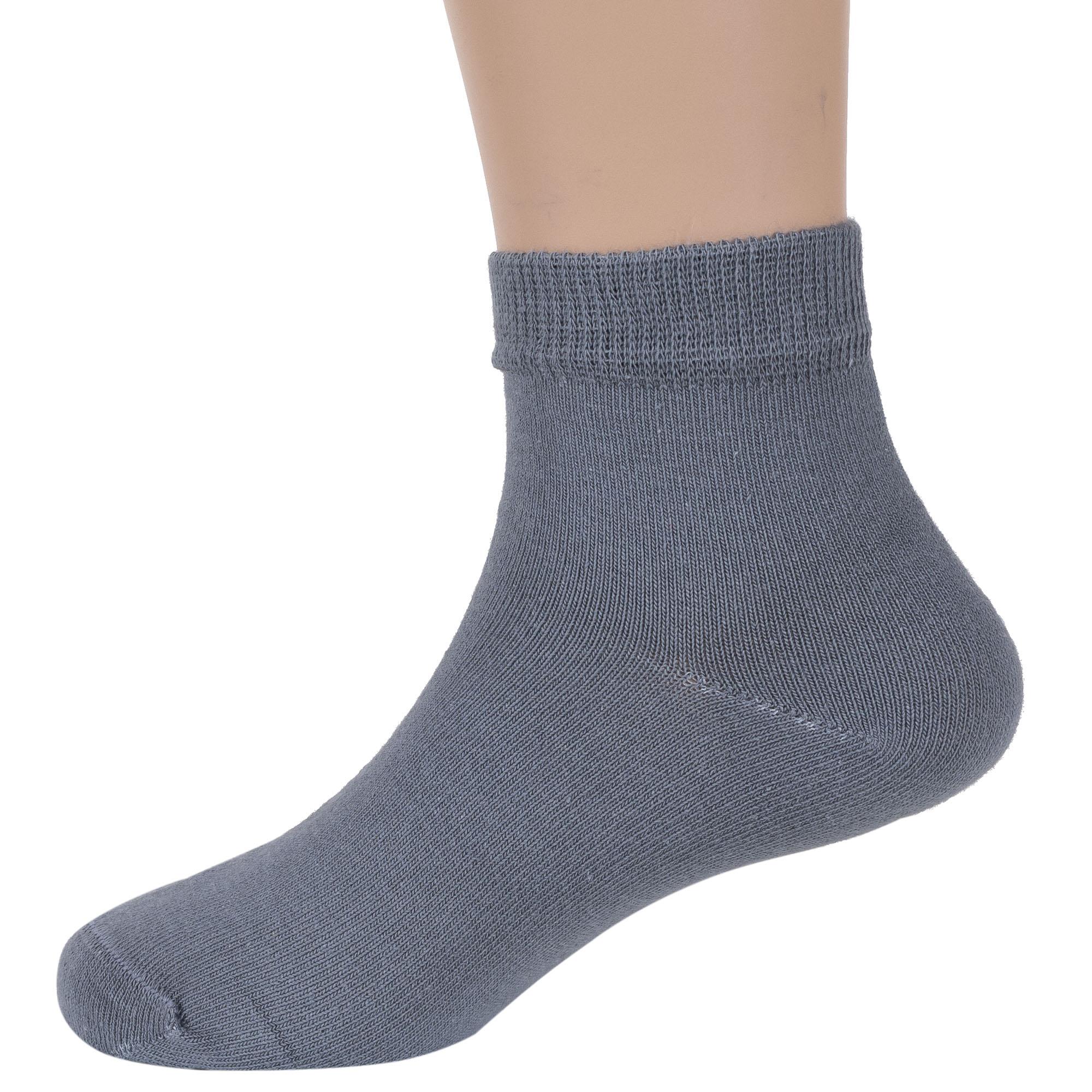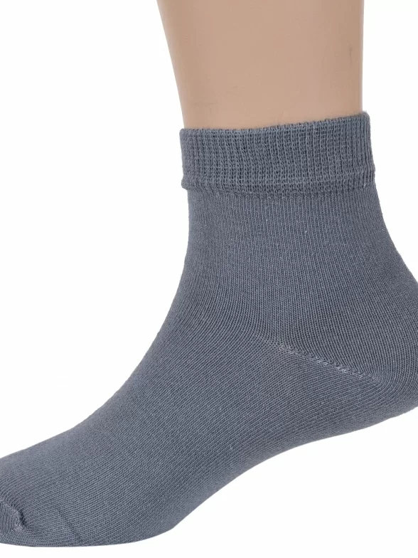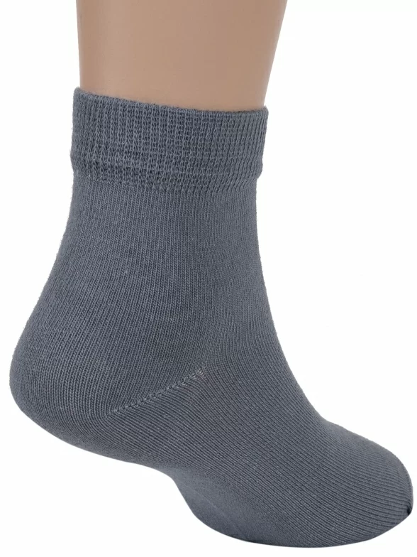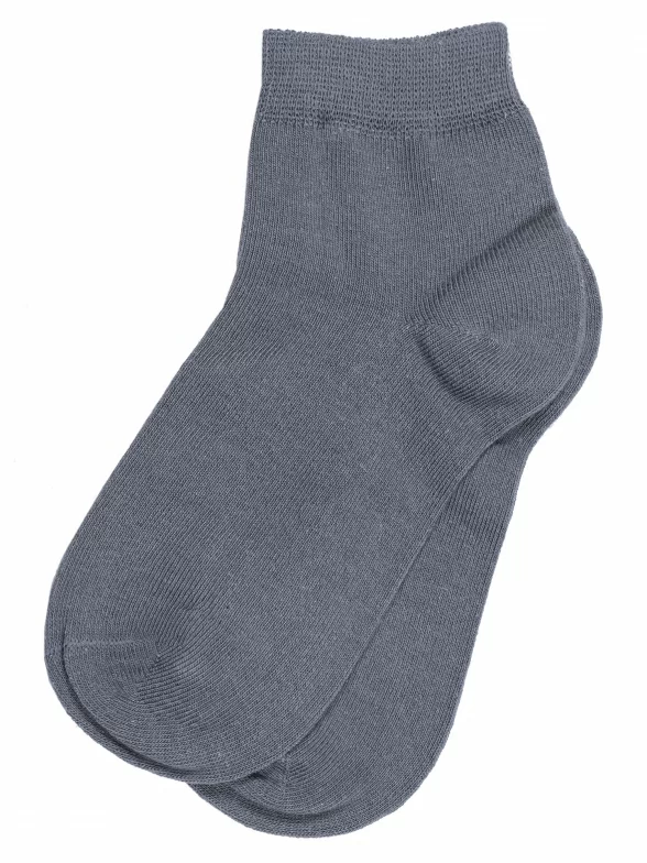 Круглогодичные или летние укороченные детские носки, цвет серый, классические, шов кеттельный (бесшовная технология), принт (рисунок): однотонный, без рисунков/узоров, состав: 87% хлопок, 10% полиамид, 3% эластан, арт. Д-3135. Производитель «ООО Орудьевский трикотаж, Россия» под брендом «Rusocks (орудьевский трикотаж)».