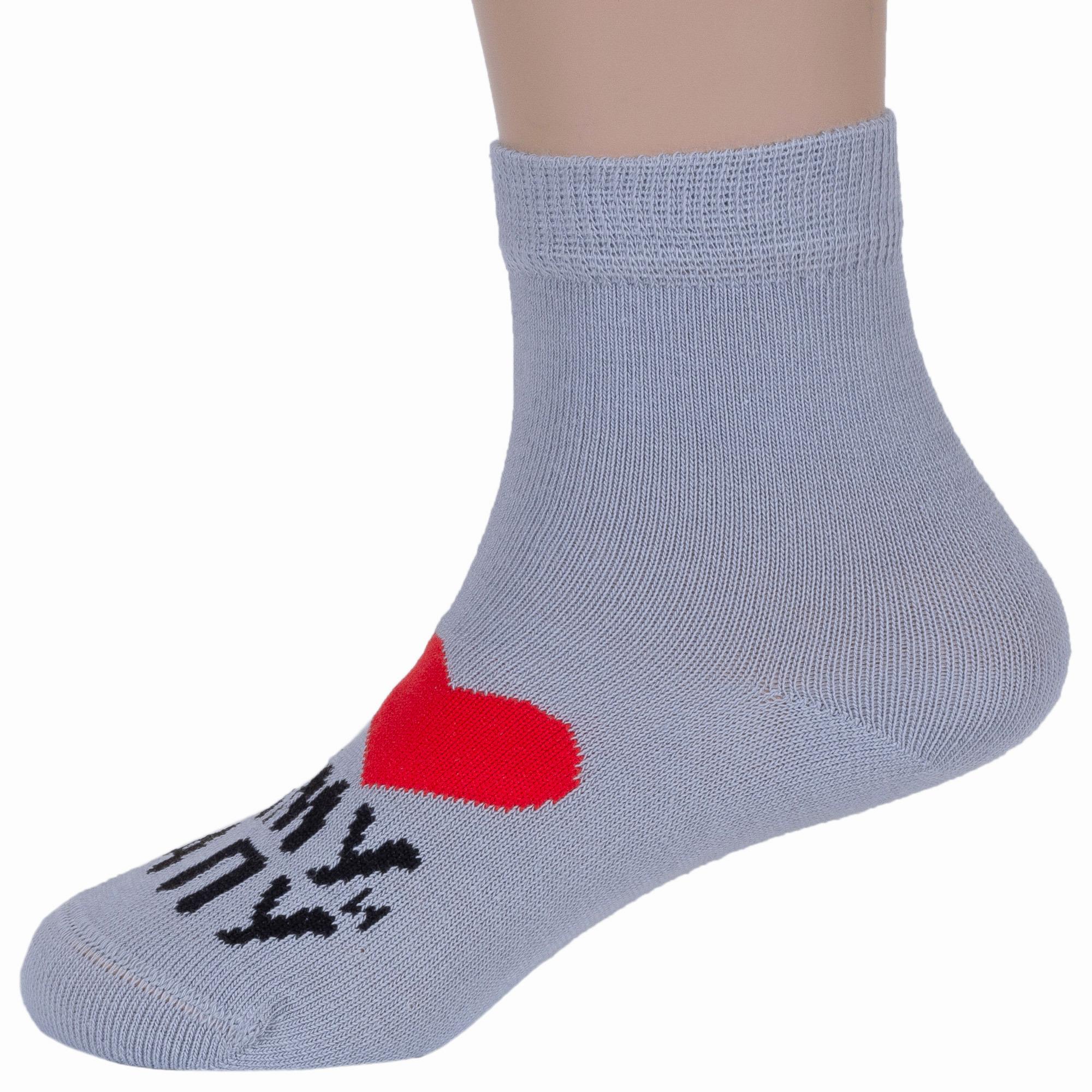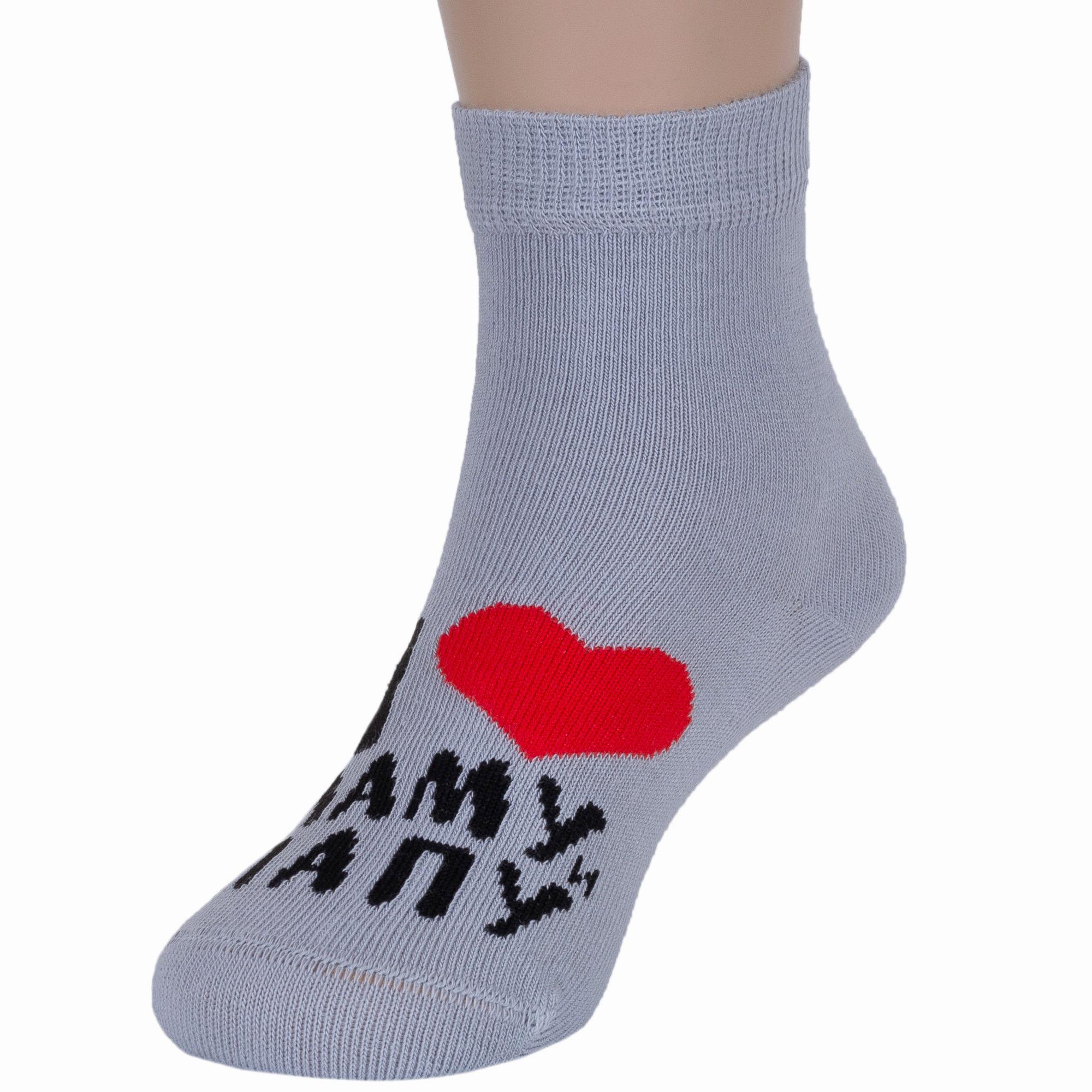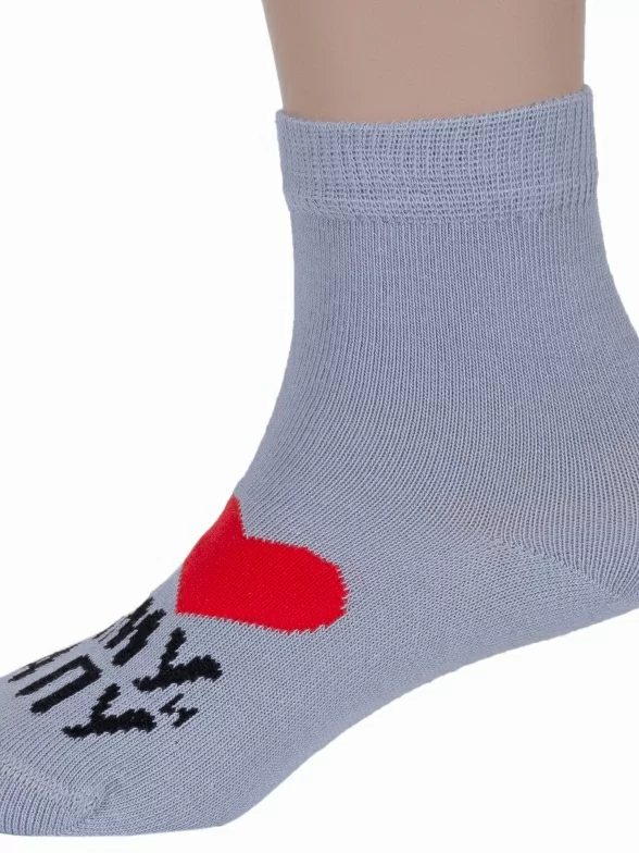 Круглогодичные укороченные детские носки, цвет светло-серый, повседневные, шов кеттельный (бесшовная технология), принт (рисунок): сердечки / поцелуи / любовь, надписи, с узором, крупные контрастные рисунки, состав: 85% хлопок, 13% полиамид, 2% эластан, арт. Д-106/1. Производитель «ООО Орудьевский трикотаж, Россия» под брендом «Rusocks (орудьевский трикотаж)».
