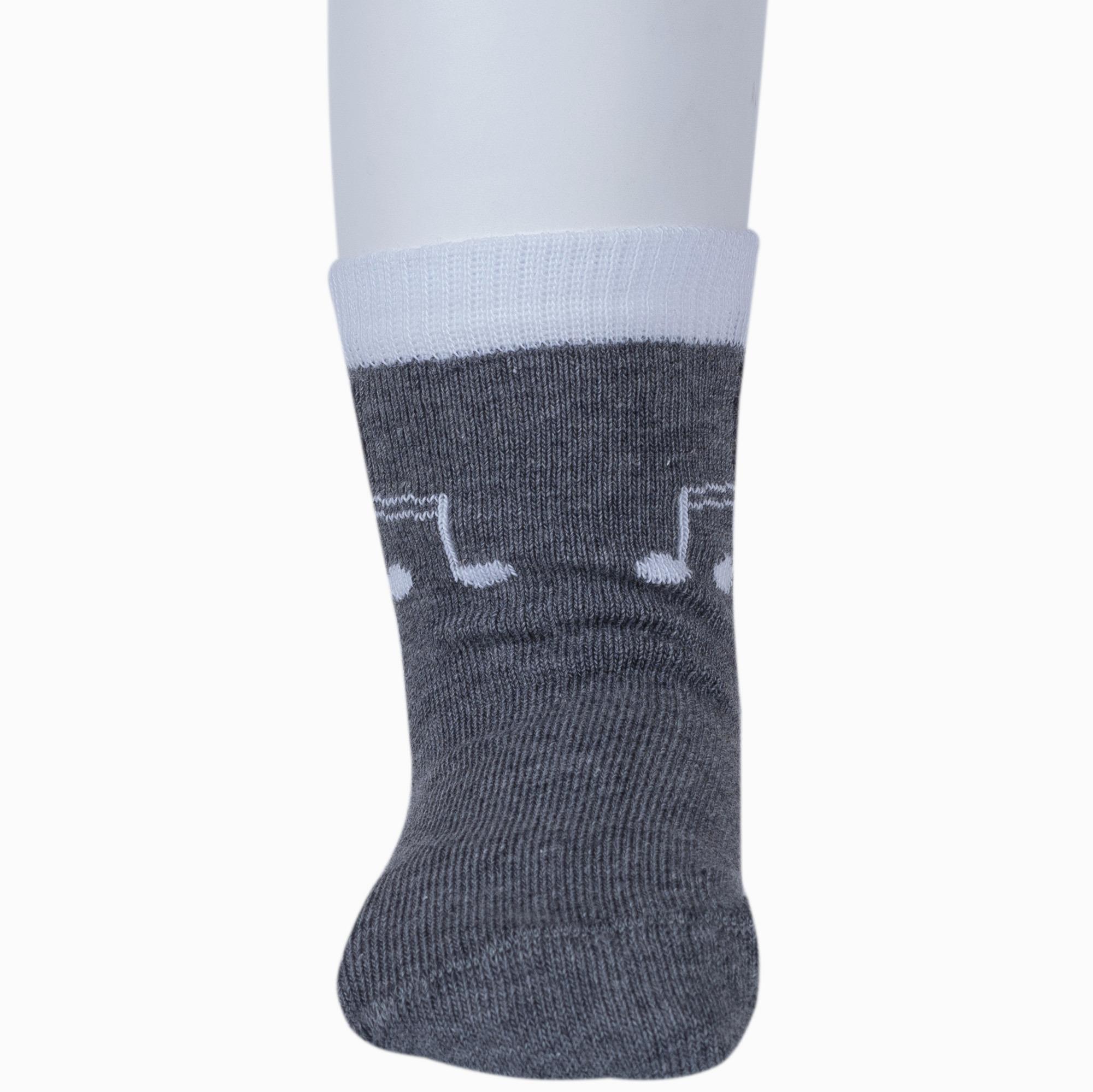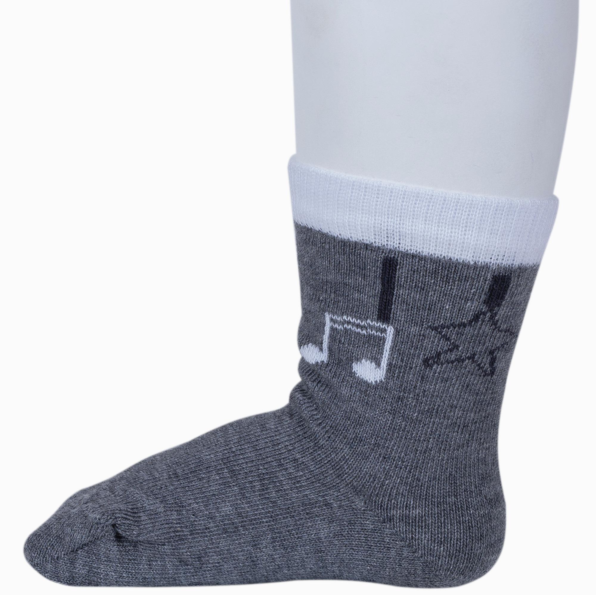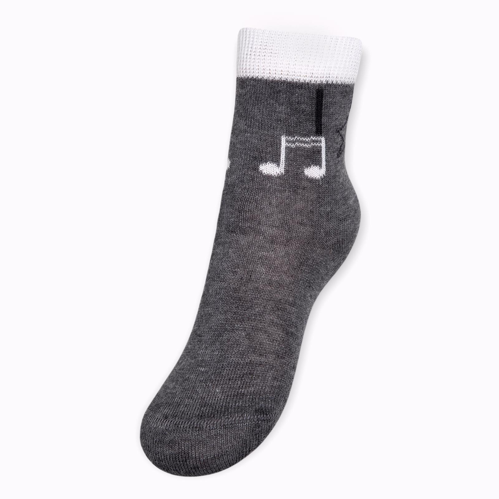Круглогодичные укороченные детские носки, цвет темно-серый, повседневные, шов кеттельный (бесшовная технология), принт (рисунок): музыка, с узором, состав: 78% хлопок, 20% полиамид, 2% эластан, арт. Д3-13790. Производитель «ООО Орудьевский трикотаж, Россия» под брендом «Rusocks (орудьевский трикотаж)».