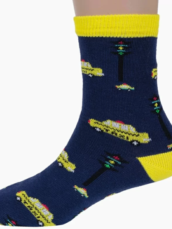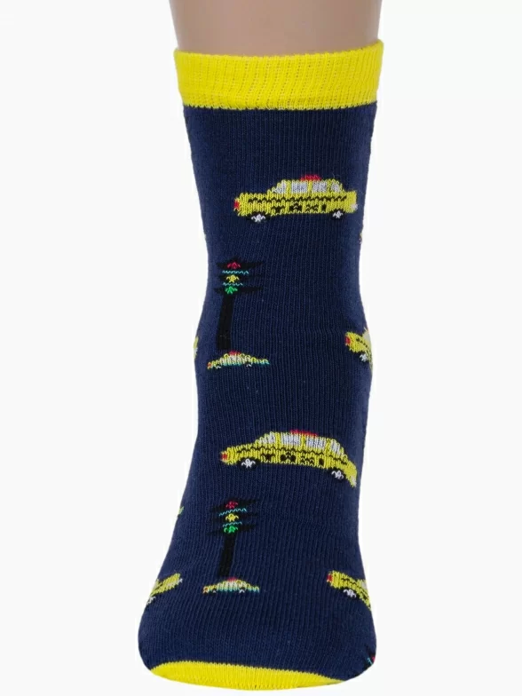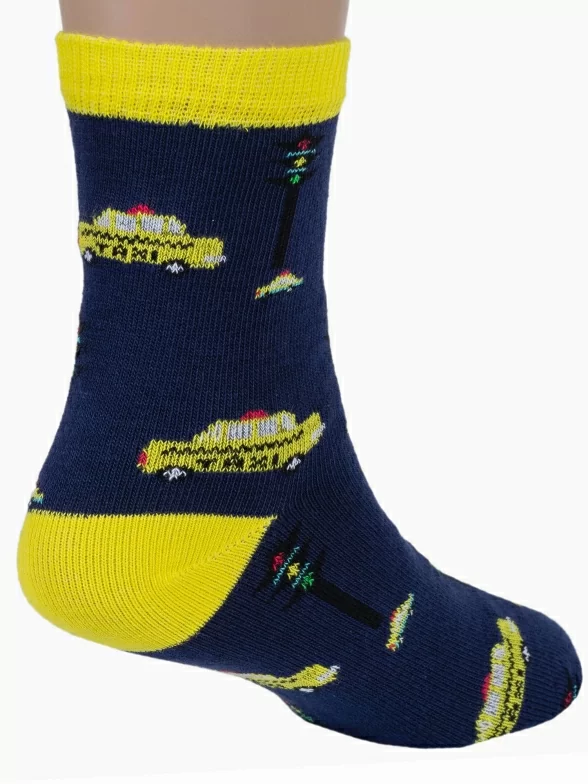 Круглогодичные средней длины детские носки, цвет темно-синий, повседневные, шов кеттельный (бесшовная технология), принт (рисунок): транспорт, с узором, состав: 78% хлопок, 20% полиамид, 2% эластан, арт. Д3-13501. Производитель «ООО Орудьевский трикотаж, Россия» под брендом «Rusocks (орудьевский трикотаж)».