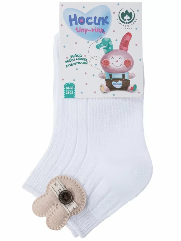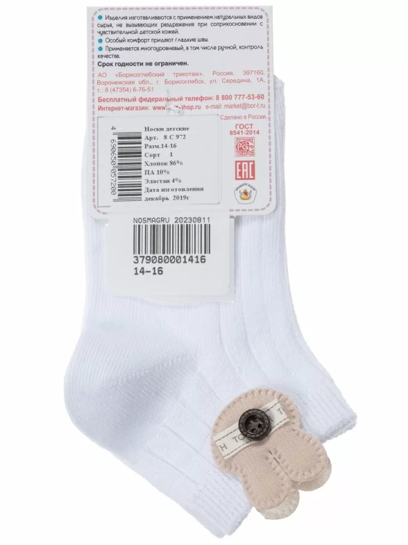 Летние короткие детские носки, цвет белый, необычные, повседневные, шов обычный (не бесшовные), принт (рисунок): животные, в рубчик, однотонный, состав: 86% хлопок, 10% полиамид, 4% эластан, арт. 8С972. Производитель «АО Борисоглебский трикотаж, Воронежская обл, Россия» под брендом «Борисоглебский трикотаж».