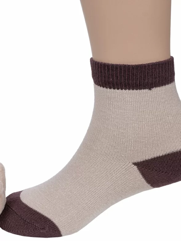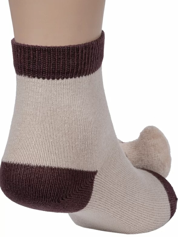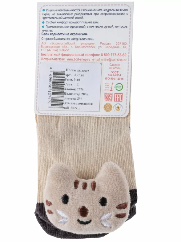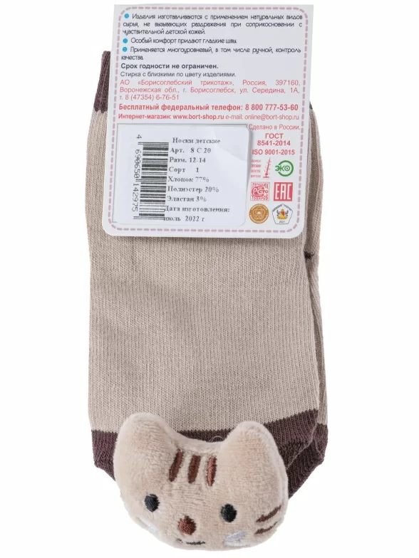 Круглогодичные укороченные детские носки, цвет бежевый, необычные, повседневные, шов обычный (не бесшовные), принт (рисунок): контрастные пятка / мысок / резинка, животные, с узором, состав: 77% хлопок, 20% полиэстер, 3% эластан, арт. 8С20. Производитель «АО Борисоглебский трикотаж, Воронежская обл, Россия» под брендом «Борисоглебский трикотаж».