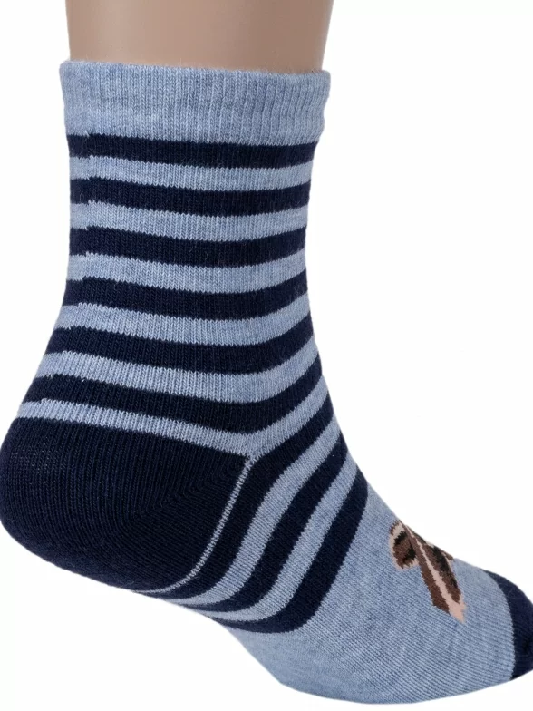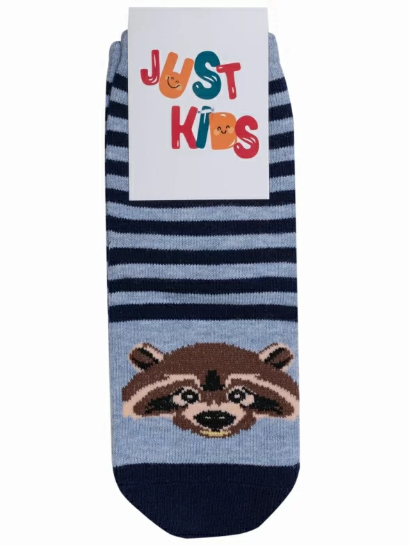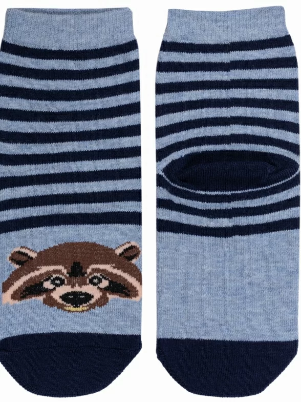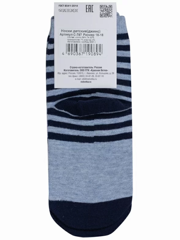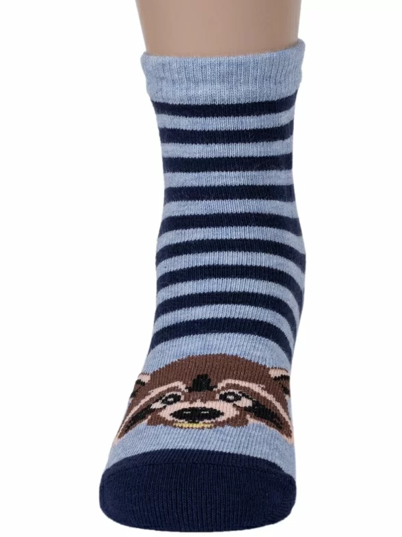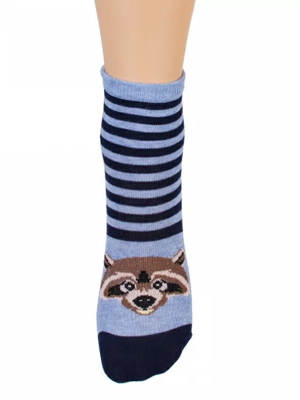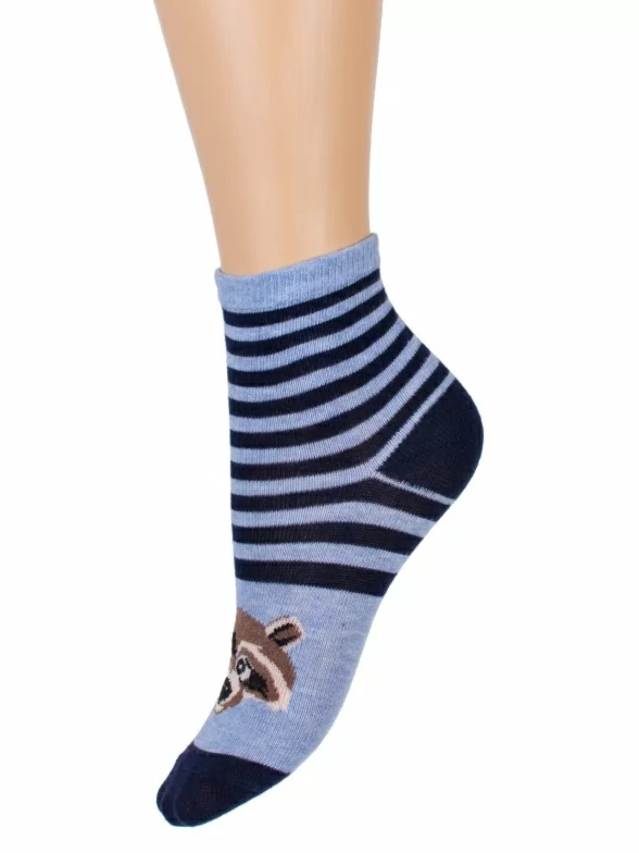Детские носки с полосками и изображением енота. Связаны на российской фабрике "Красная ветка" (Иваново). На 73% состоят из хлопка, что позволяет коже дышать целый день. Полиамид и эластан делают изделие более плотным, износостойким и хорошо тянущимся.
