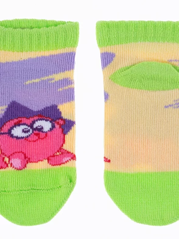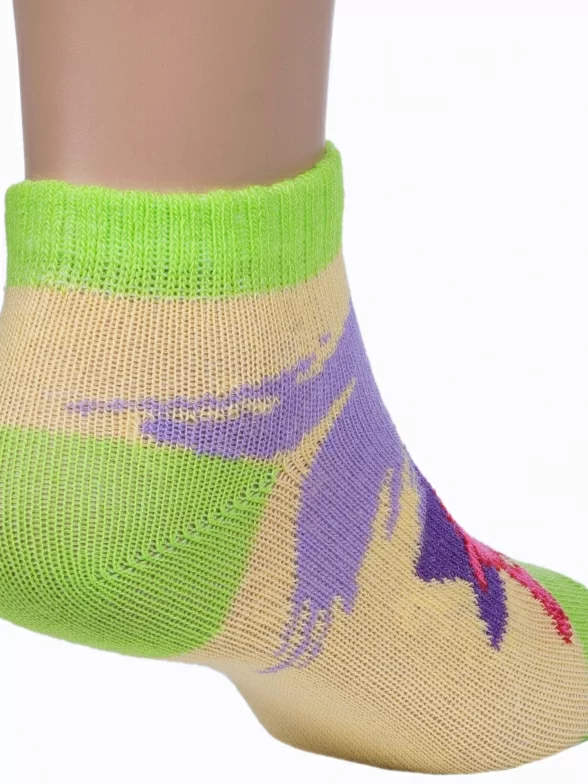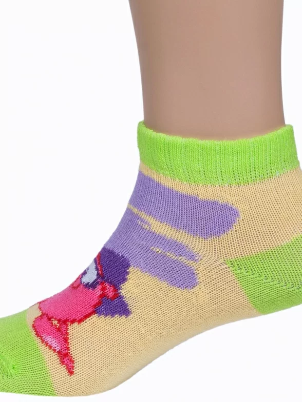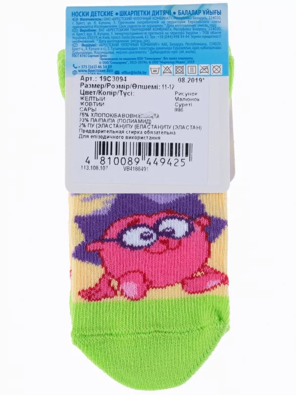 Летние укороченные детские носки, цвет многоцветные (мультиколор)-желтый, повседневные, шов обычный (не бесшовные), принт (рисунок): животные, с узором, крупные контрастные рисунки, состав: 75% хлопок, 23% полиамид, 2% эластан, арт. 19С3094. Производитель «Брестский чулочный комбинат ОАО, Беларусь» под брендом «Брестские (бчк)».