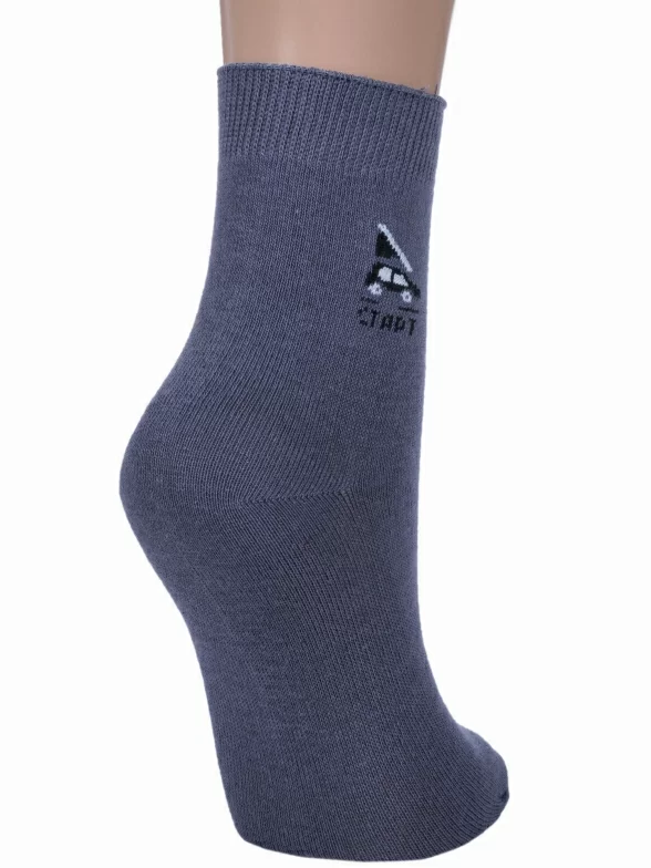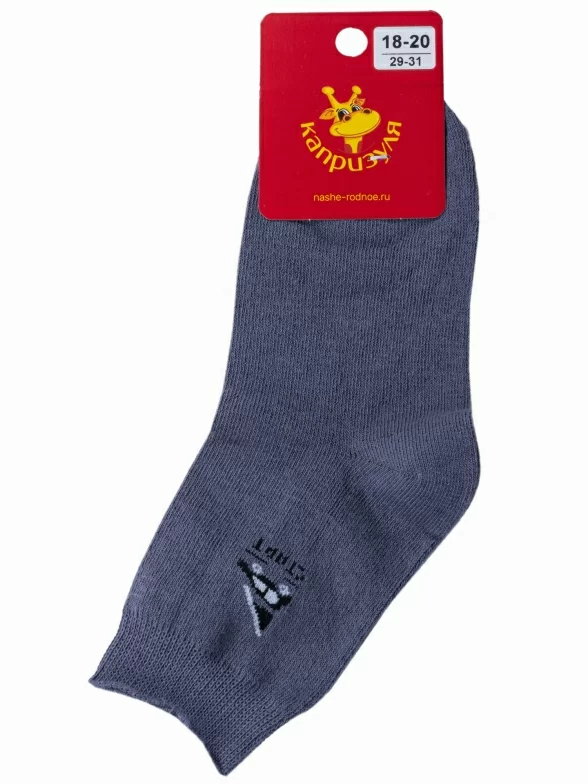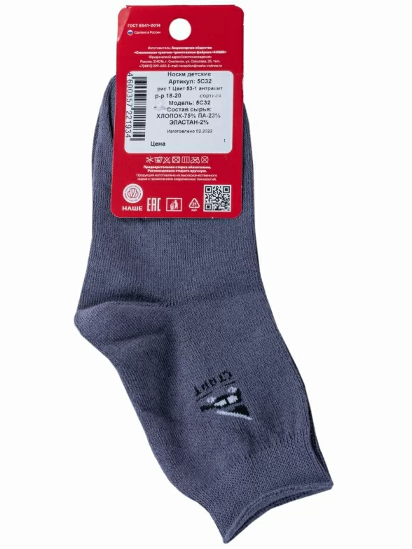Круглогодичные укороченные детские носки, цвет темно-серый, спортивные, повседневные, шов обычный (не бесшовные), принт (рисунок): небольшой рисунок, с узором, спортивные, состав: 75% хлопок, 23% полиамид, 2% эластан, арт. 5С32. Производитель «Смоленская чулочная фабрика, Россия» под брендом «Наше смоленской чулочной фабрики».
