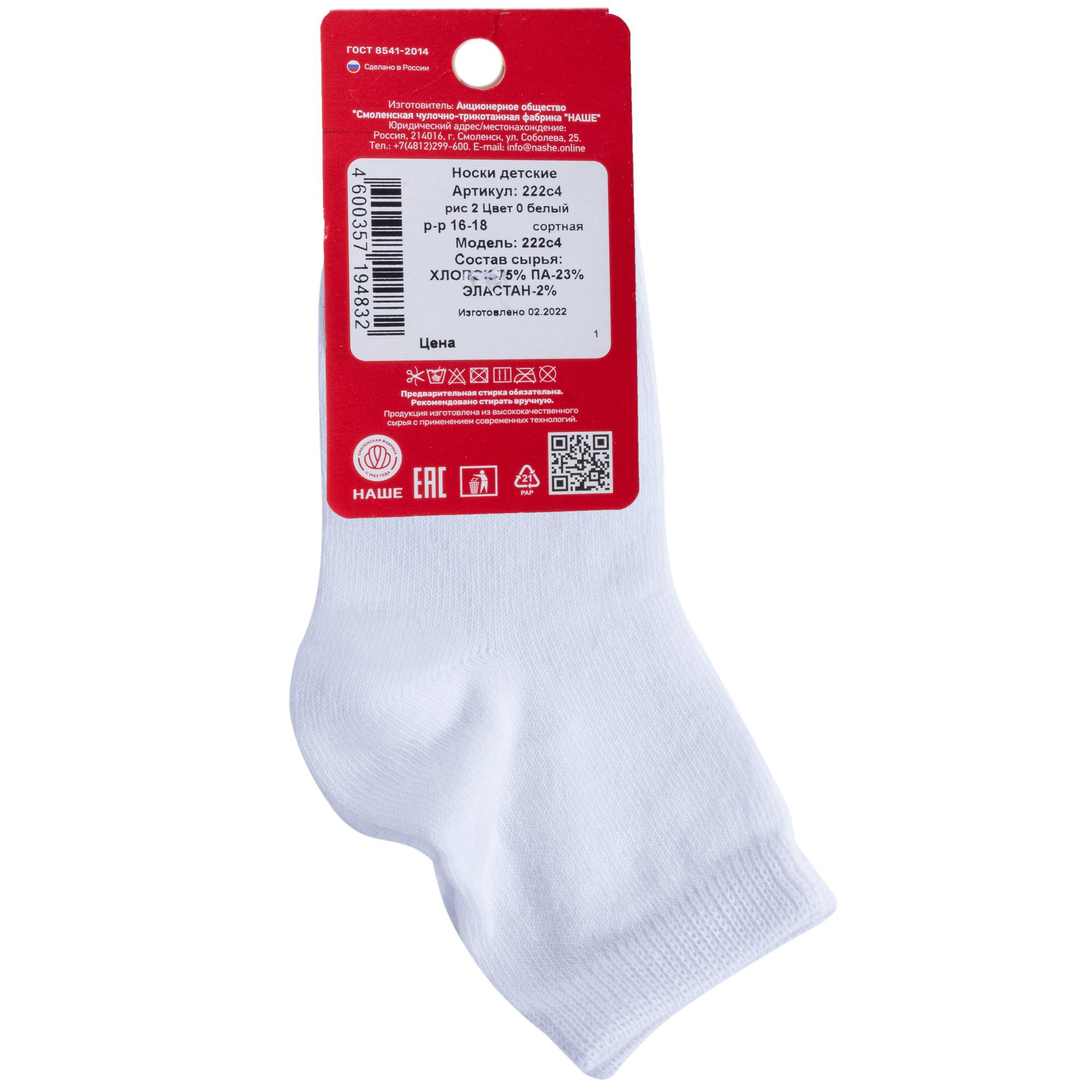 Круглогодичные укороченные детские носки, цвет белый, классические, шов обычный (не бесшовные), принт (рисунок): однотонный, без рисунков/узоров, состав: 75% хлопок, 23% полиамид, 2% эластан, арт. 222С4. Производитель «Смоленская чулочная фабрика, Россия» под брендом «Наше смоленской чулочной фабрики».