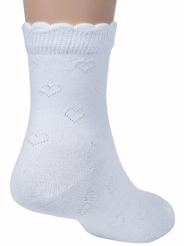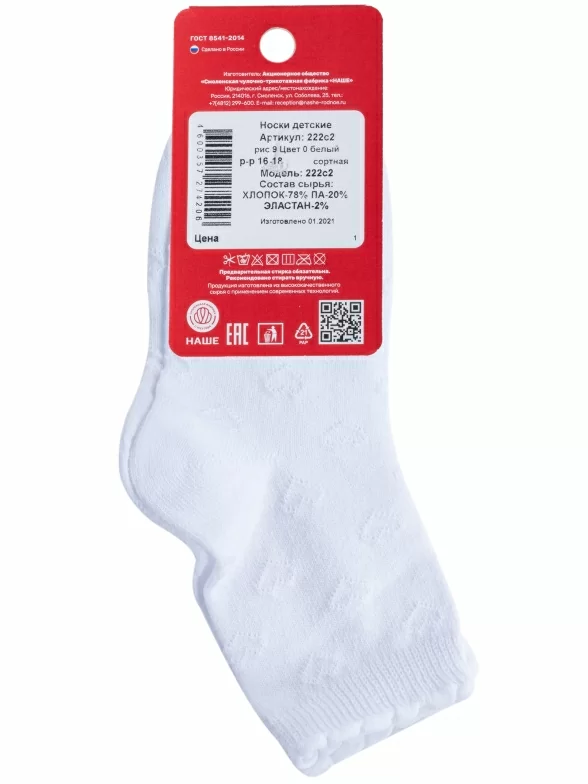 Летние укороченные детские носки, цвет белый, повседневные, шов обычный (не бесшовные), принт (рисунок): сердечки / поцелуи / любовь, с узором, однотонный, состав: 78% хлопок, 20% полиамид, 2% эластан, арт. 222С2. Производитель «Смоленская чулочная фабрика, Россия» под брендом «Наше смоленской чулочной фабрики».