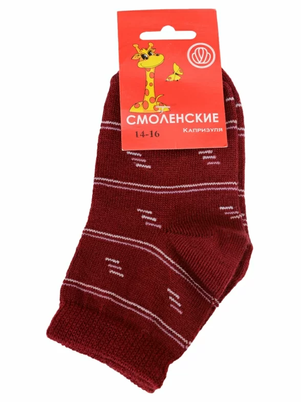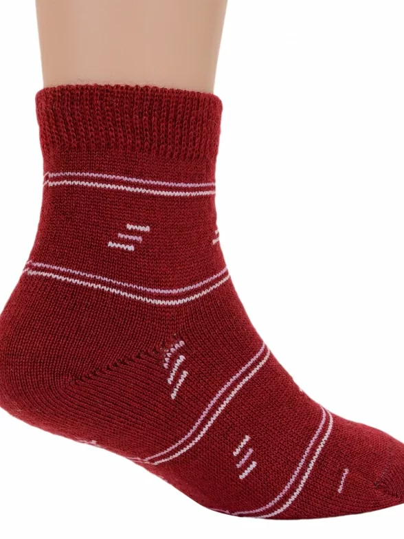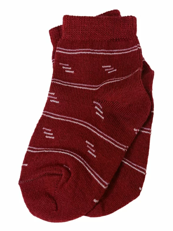 Зимние укороченные детские носки, цвет бордовый, классические, теплые, шов обычный (не бесшовные), принт (рисунок): полоски, с узором, состав: 80% полушерсть, 14% полиамид, 2% эластан, 4% полипропилен, арт. 236С2. Производитель «Смоленская чулочная фабрика, Россия» под брендом «Наше смоленской чулочной фабрики».