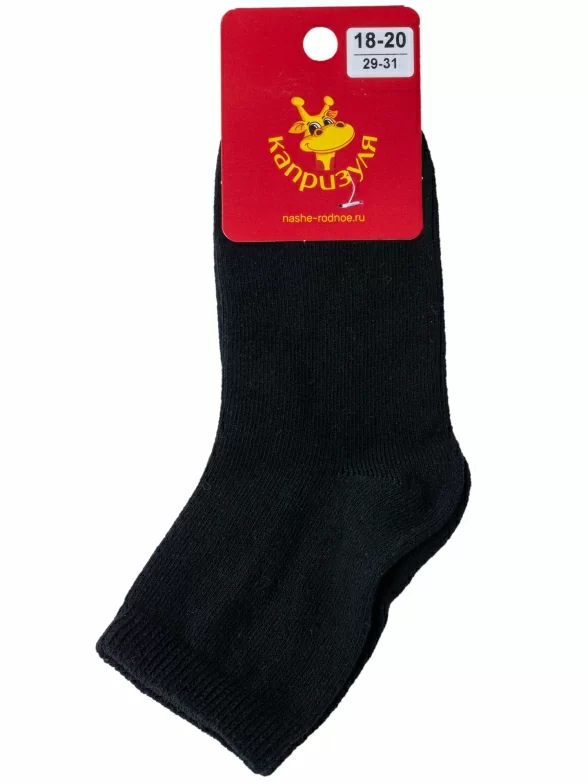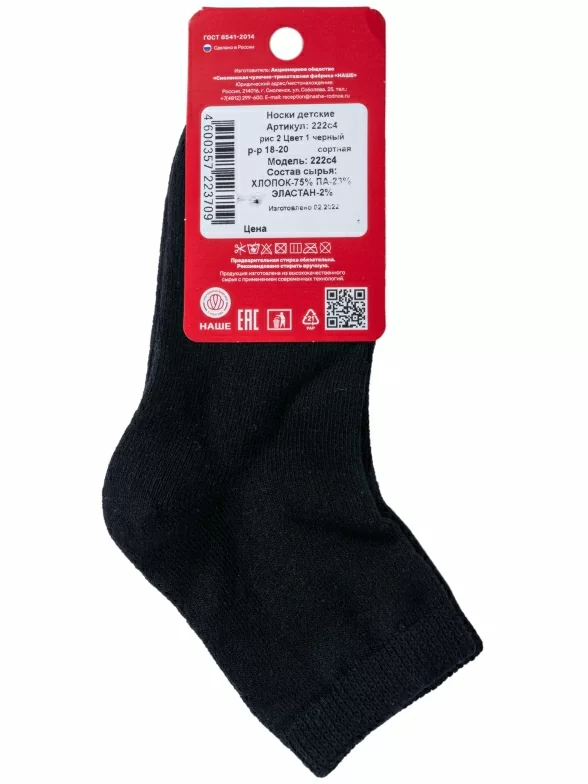 Круглогодичные укороченные детские носки, цвет черный, классические, шов обычный (не бесшовные), принт (рисунок): однотонный, без рисунков/узоров, состав: 75% хлопок, 23% полиамид, 2% эластан, арт. 222С4. Производитель «Смоленская чулочная фабрика, Россия» под брендом «Наше смоленской чулочной фабрики».