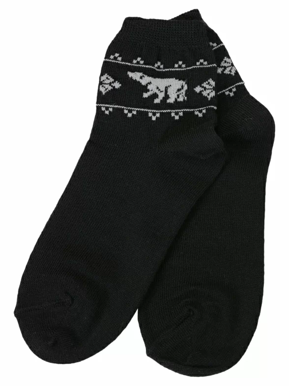 Зимние укороченные детские носки, цвет черный, классические, теплые, шов обычный (не бесшовные), принт (рисунок): норвежский жаккард, зимний, животные, с узором, орнамент, состав: 80% полушерсть, 14% полиамид, 2% эластан, 4% полипропилен, арт. 236С2. Производитель «Смоленская чулочная фабрика, Россия» под брендом «Наше смоленской чулочной фабрики».