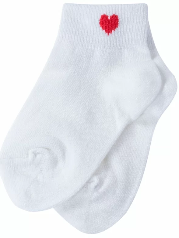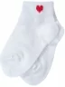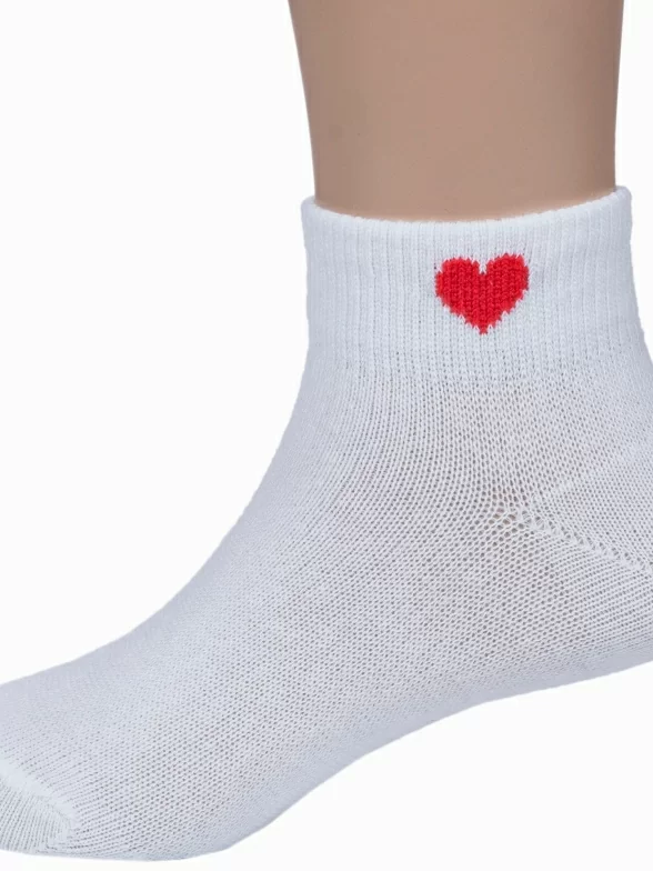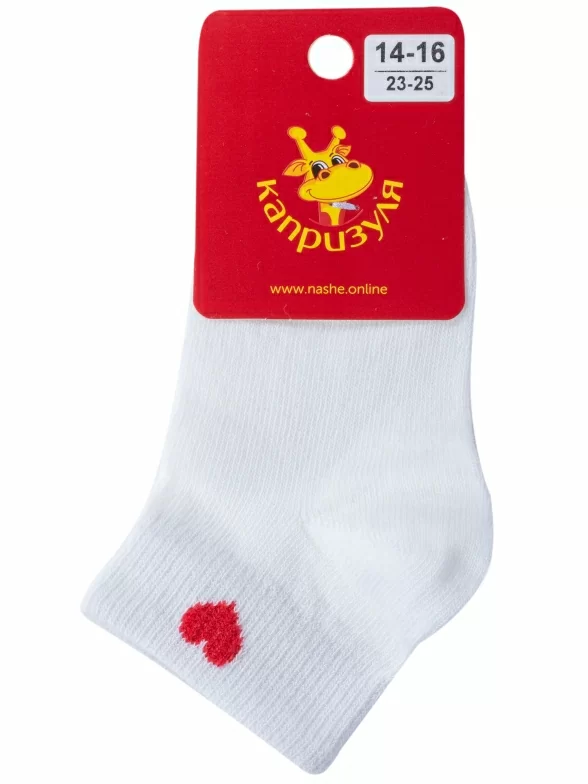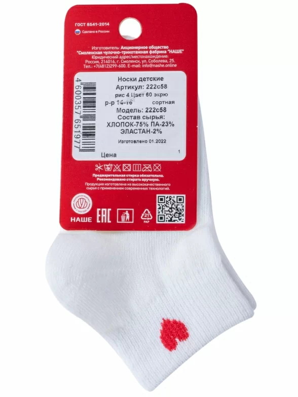 Круглогодичные короткие детские носки, цвет кремовый-белый, повседневные, шов обычный (не бесшовные), принт (рисунок): сердечки / поцелуи / любовь, однотонный, небольшой рисунок, состав: 75% хлопок, 23% полиамид, 2% эластан, арт. 222С58. Производитель «Смоленская чулочная фабрика, Россия» под брендом «Наше смоленской чулочной фабрики».