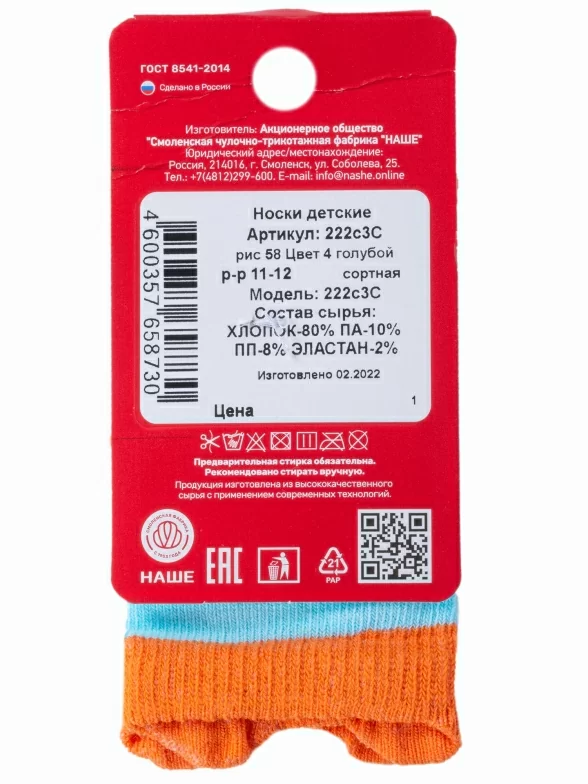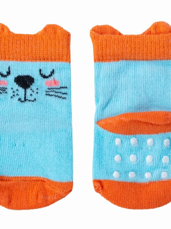 Круглогодичные укороченные детские носки, цвет многоцветные (мультиколор)-голубой, с нескользящей стопой, повседневные, шов обычный (не бесшовные), принт (рисунок): животные, с узором, состав: 80% хлопок, 10% полиамид, 8% полипропилен, 2% эластан, арт. 222С3С. Производитель «Смоленская чулочная фабрика, Россия» под брендом «Наше смоленской чулочной фабрики».