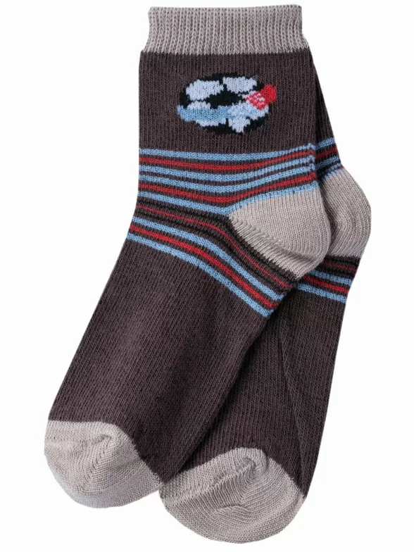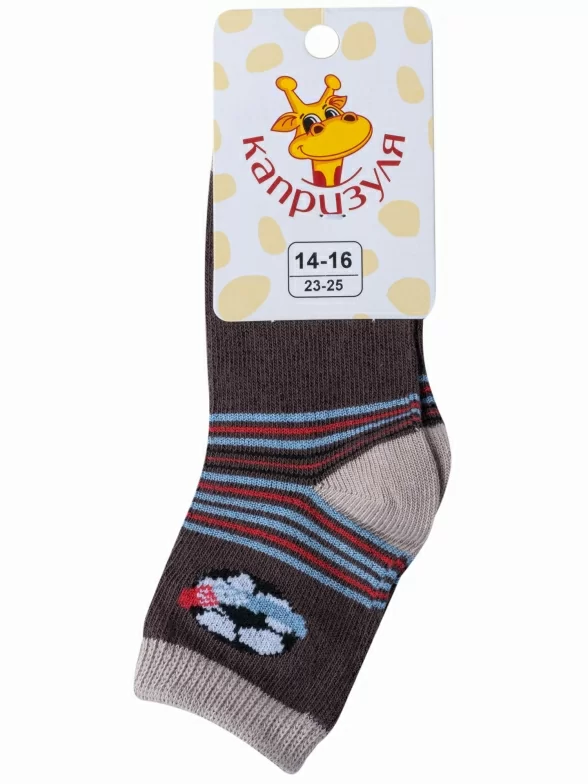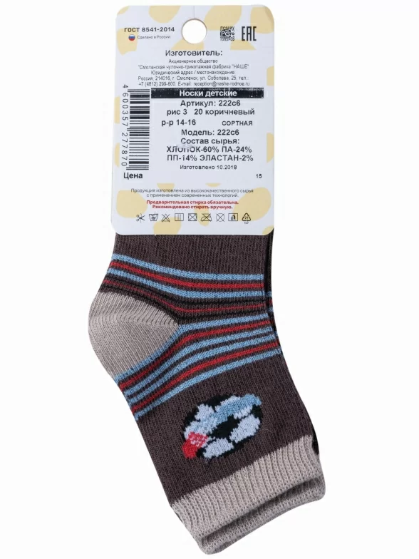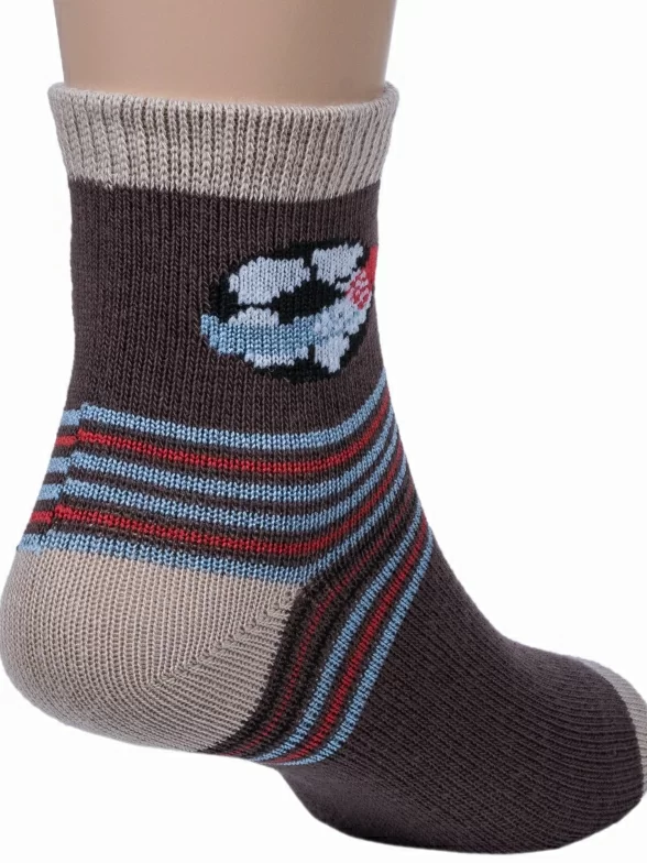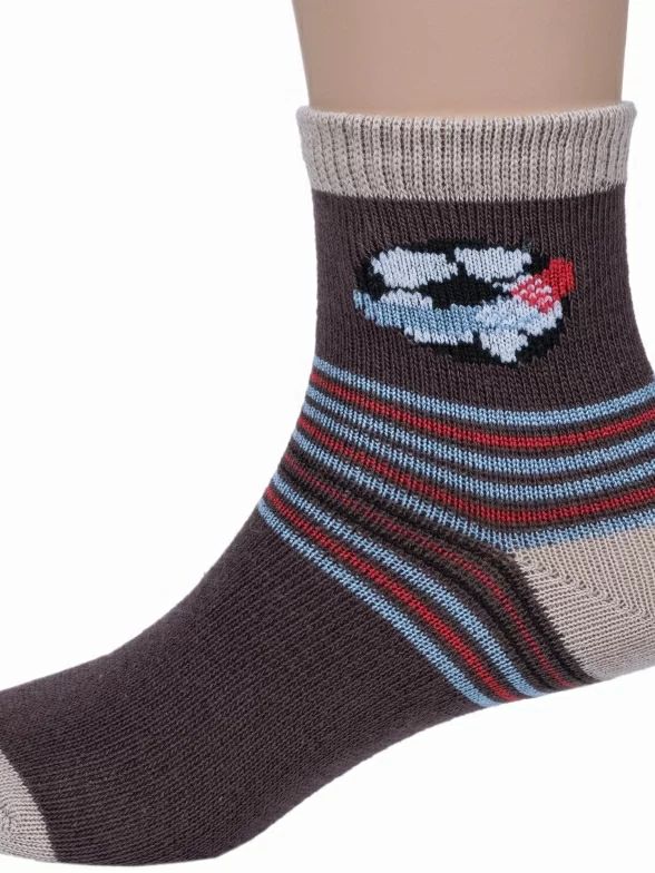 Круглогодичные укороченные детские носки, цвет коричневый, спортивные, повседневные, шов обычный (не бесшовные), принт (рисунок): спортивные, игры, с узором, состав: 60% хлопок, 24% полиамид, 14% полипропилен, 2% эластан, арт. 222С6. Производитель «Смоленская чулочная фабрика, Россия» под брендом «Наше смоленской чулочной фабрики».