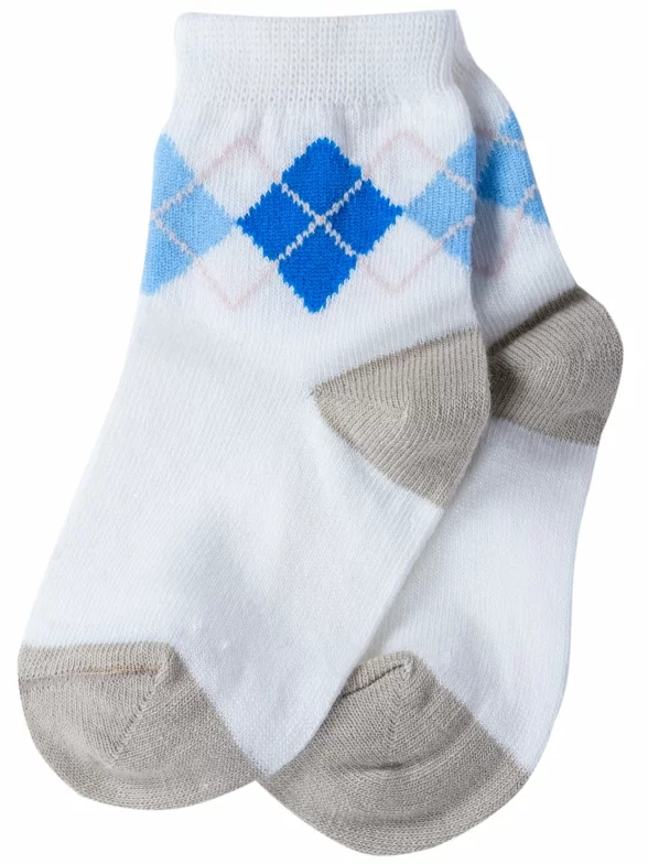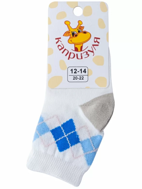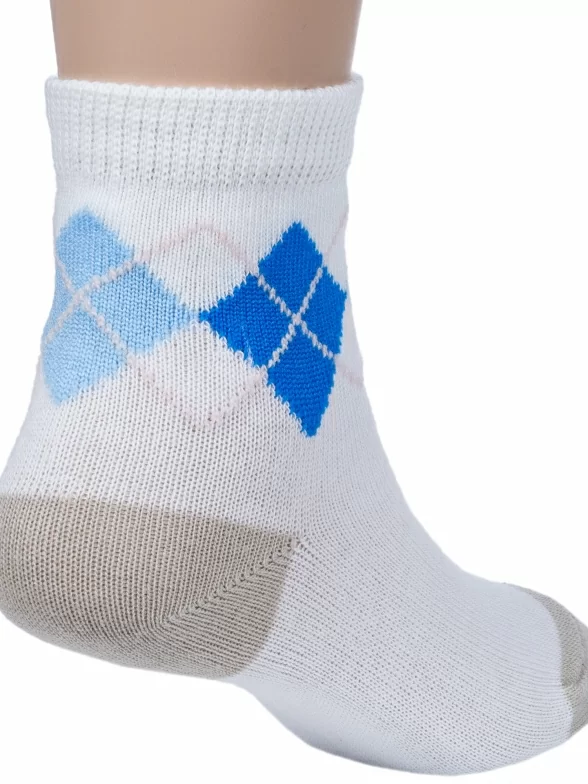 Круглогодичные укороченные детские носки, цвет кремовый-белый, классические, шов обычный (не бесшовные), принт (рисунок): геометрия, аргайл, с узором, состав: 68% хлопок, 20% полиамид, 10% полипропилен, 2% эластан, арт. 222С15. Производитель «Смоленская чулочная фабрика, Россия» под брендом «Наше смоленской чулочной фабрики».