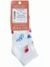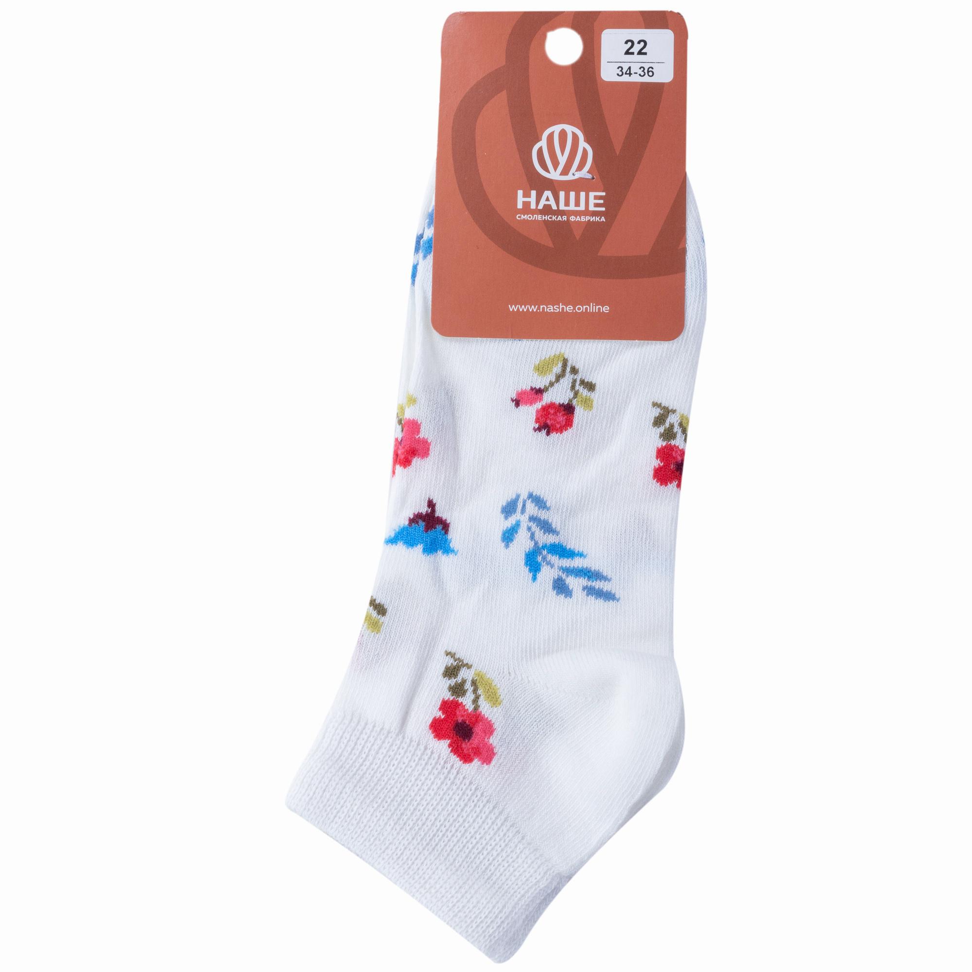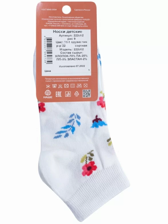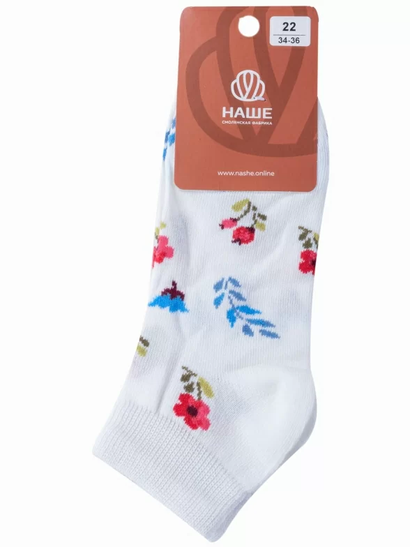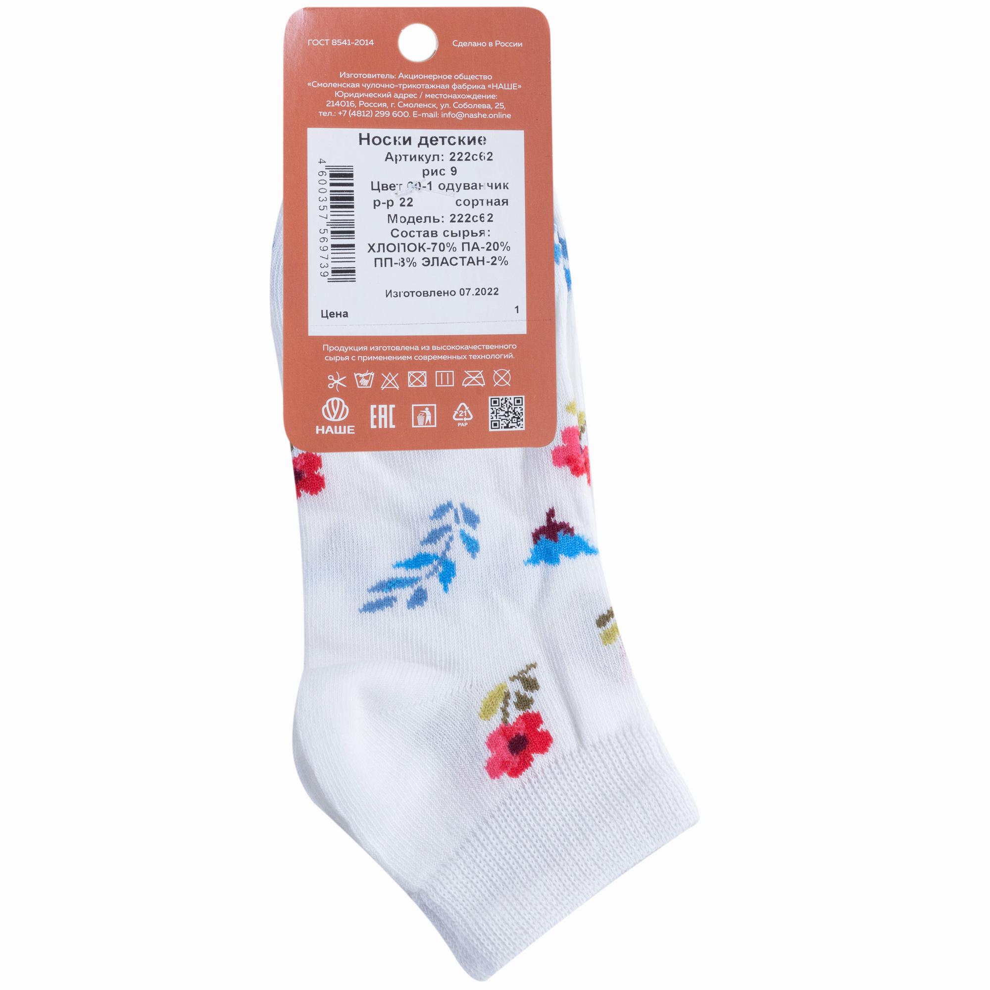 Круглогодичные короткие детские носки, цвет белый, повседневные, шов обычный (не бесшовные), принт (рисунок): цветы / растения, с узором, состав: 70% хлопок, 20% полиамид, 8% полипропилен, 2% эластан, арт. 222С62. Производитель «Смоленская чулочная фабрика, Россия» под брендом «Наше смоленской чулочной фабрики».