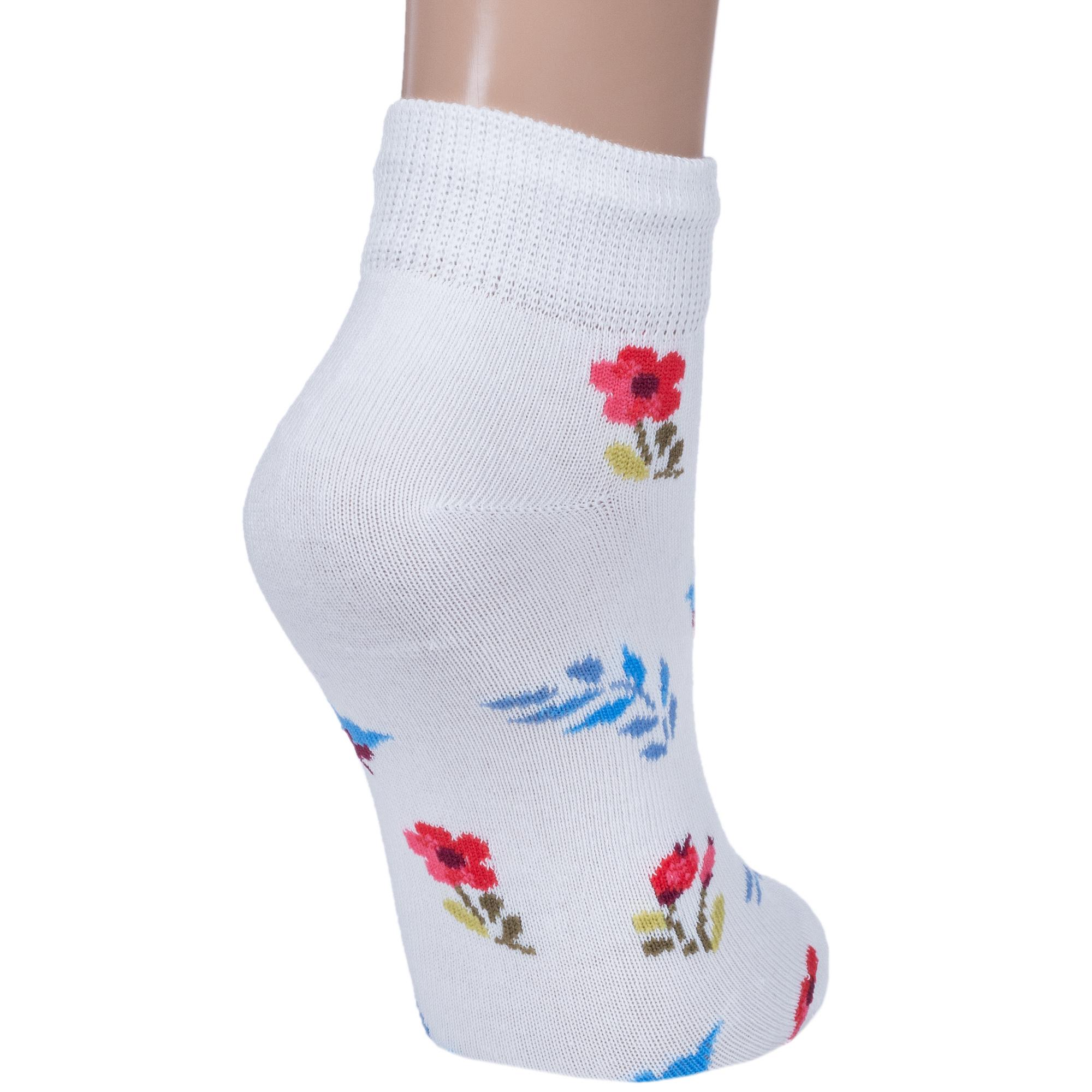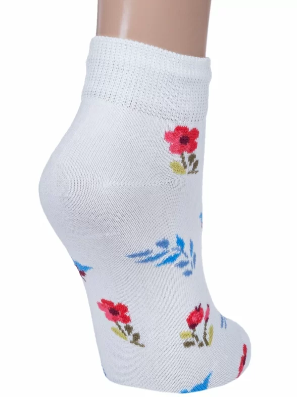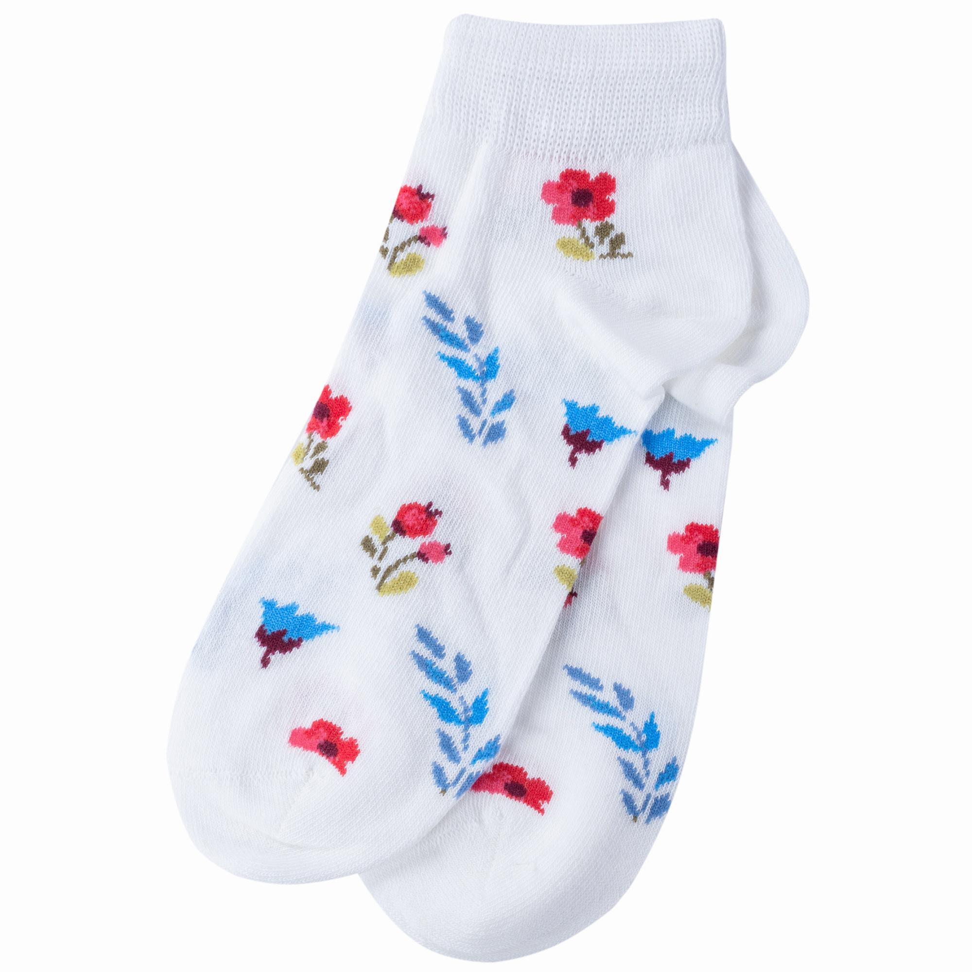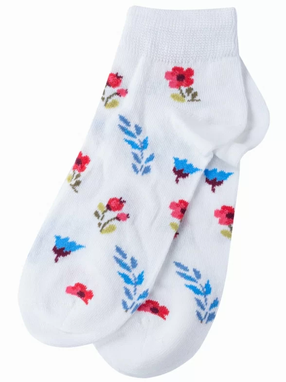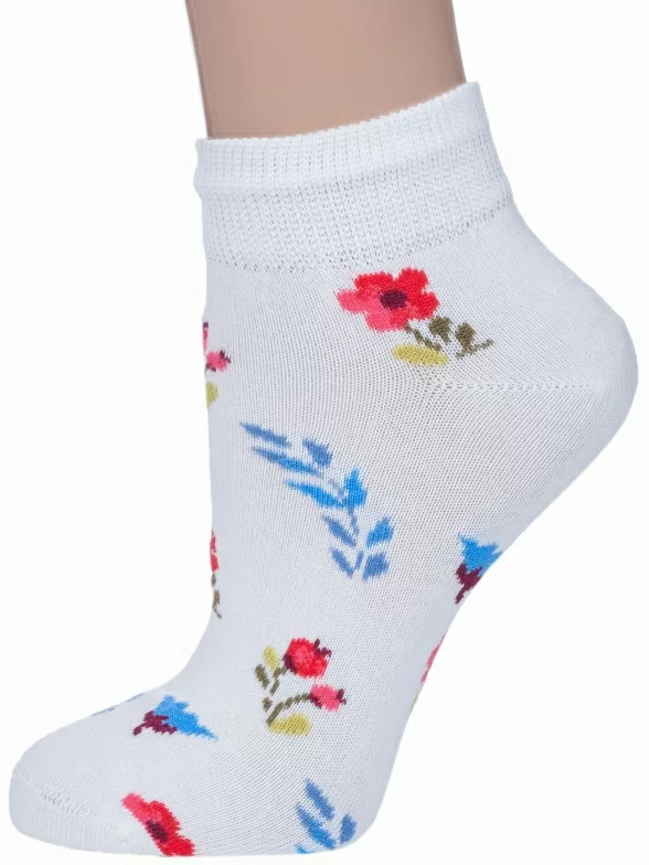 Круглогодичные короткие детские носки, цвет белый, повседневные, шов обычный (не бесшовные), принт (рисунок): цветы / растения, с узором, состав: 70% хлопок, 20% полиамид, 8% полипропилен, 2% эластан, арт. 222С62. Производитель «Смоленская чулочная фабрика, Россия» под брендом «Наше смоленской чулочной фабрики».