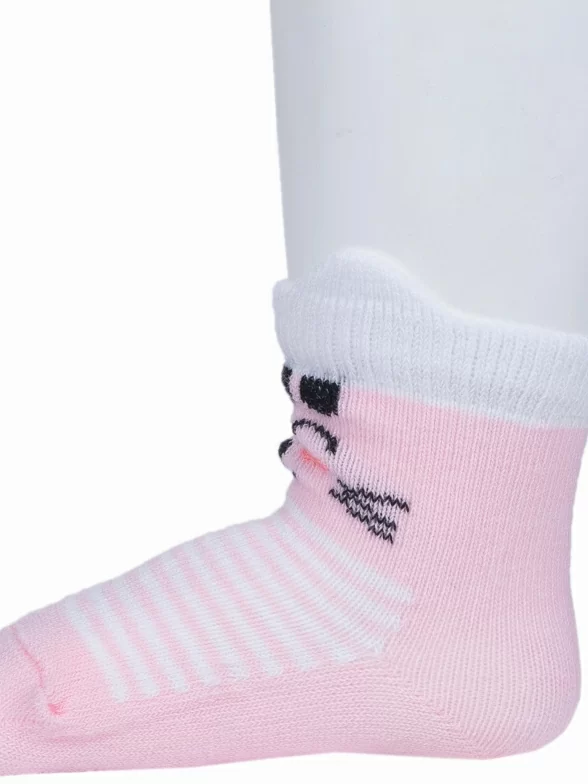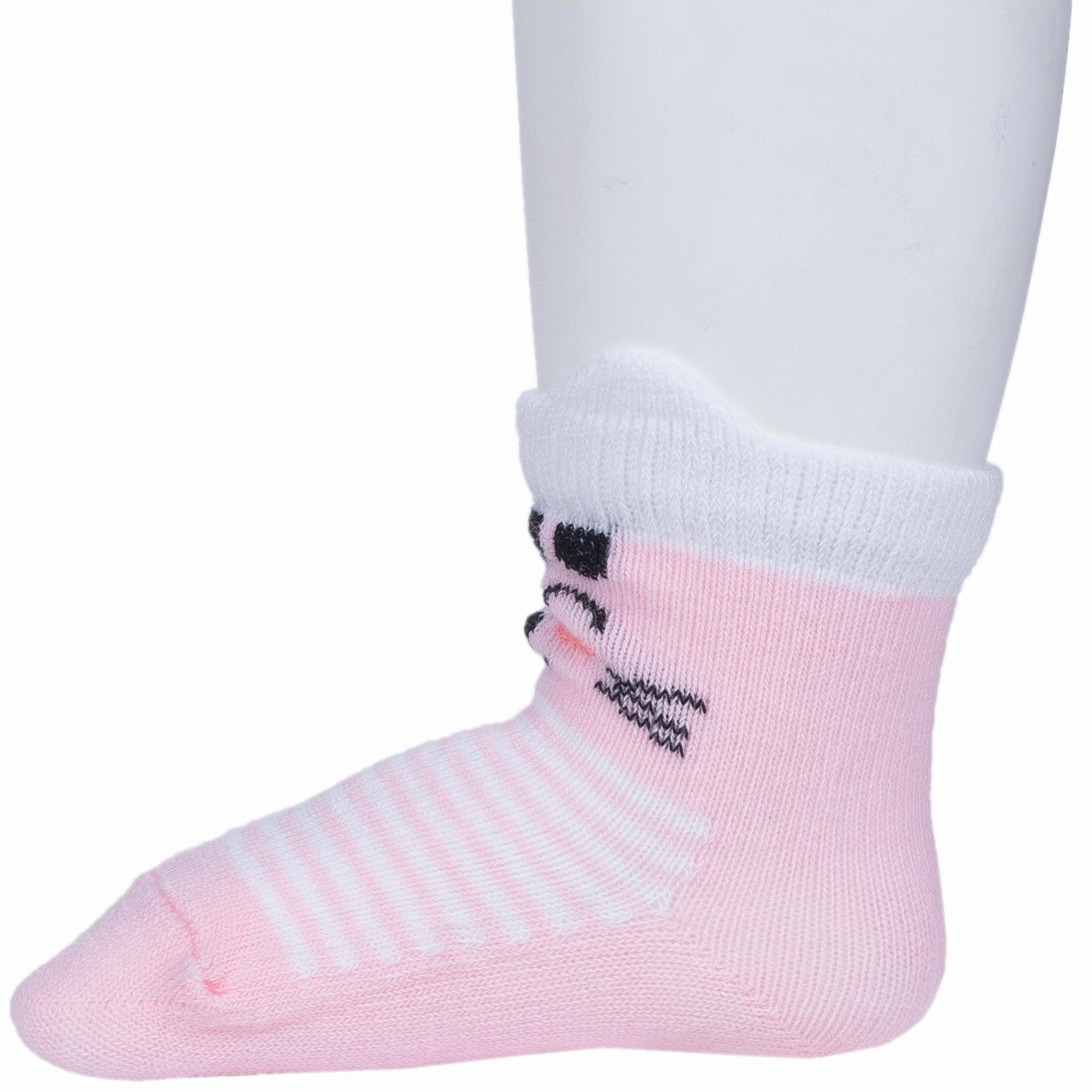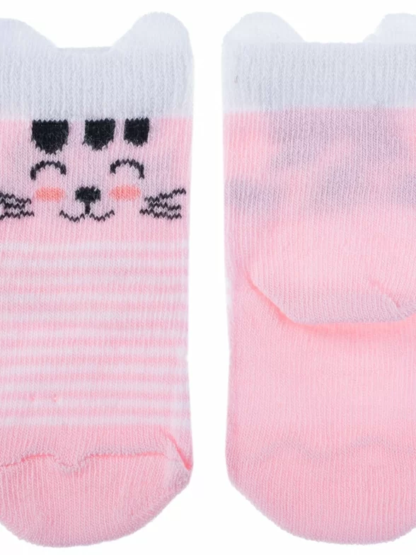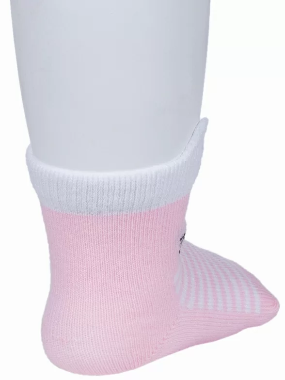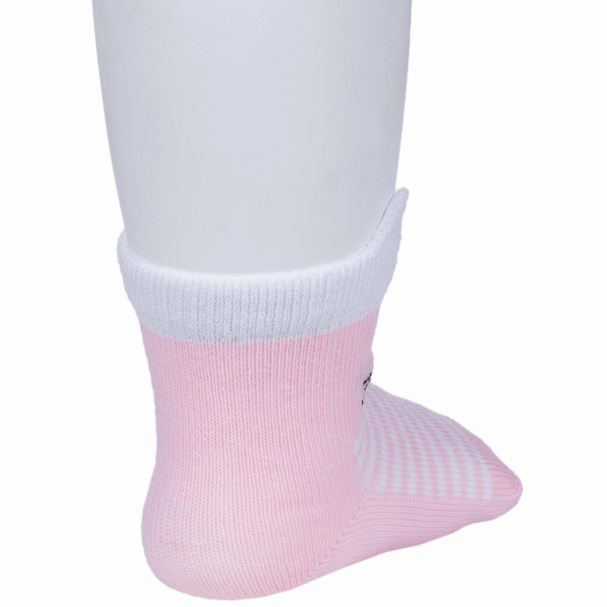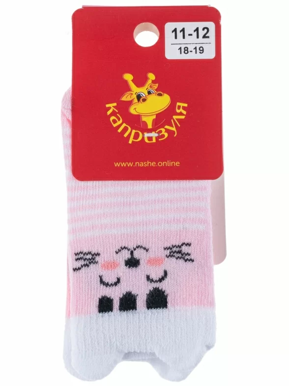 Круглогодичные или летние средней длины детские носки, цвет розовый-белый, необычные, повседневные, шов обычный (не бесшовные), принт (рисунок): полоски, животные, геометрия, небольшой рисунок, состав: 80% хлопок, 10% полиамид, 8% полипропилен, 2% эластан, арт. 222С3. Производитель «Смоленская чулочная фабрика, Россия» под брендом «Наше смоленской чулочной фабрики».