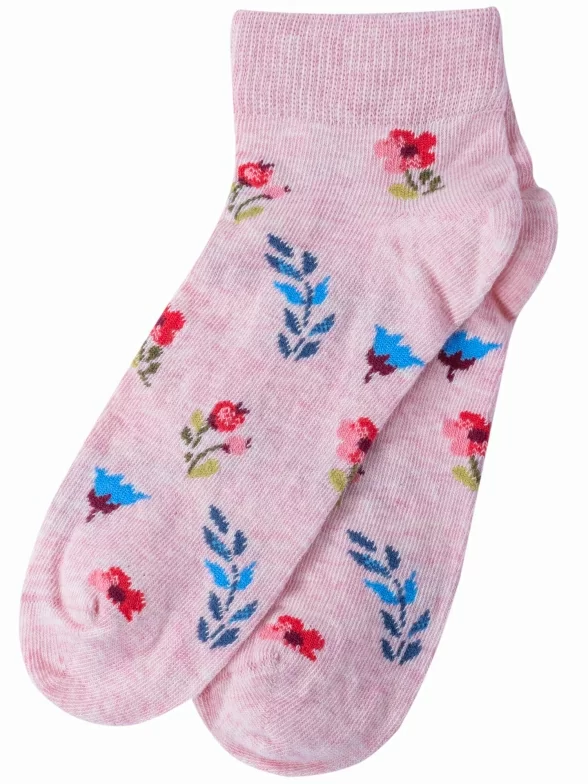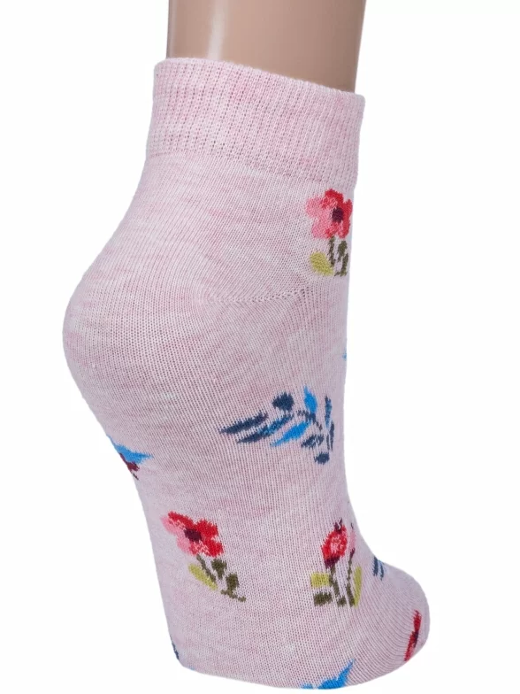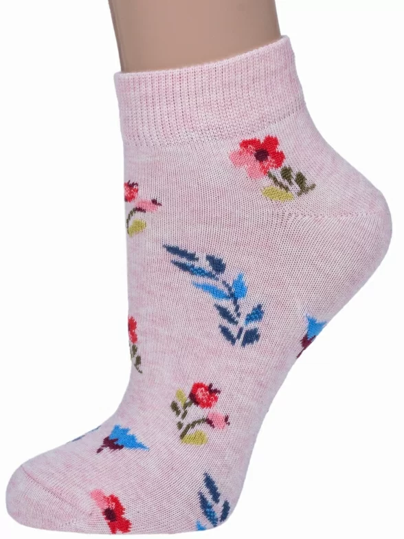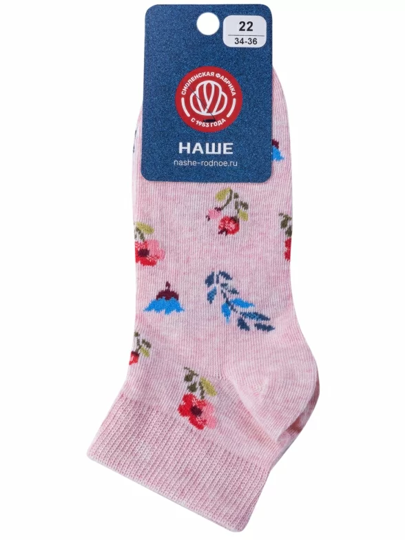 Круглогодичные короткие детские носки, цвет розовый-многоцветные (мультиколор), повседневные, шов обычный (не бесшовные), принт (рисунок): цветы / растения, с узором, состав: 70% хлопок, 20% полиамид, 8% полипропилен, 2% эластан, арт. 222С62. Производитель «Смоленская чулочная фабрика, Россия» под брендом «Наше смоленской чулочной фабрики».