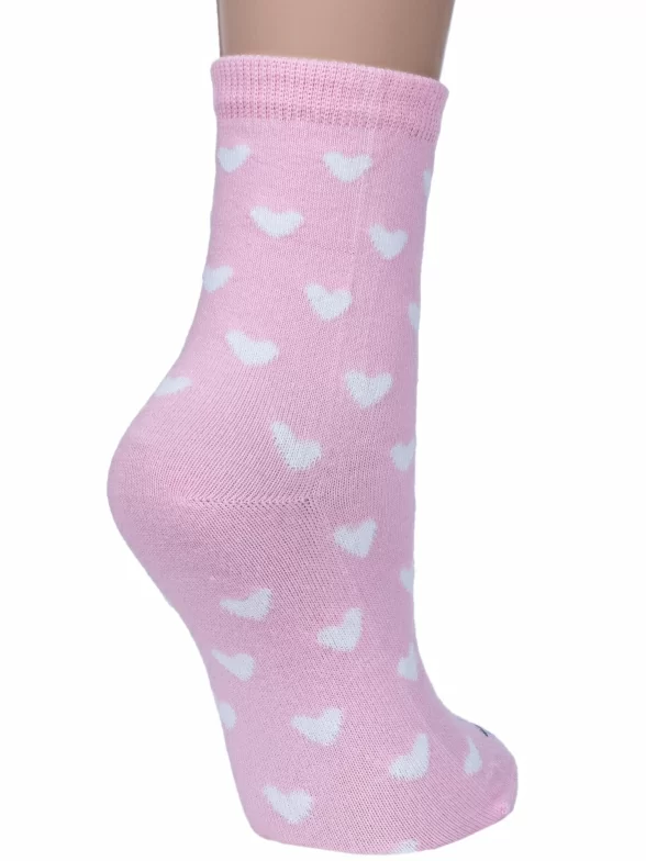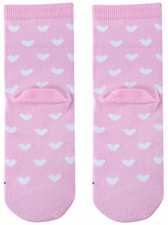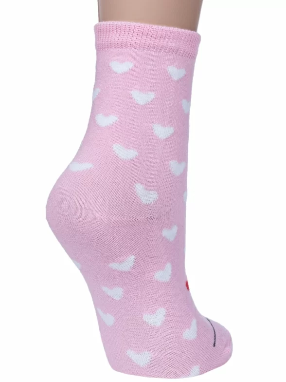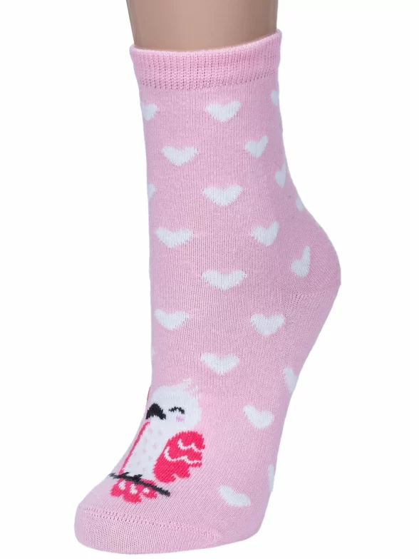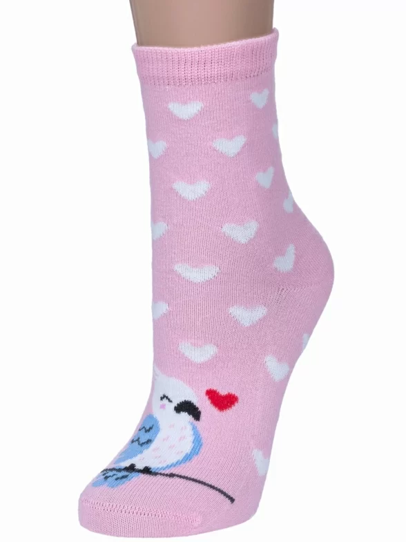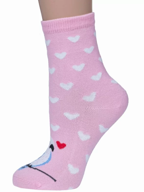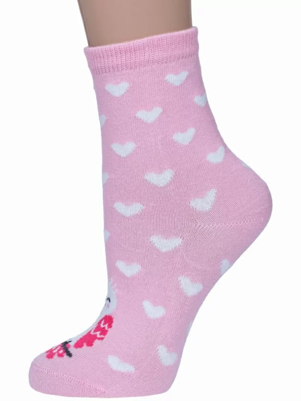 Летние или круглогодичные средней длины детские носки, цвет розовый-белый, необычные, повседневные, шов обычный (не бесшовные), принт (рисунок): сердечки / поцелуи / любовь, животные, крупные контрастные рисунки, состав: 70% хлопок, 20% полиамид, 8% полипропилен, 2% эластан, арт. 222С31. Производитель «Смоленская чулочная фабрика, Россия» под брендом «Наше смоленской чулочной фабрики».