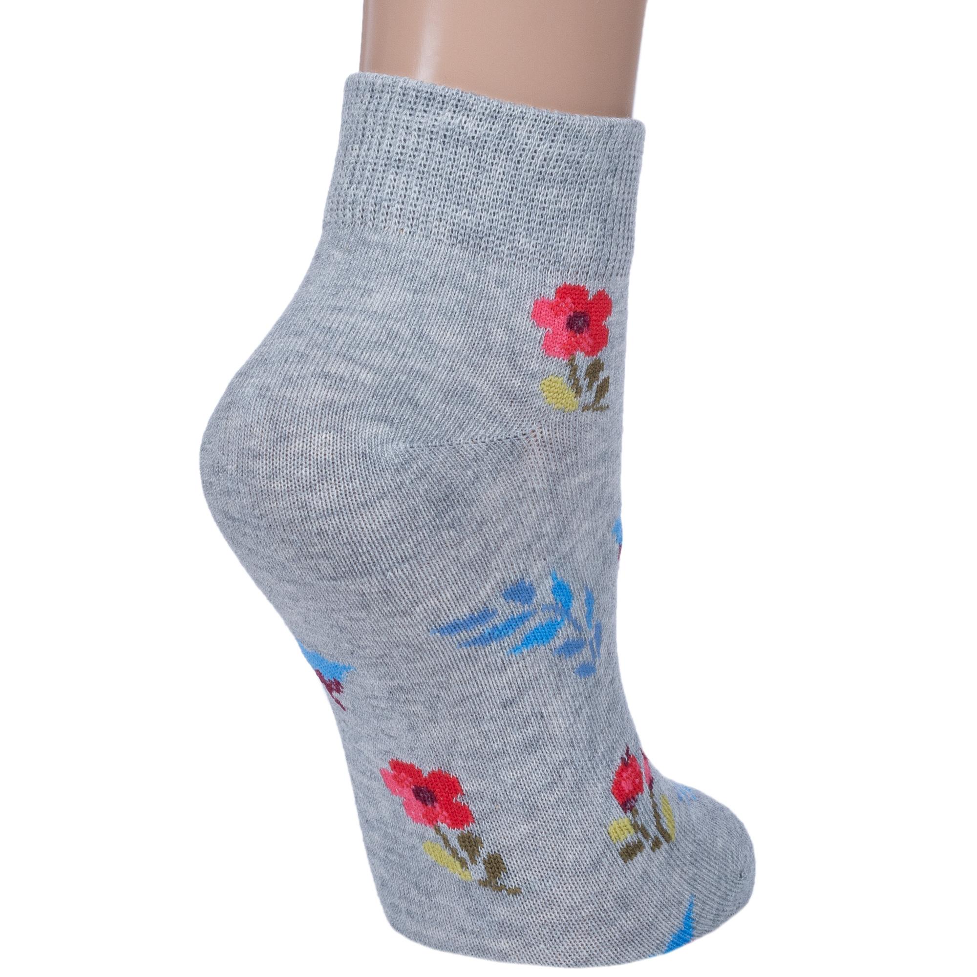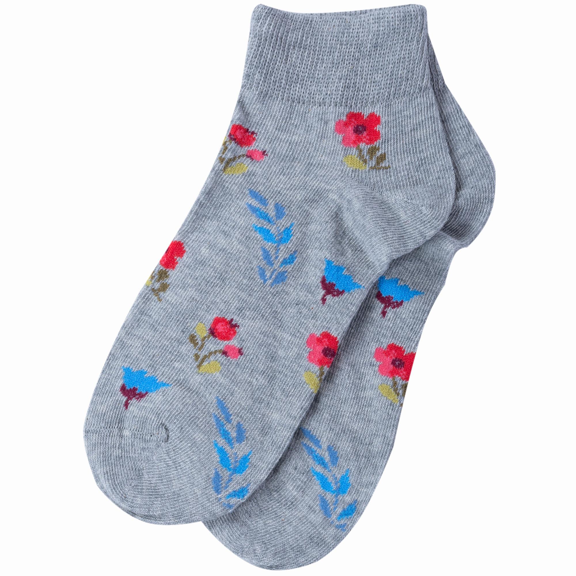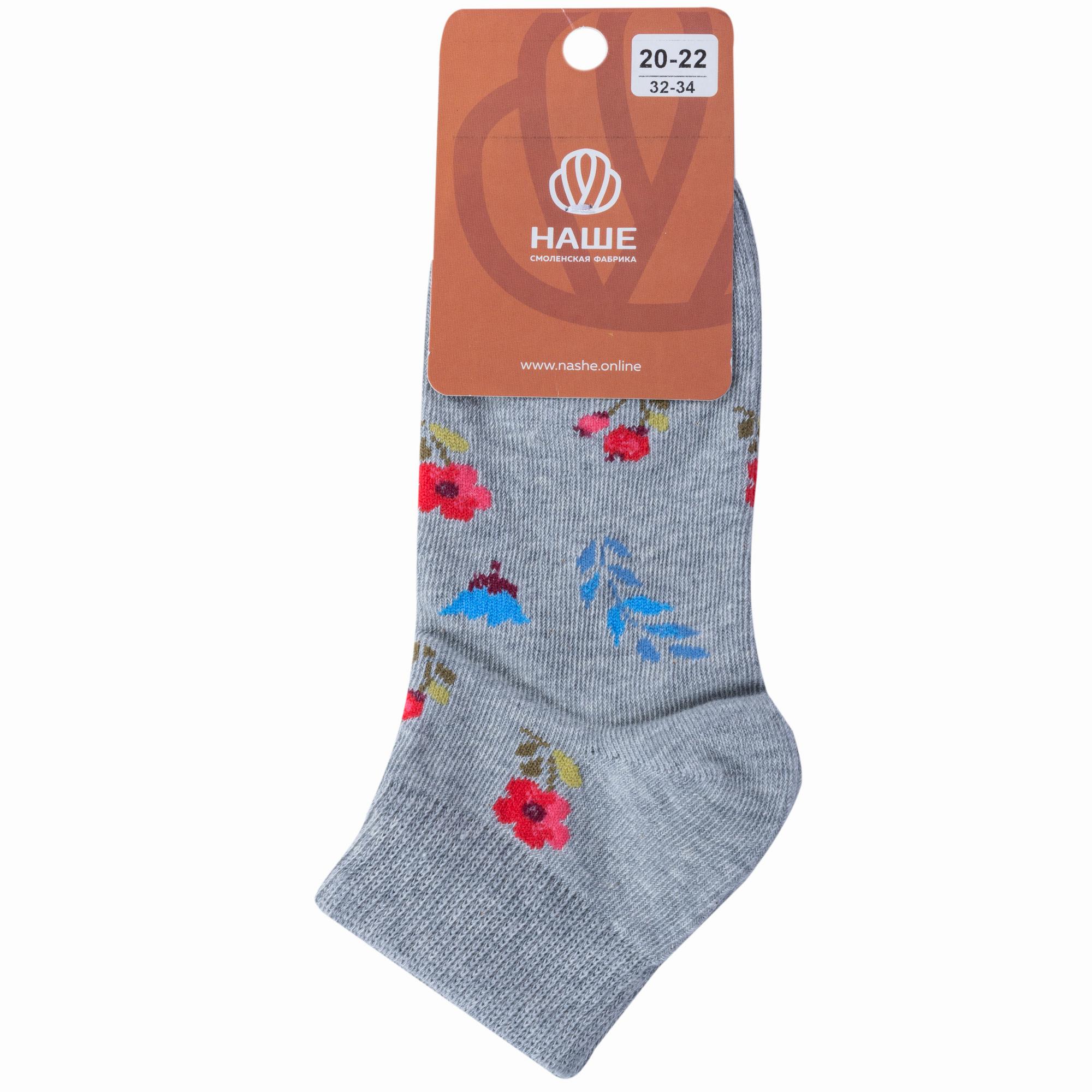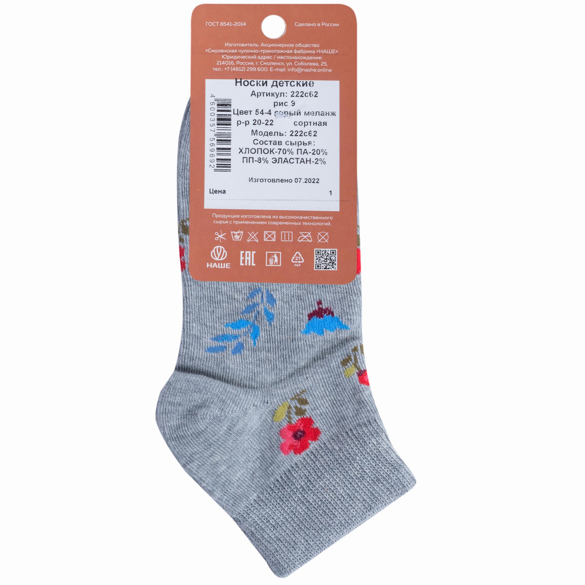 Круглогодичные короткие детские носки, цвет серый, повседневные, шов обычный (не бесшовные), принт (рисунок): цветы / растения, с узором, состав: 70% хлопок, 20% полиамид, 8% полипропилен, 2% эластан, арт. 222С62. Производитель «Смоленская чулочная фабрика, Россия» под брендом «Наше смоленской чулочной фабрики».