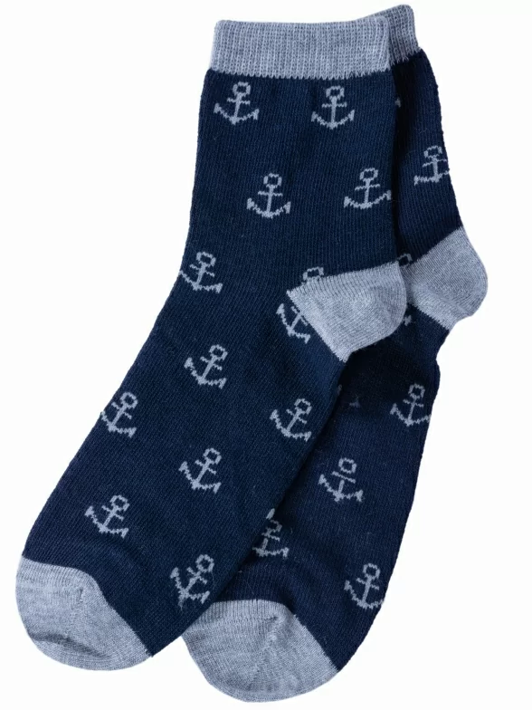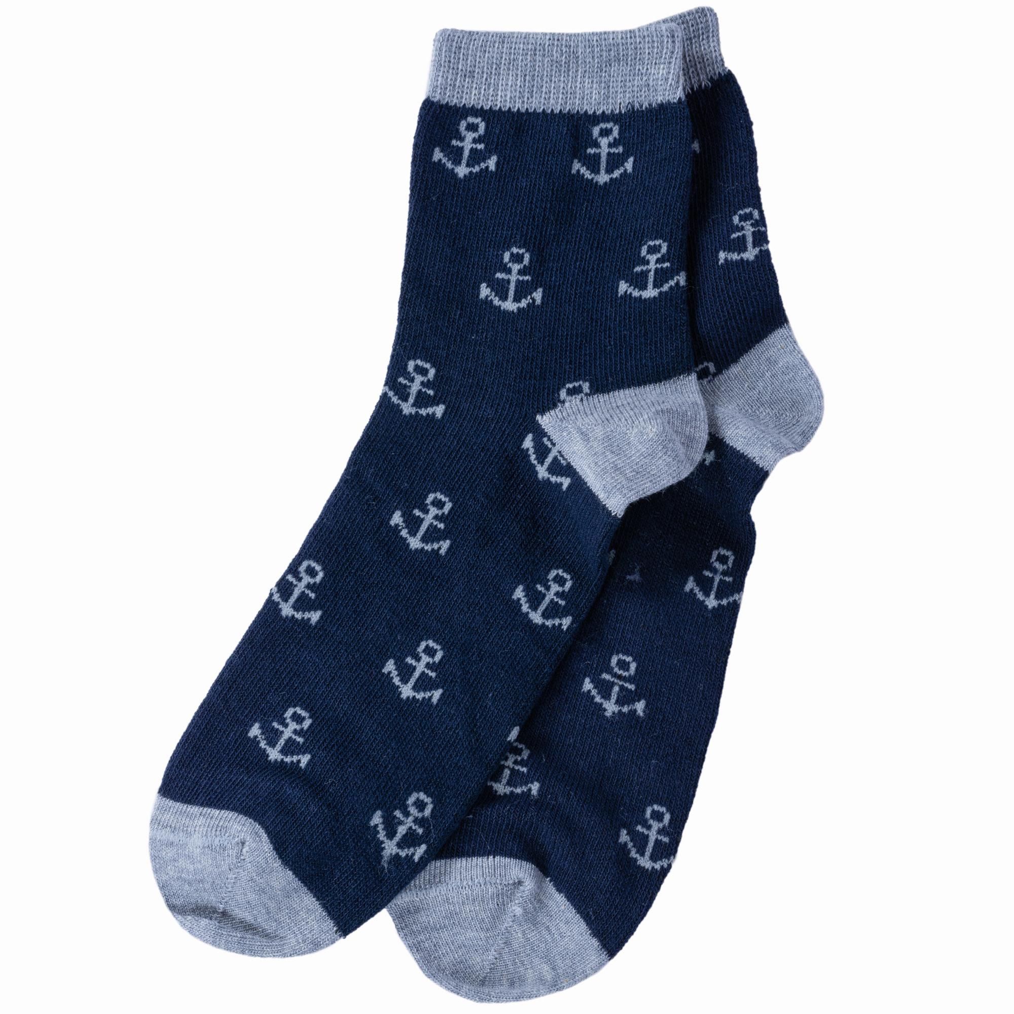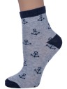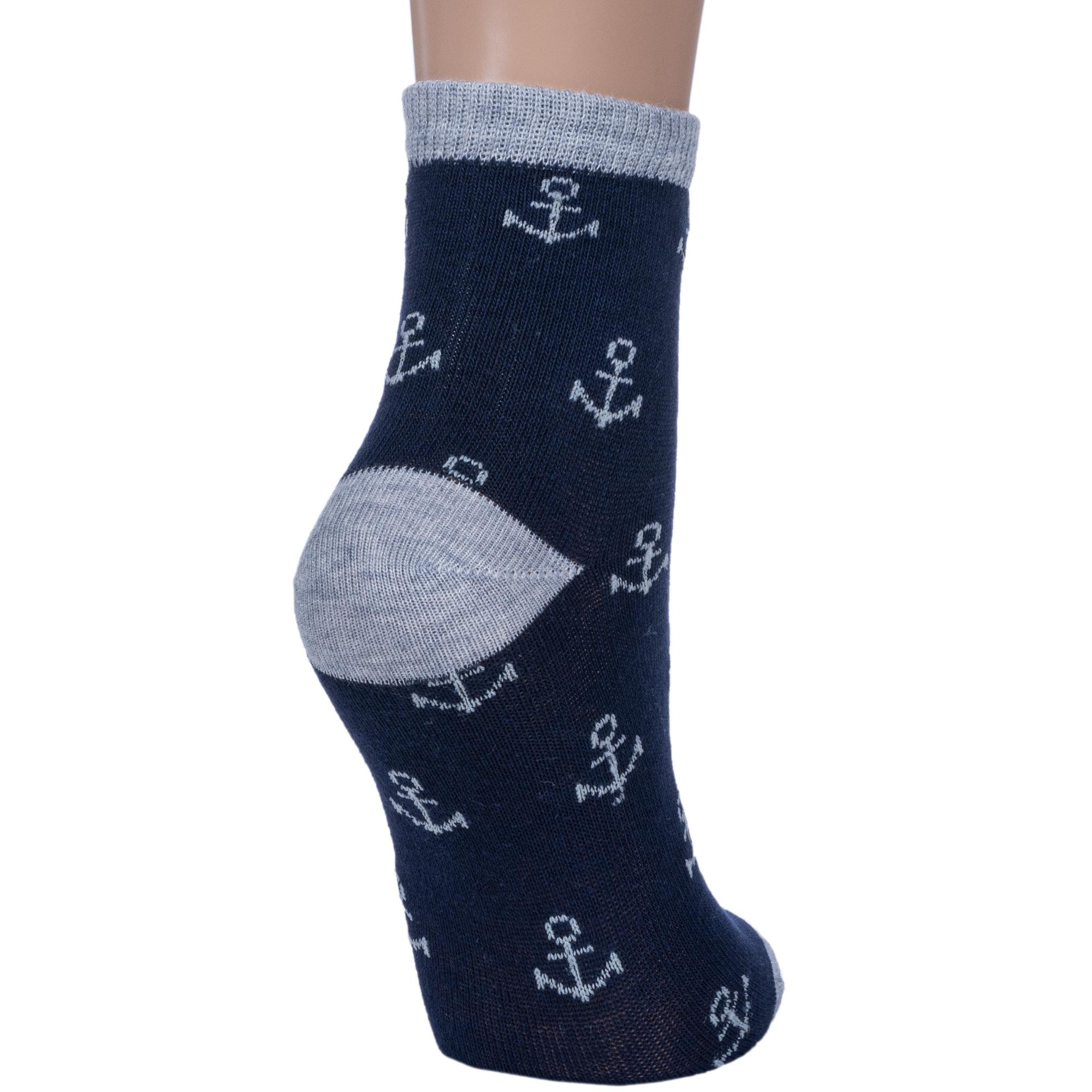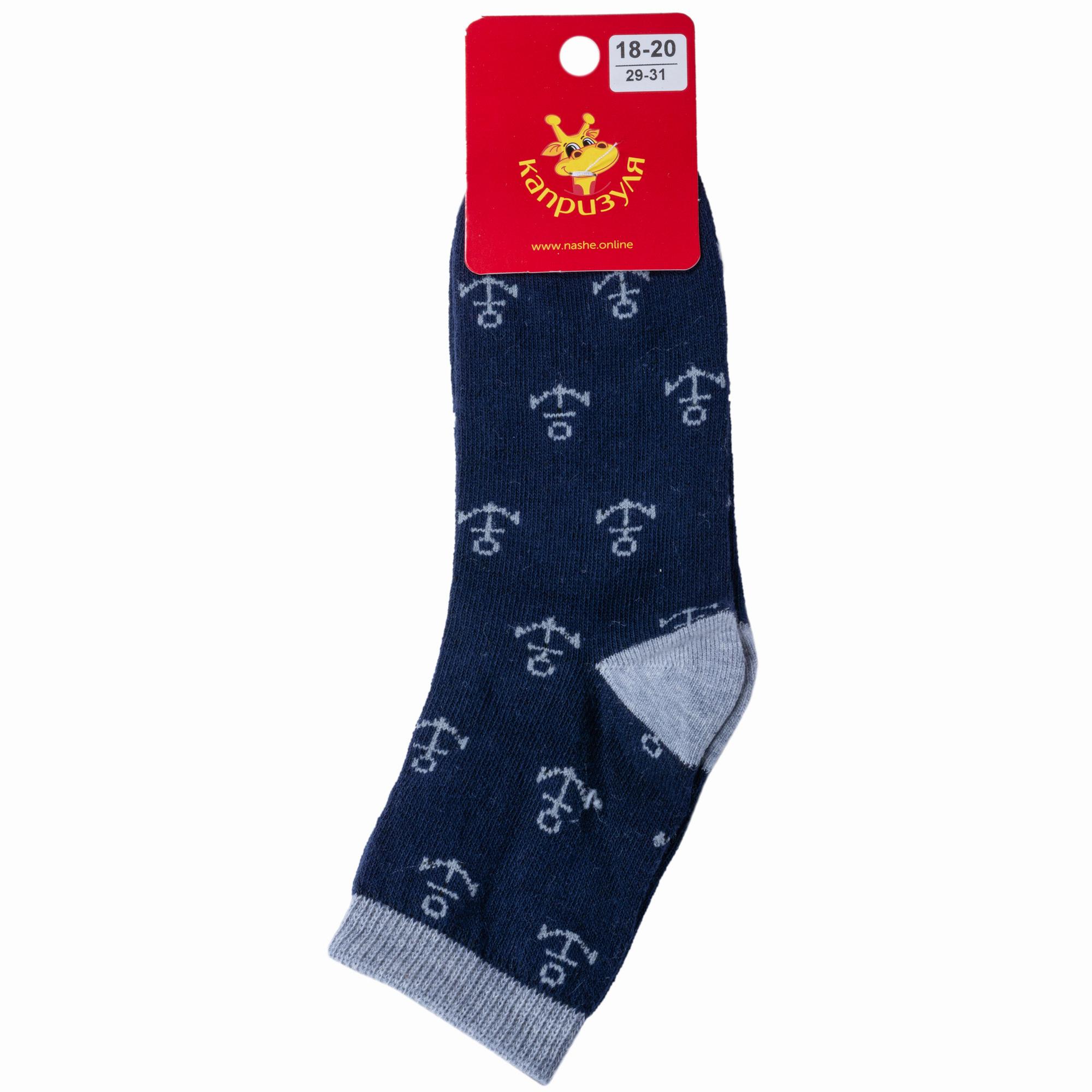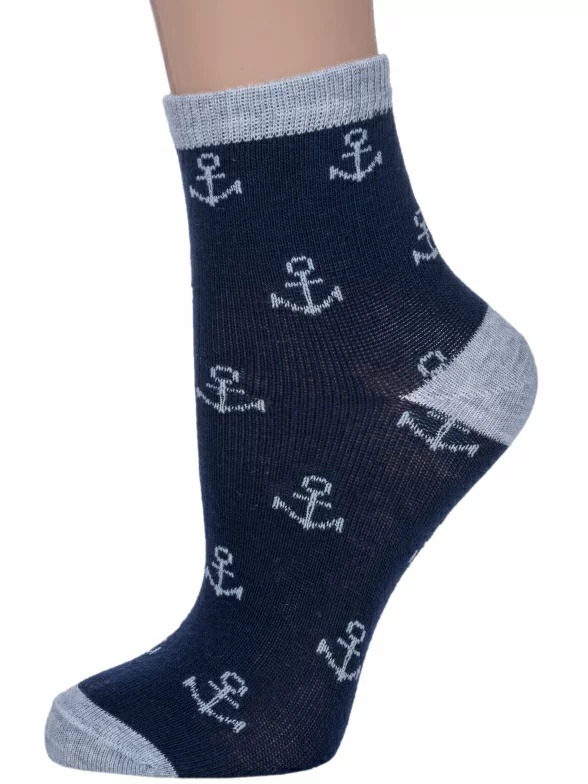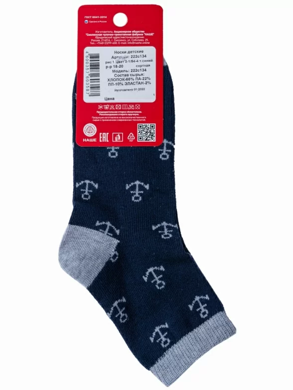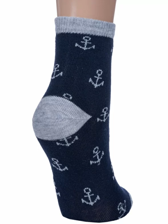 Круглогодичные или летние укороченные детские носки, цвет темно-синий, повседневные, шов обычный (не бесшовные), принт (рисунок): море, с узором, состав: 66% хлопок, 22% полиамид, 10% полипропилен, 2% эластан, арт. 222С134. Производитель «Смоленская чулочная фабрика, Россия» под брендом «Наше смоленской чулочной фабрики».