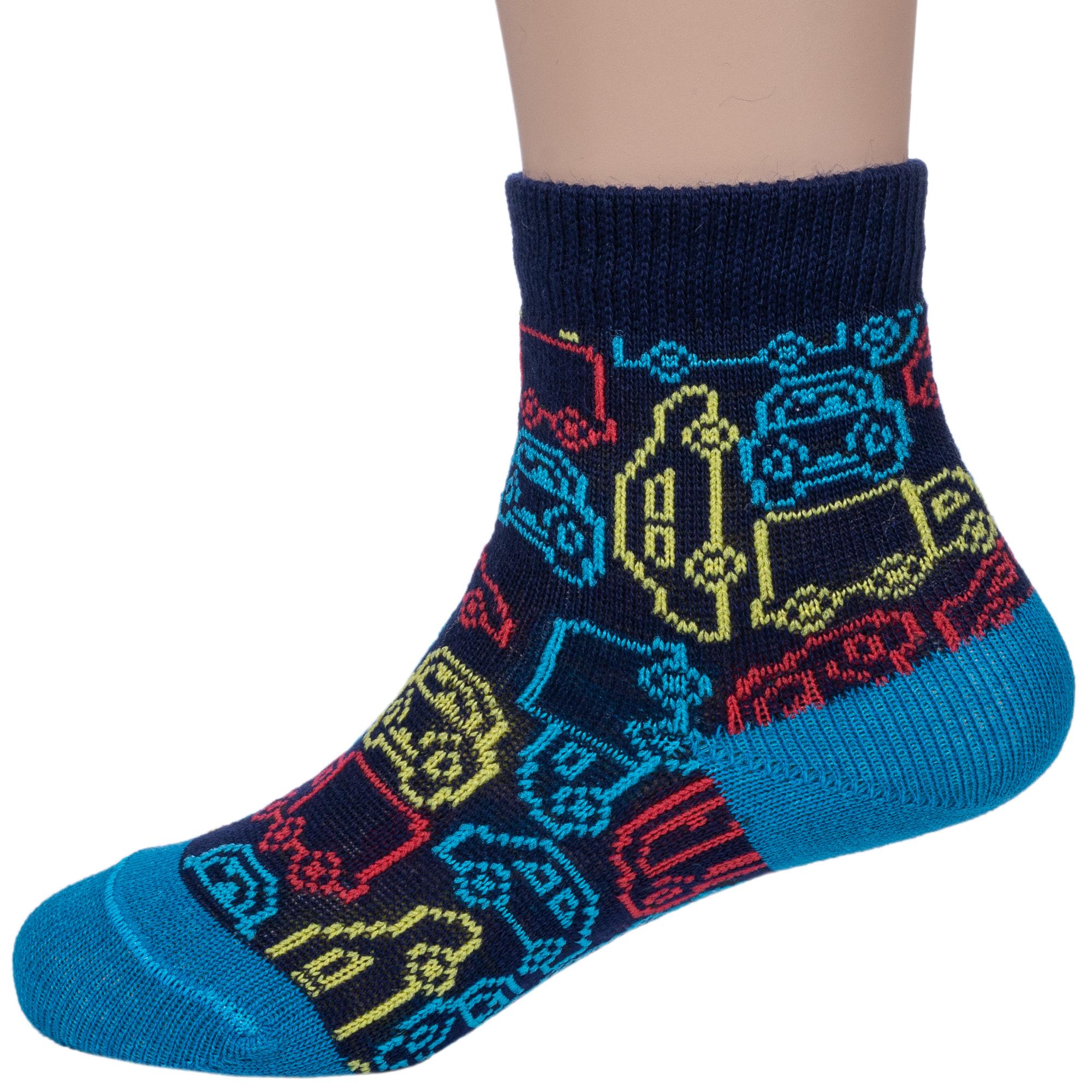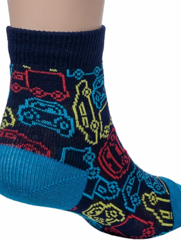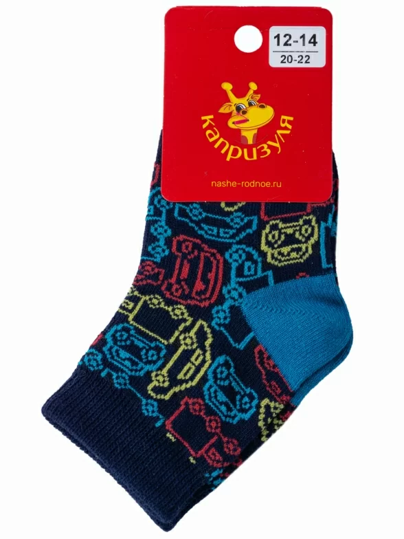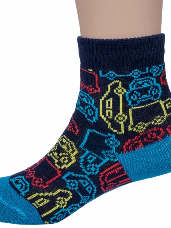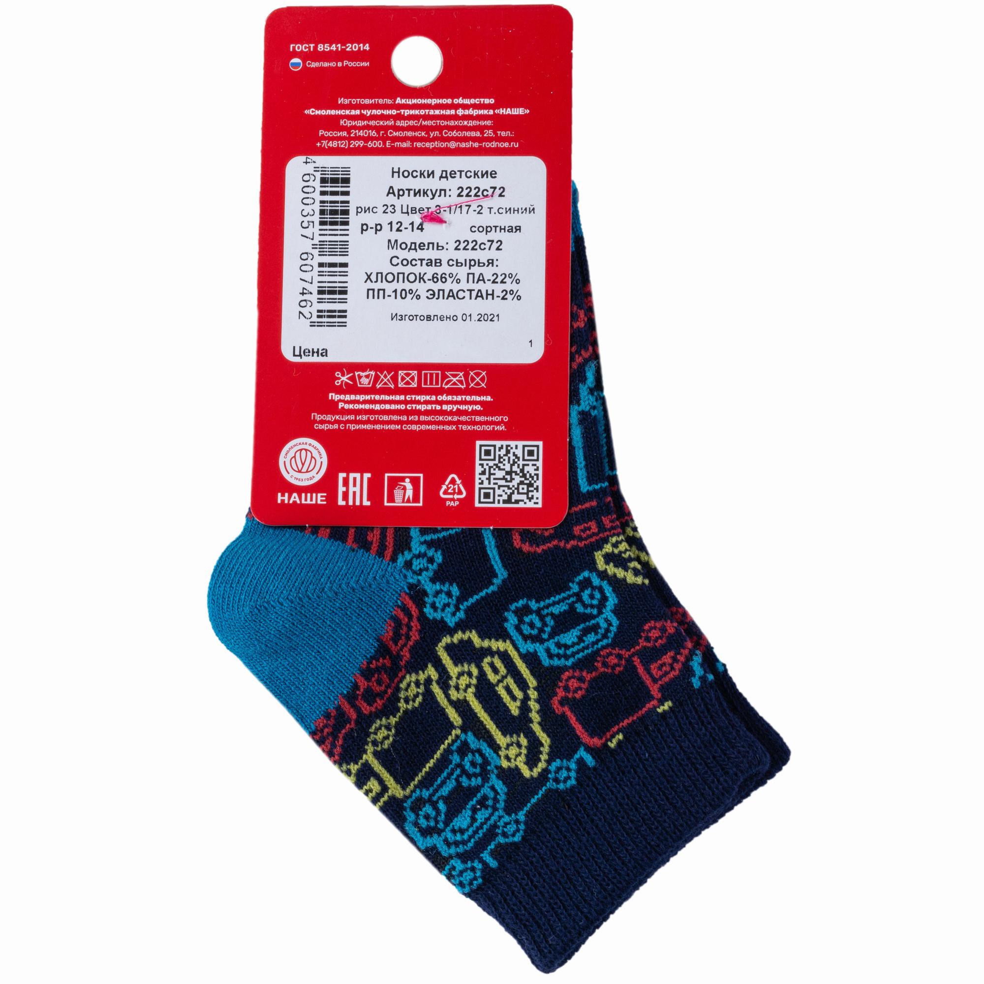 Круглогодичные укороченные детские носки, цвет темно-синий, повседневные, шов обычный (не бесшовные), принт (рисунок): транспорт, с узором, крупные контрастные рисунки, состав: 66% хлопок, 22% полиамид, 10% полипропилен, 2% эластан, арт. 222С72. Производитель «Смоленская чулочная фабрика, Россия» под брендом «Наше смоленской чулочной фабрики».