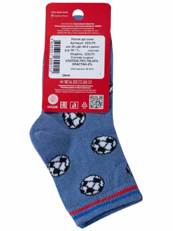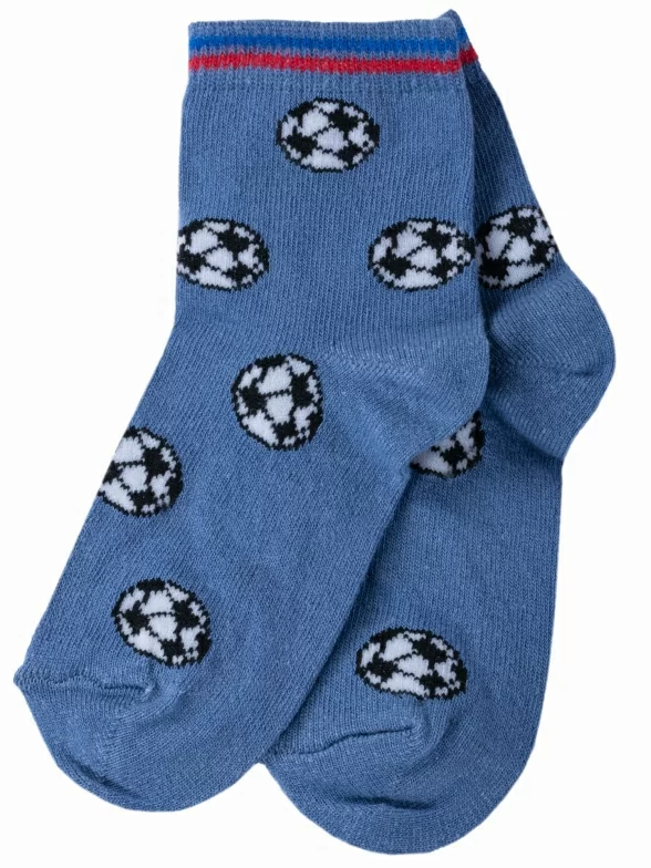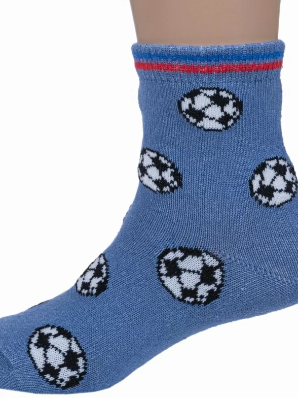 Круглогодичные укороченные детские носки, цвет синий-джинс, спортивные, повседневные, шов обычный (не бесшовные), принт (рисунок): спортивные, игры, с узором, состав: 75% хлопок, 23% полиамид, 2% эластан, арт. 222С70. Производитель «Смоленская чулочная фабрика, Россия» под брендом «Наше смоленской чулочной фабрики».