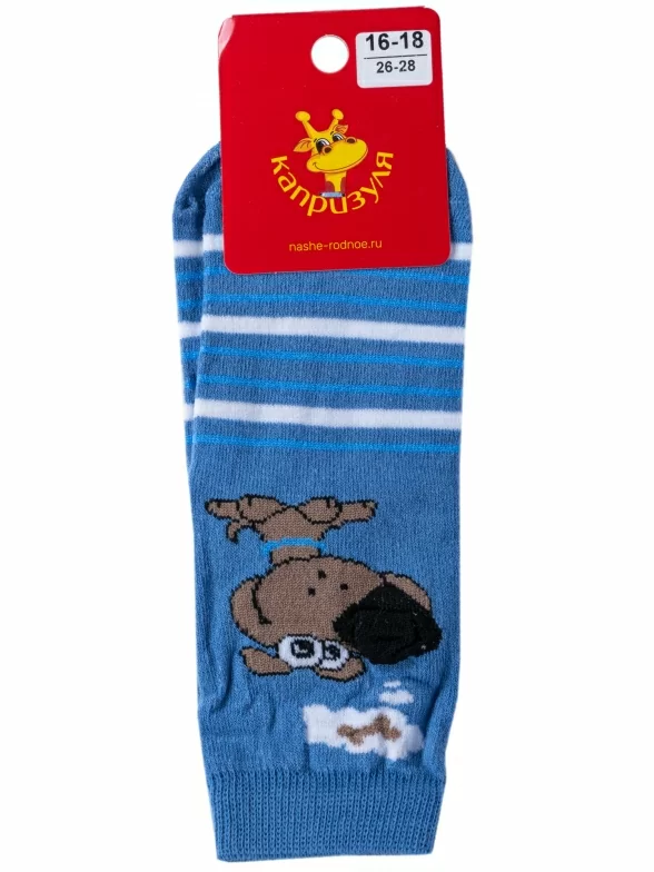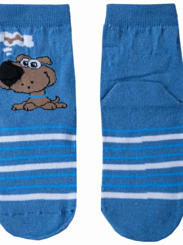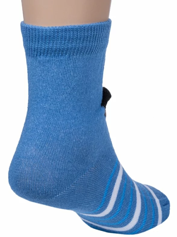 Круглогодичные укороченные детские носки, цвет синий-джинс, необычные, повседневные, шов обычный (не бесшовные), принт (рисунок): животные, с узором, крупные контрастные рисунки, состав: 60% хлопок, 18% полиамид, 20% полипропилен, 2% эластан, арт. 222С11. Производитель «Смоленская чулочная фабрика, Россия» под брендом «Наше смоленской чулочной фабрики».