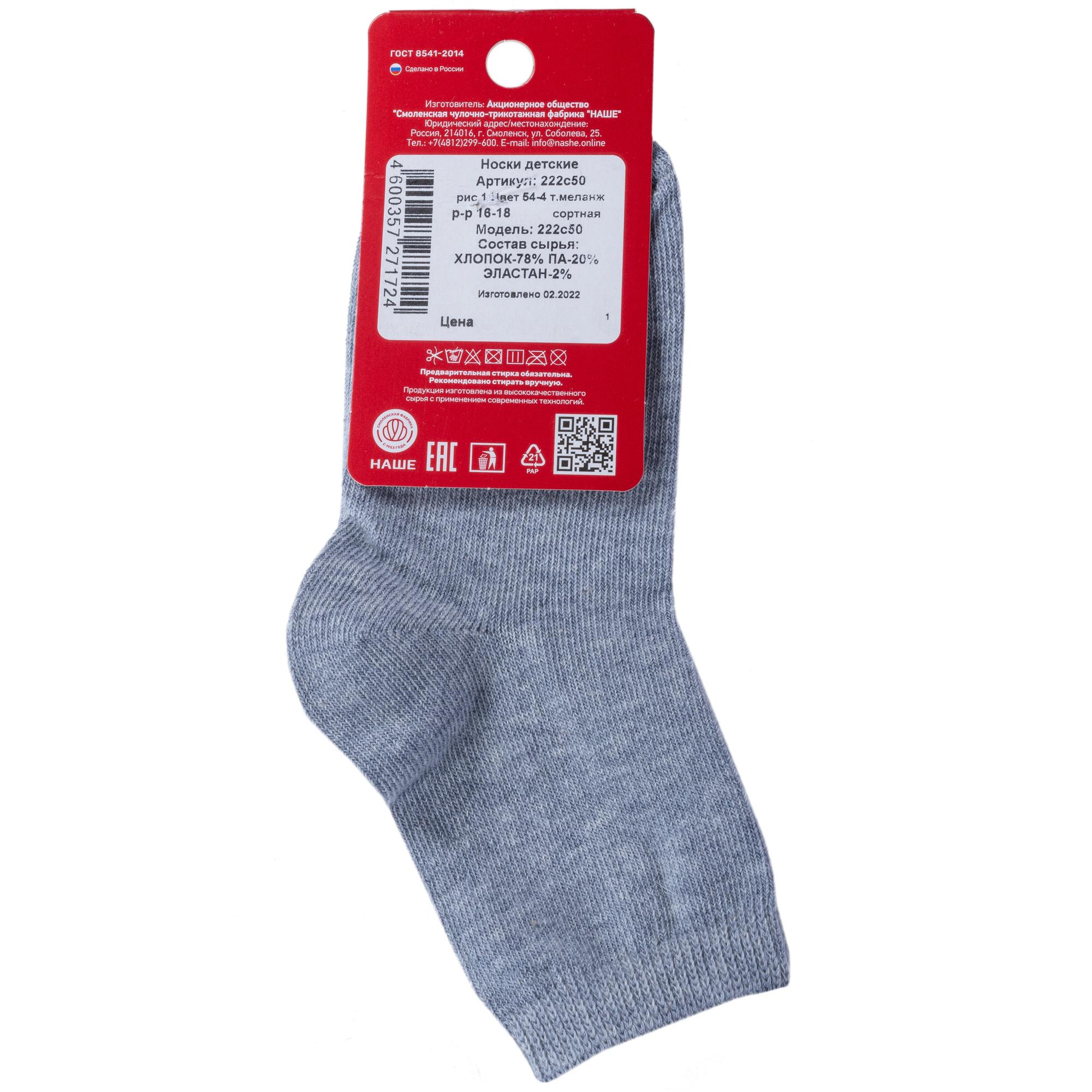 Круглогодичные укороченные детские носки, цвет серый, классические, шов обычный (не бесшовные), принт (рисунок): однотонный, без рисунков/узоров, состав: 78% хлопок, 20% полиамид, 2% эластан, арт. 222С50. Производитель «Смоленская чулочная фабрика, Россия» под брендом «Наше смоленской чулочной фабрики».
