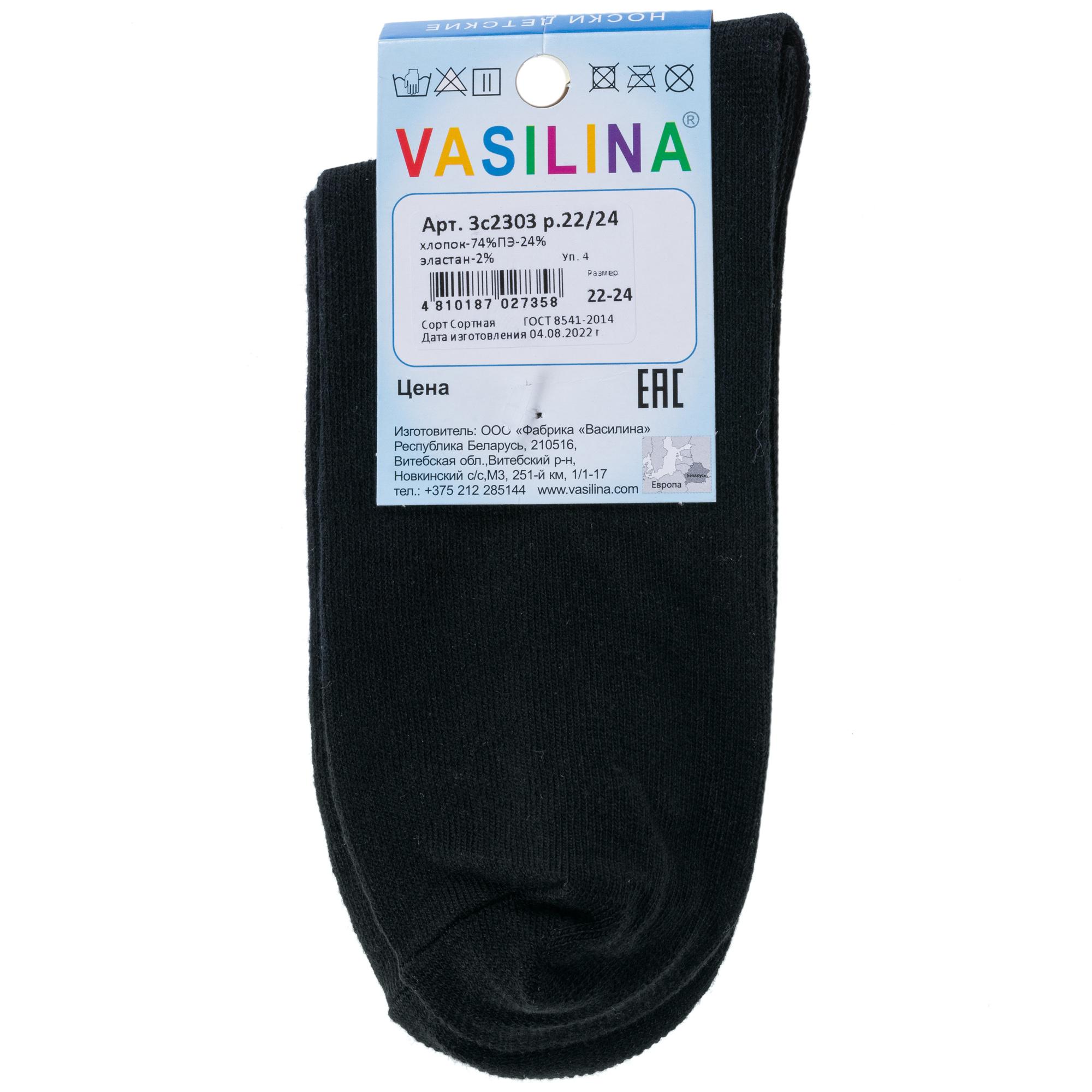 Круглогодичные укороченные детские носки, цвет черный, классические, шов обычный (не бесшовные), принт (рисунок): однотонный, без рисунков/узоров, состав: 74% хлопок, 24% полиэстер, 2% эластан, арт. 3С2303. Производитель «ООО Фабрика Василина, Беларусь» под брендом «Vasilina».