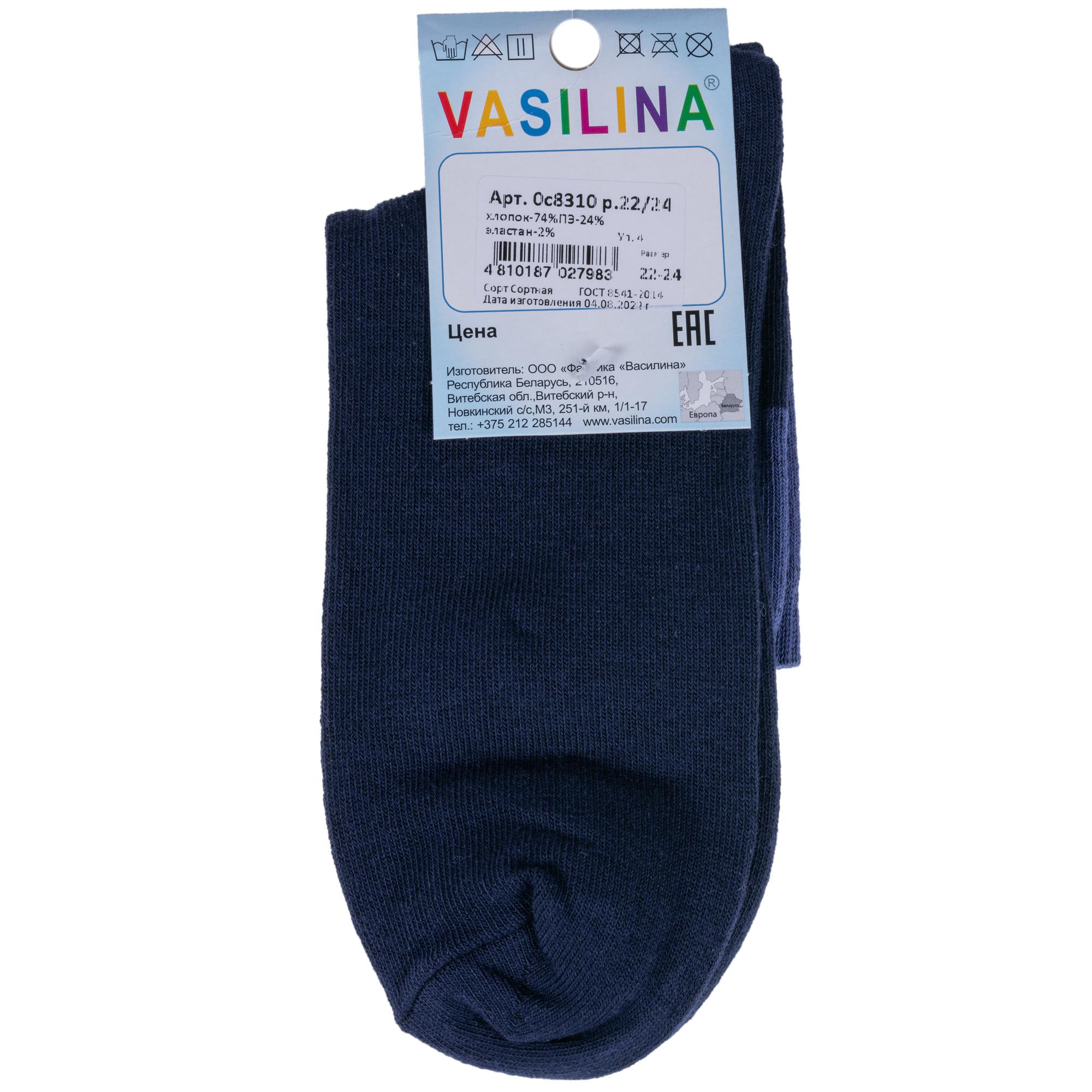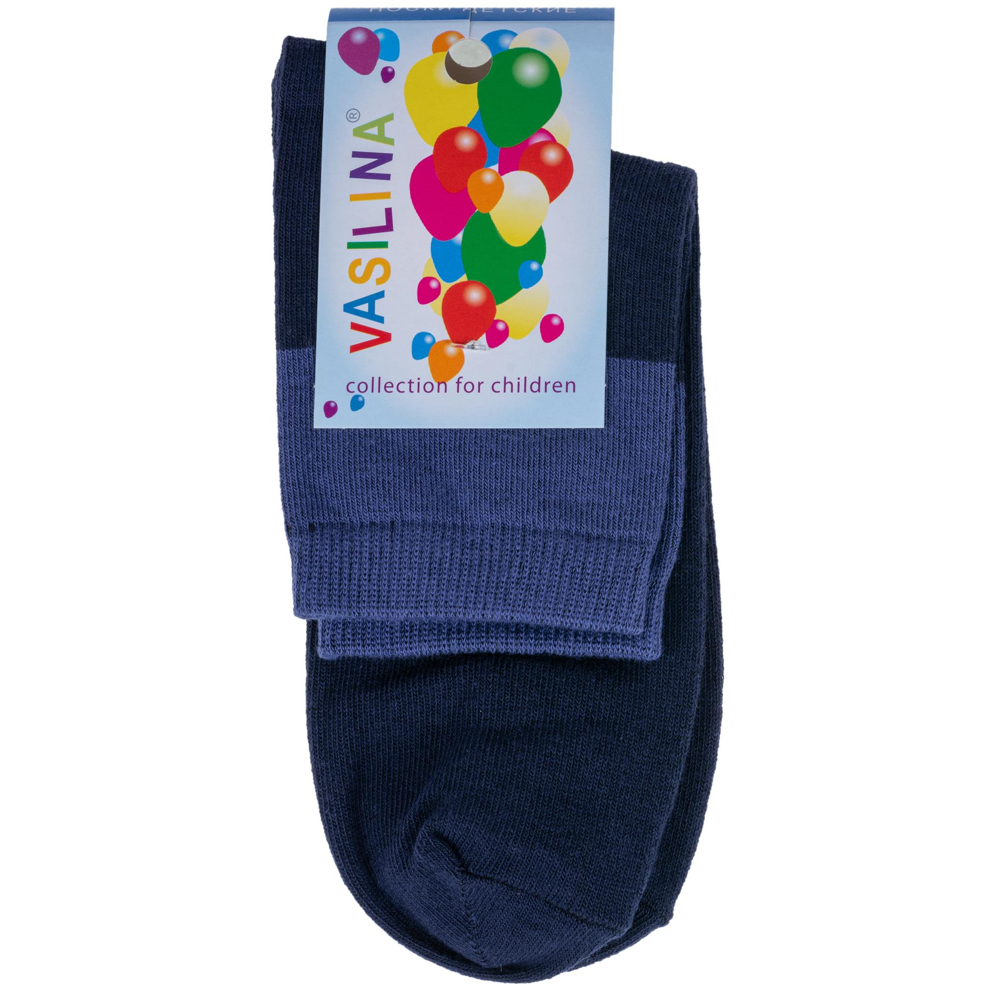 Круглогодичные укороченные детские носки, цвет темно-синий, классические, шов обычный (не бесшовные), принт (рисунок): контрастные пятка / мысок / резинка, с узором, состав: 74% хлопок, 24% полиэстер, 2% эластан, арт. 0С8310. Производитель «ООО Фабрика Василина, Беларусь» под брендом «Vasilina».