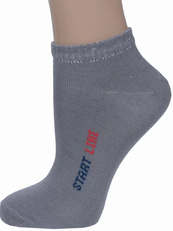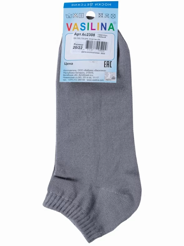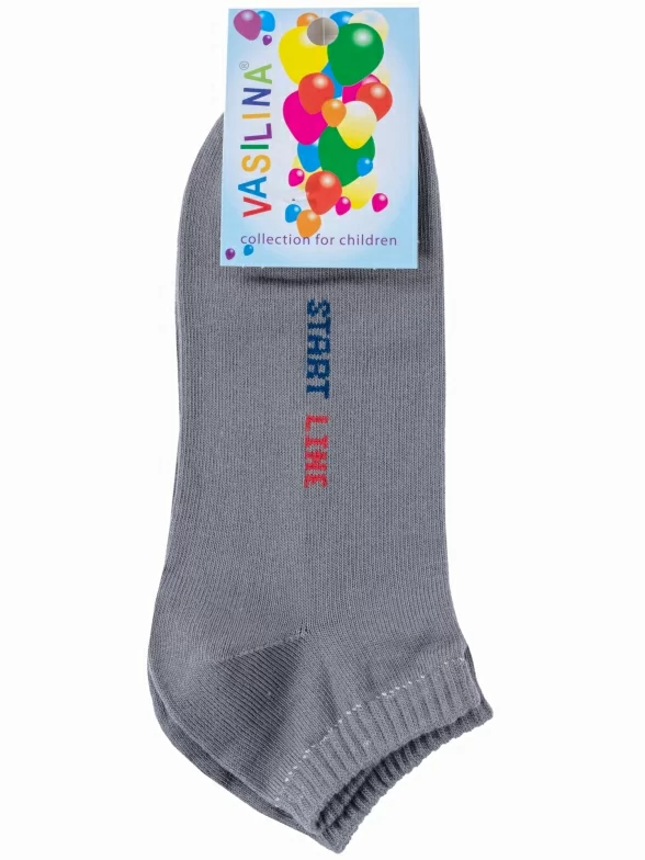 Круглогодичные короткие детские носки, цвет серый, спортивные, классические, шов обычный (не бесшовные), принт (рисунок): спортивные, надписи, с узором, небольшой рисунок, состав: 74% хлопок, 24% полиэстер, 2% эластан, арт. 6С2308. Производитель «ООО Фабрика Василина, Беларусь» под брендом «Vasilina».