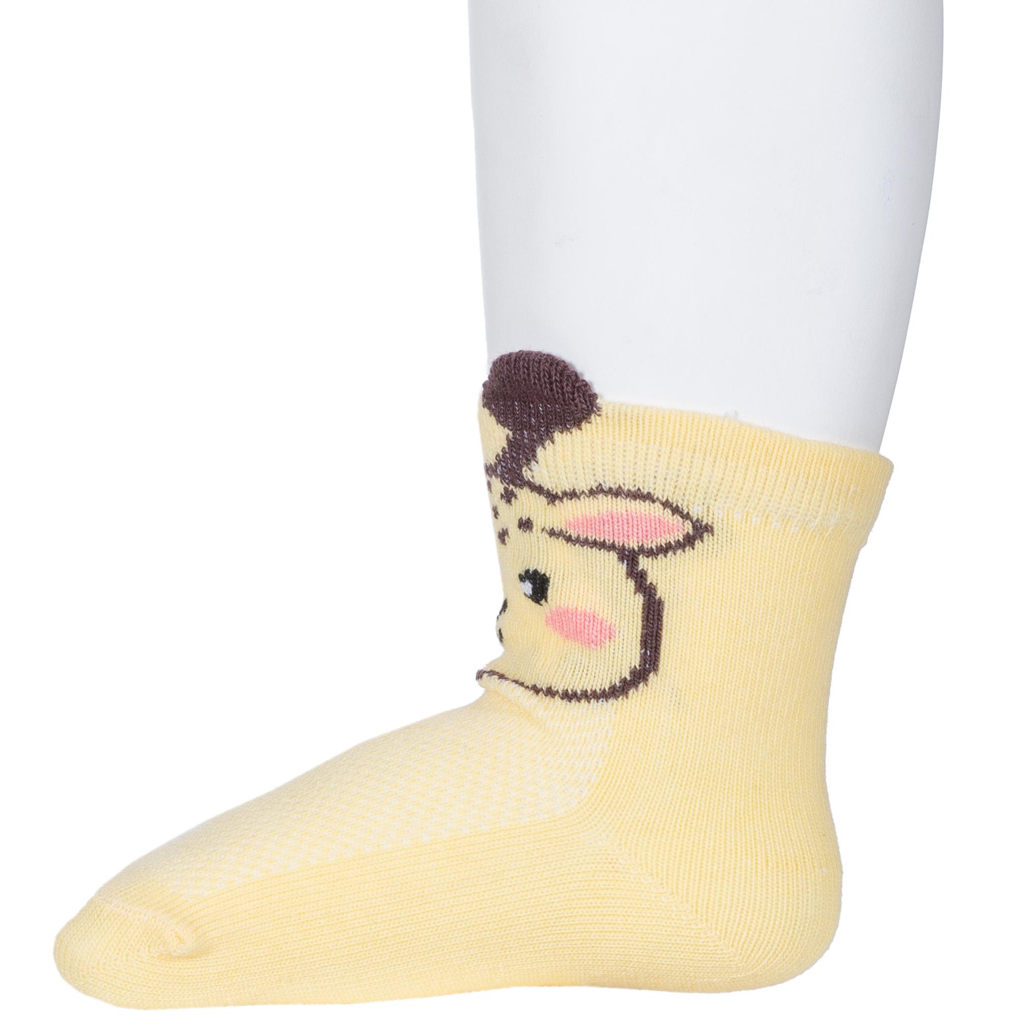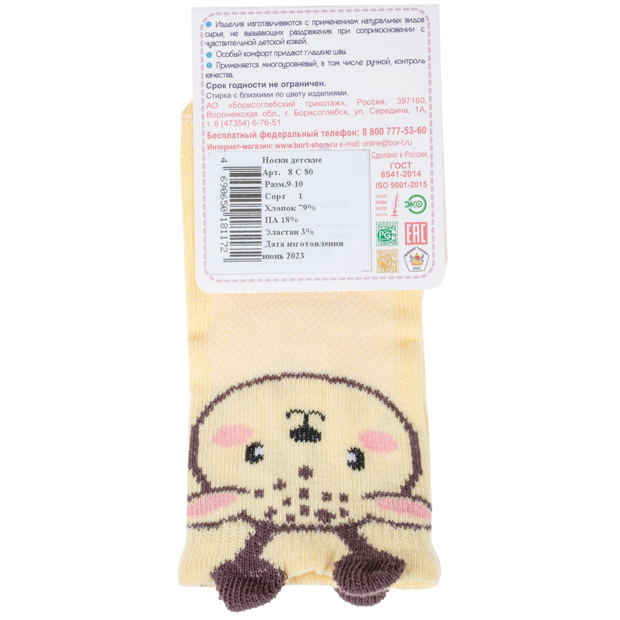 Летние укороченные детские носки, цвет желтый, в сеточку, повседневные, шов обычный (не бесшовные), принт (рисунок): контрастные пятка / мысок / резинка, животные, с узором, состав: 79% хлопок, 18% полиамид, 3% эластан, арт. 8С80. Производитель «АО Борисоглебский трикотаж, Воронежская обл, Россия» под брендом «Борисоглебский трикотаж».