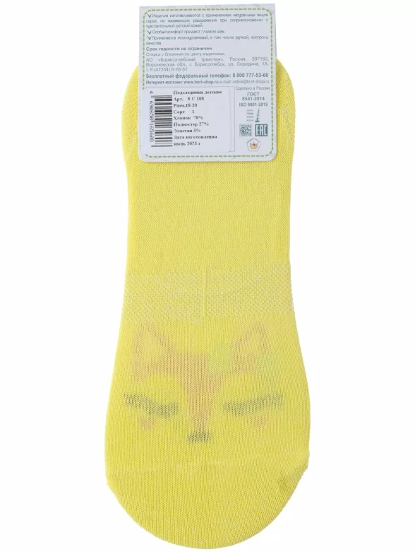 Летние детские подследники, цвет желтый, с силиконовой вставкой, повседневные, шов обычный (не бесшовные), принт (рисунок): животные, с узором, состав: 70% хлопок, 27% полиамид, 3% эластан, арт. 8С108. Производитель «АО Борисоглебский трикотаж, Воронежская обл, Россия» под брендом «Борисоглебский трикотаж».