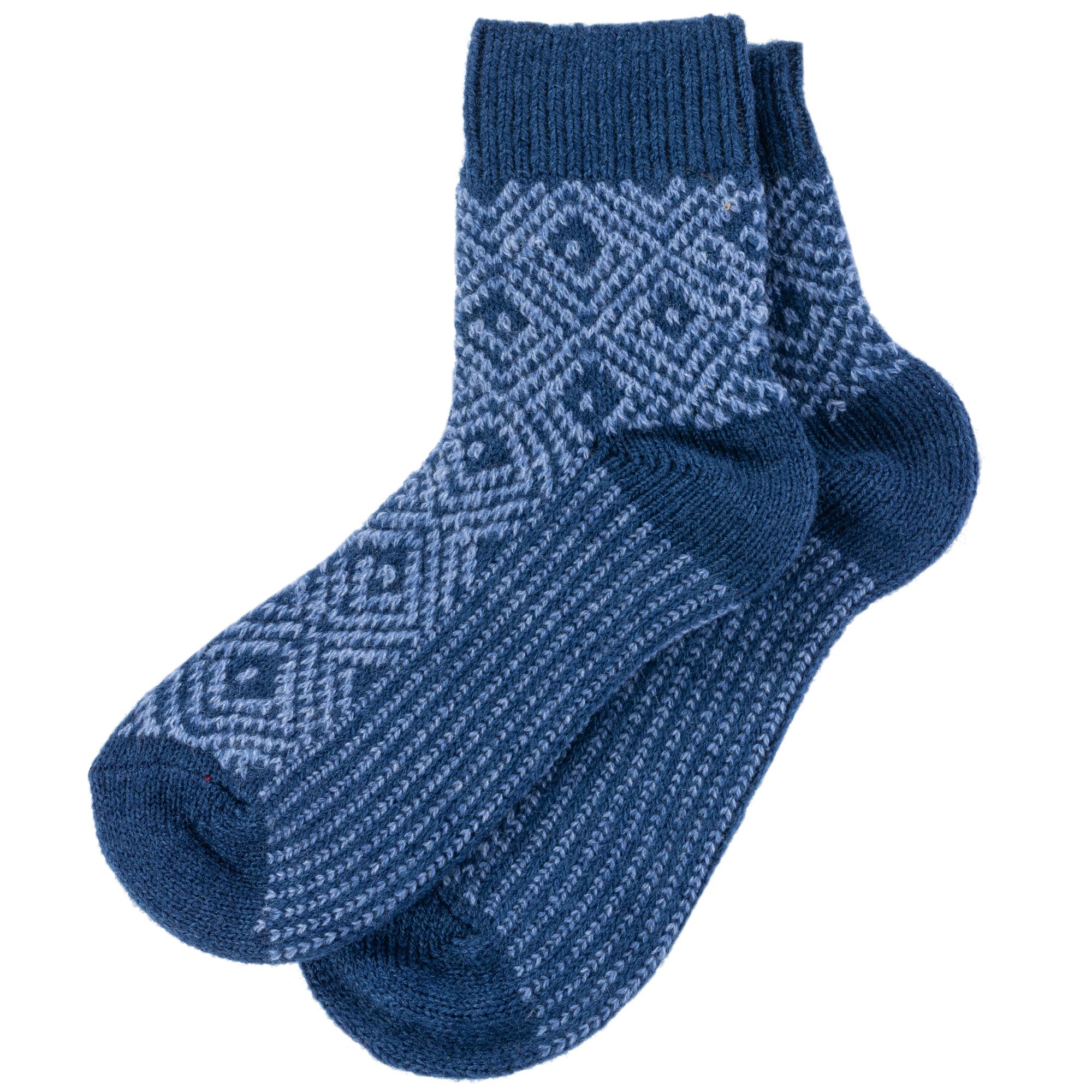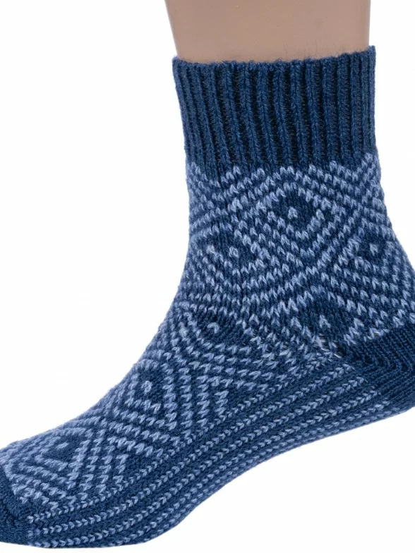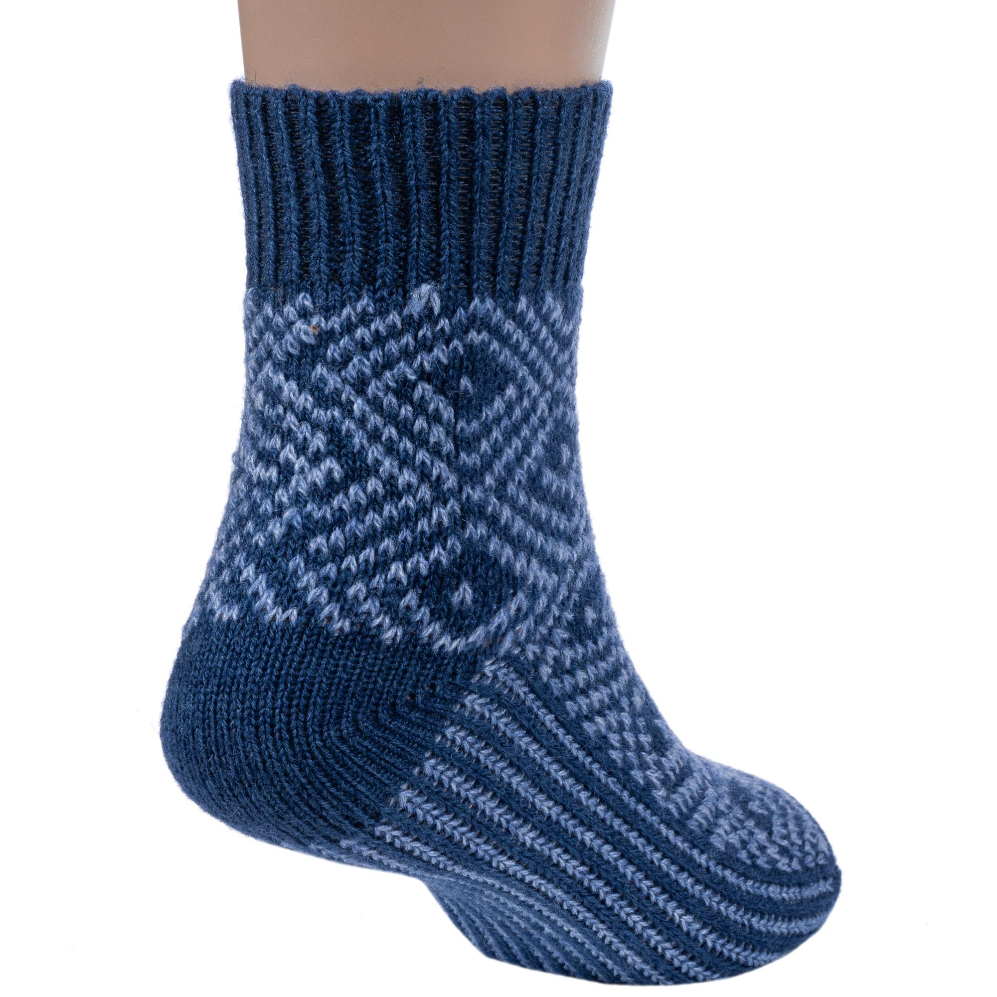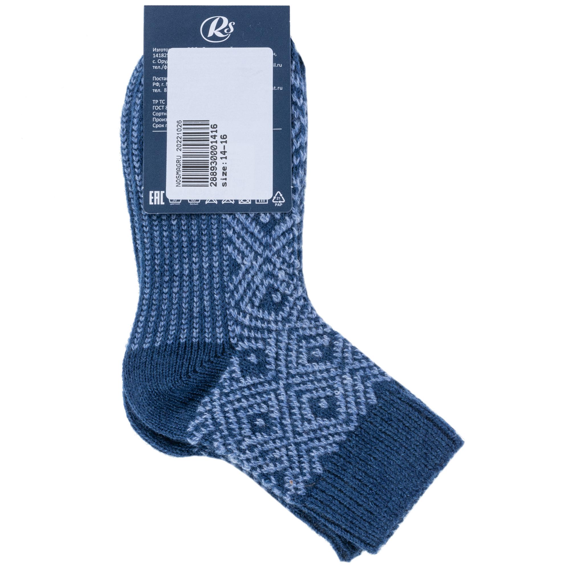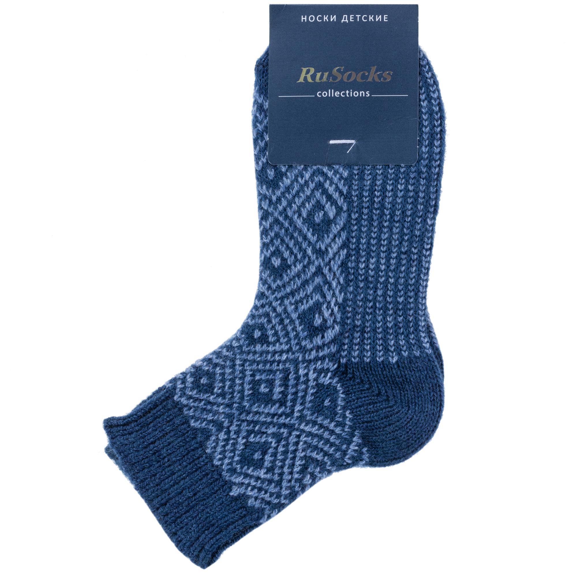 Зимние средней длины детские носки, цвет джинс, теплые, классические, шов обычный (не бесшовные), принт (рисунок): геометрия, с узором, состав: 28% шерсть, 62% акрил, 10% полиамид, арт. Д-382. Производитель «ООО Орудьевский трикотаж, Россия» под брендом «Rusocks (орудьевский трикотаж)».