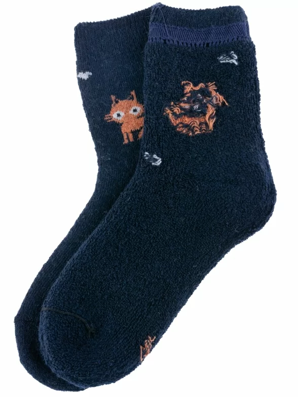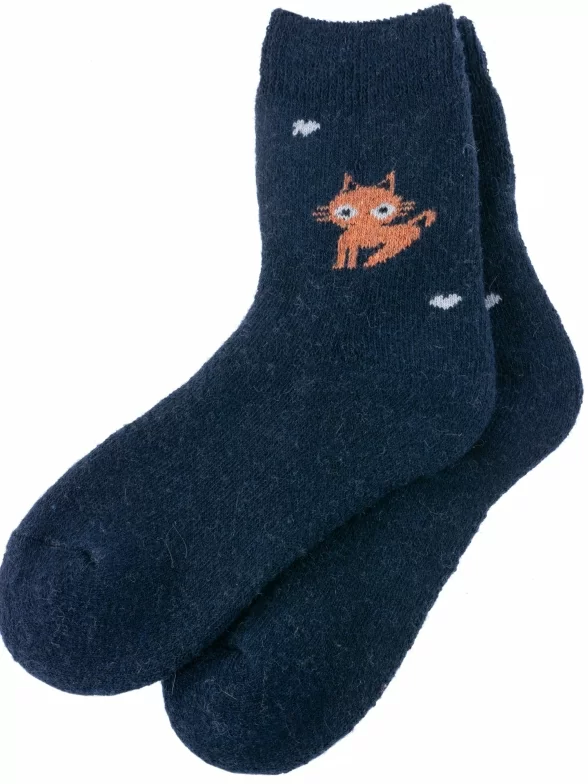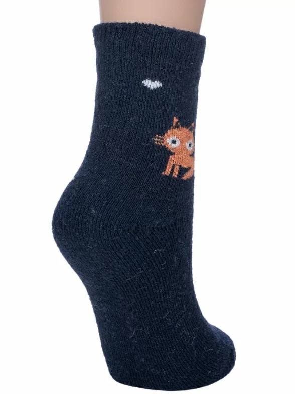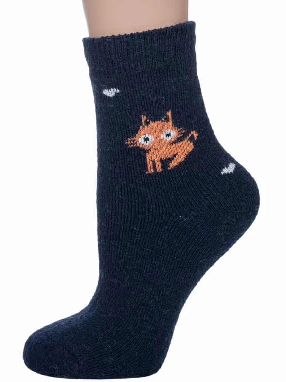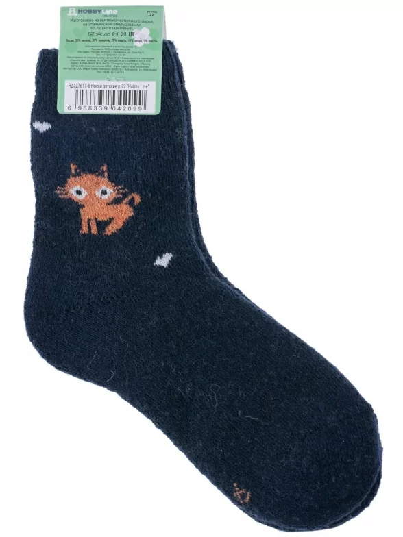 Зимние укороченные детские носки, цвет темно-синий, теплые, махровые, повседневные, шов обычный (не бесшовные), принт (рисунок): животные, с узором, состав: 35% вискоза, 30% полиэстер, 20% шерсть, 10% ангора, 5% эластан, арт. 7617-6. Производитель «Китай, страна бренда - Россия» под брендом «Hobby line».