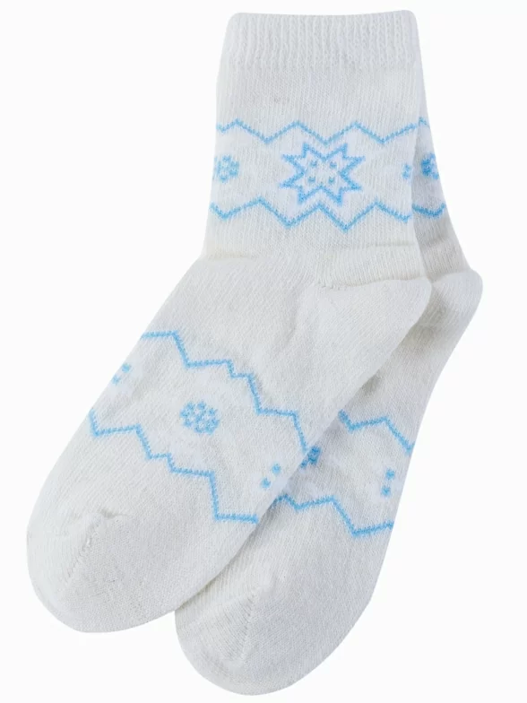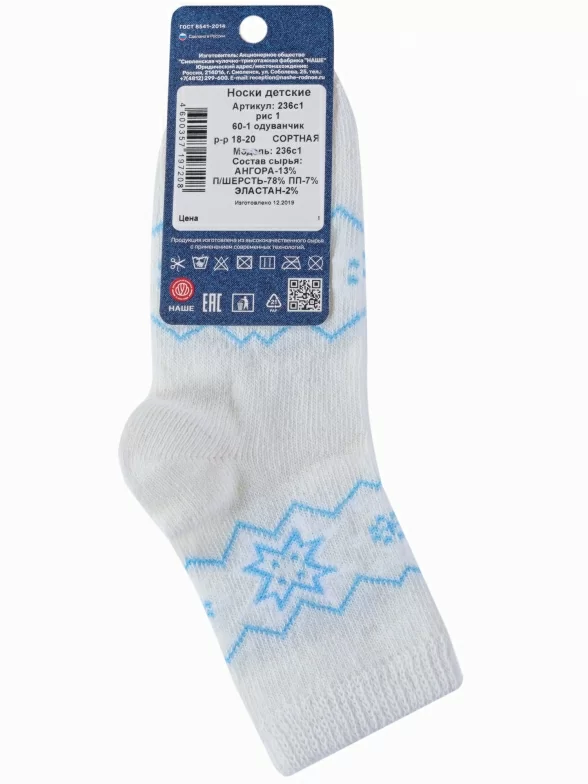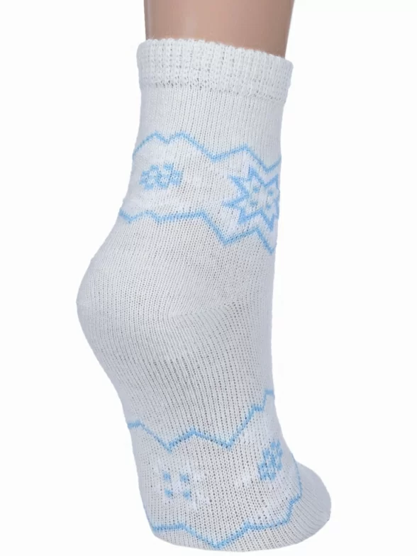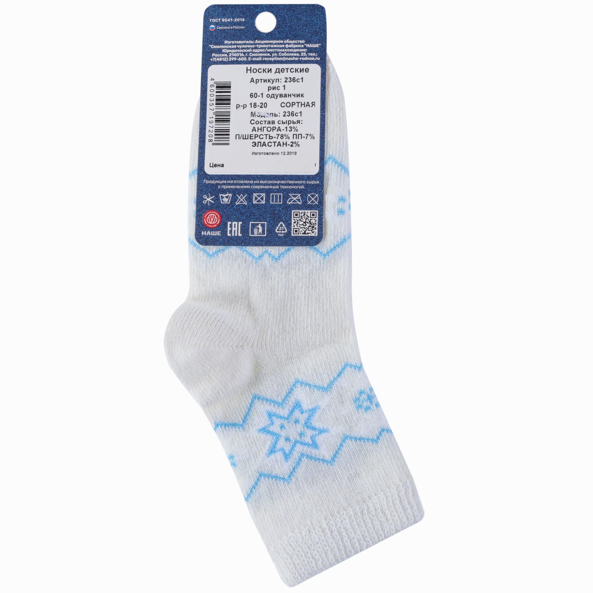 Зимние укороченные детские носки, цвет белый, теплые, повседневные, шов обычный (не бесшовные), принт (рисунок): орнамент, с узором, состав: 78% полушерсть, 13% ангора, 7% полипропилен, 2% эластан, арт. 236С1. Производитель «Смоленская чулочная фабрика, Россия» под брендом «Наше смоленской чулочной фабрики».