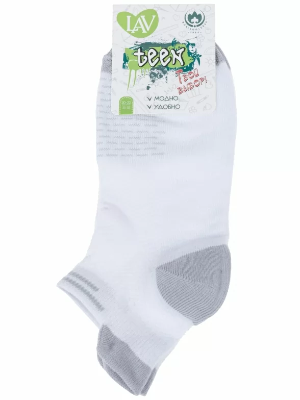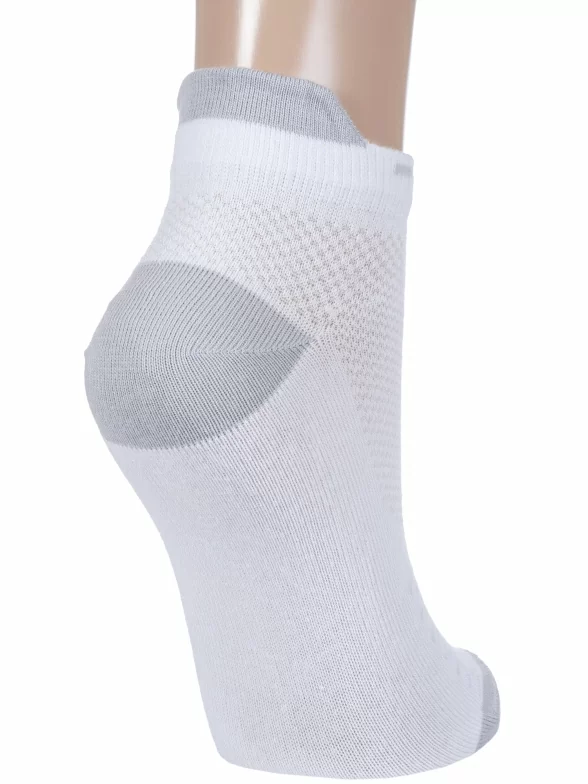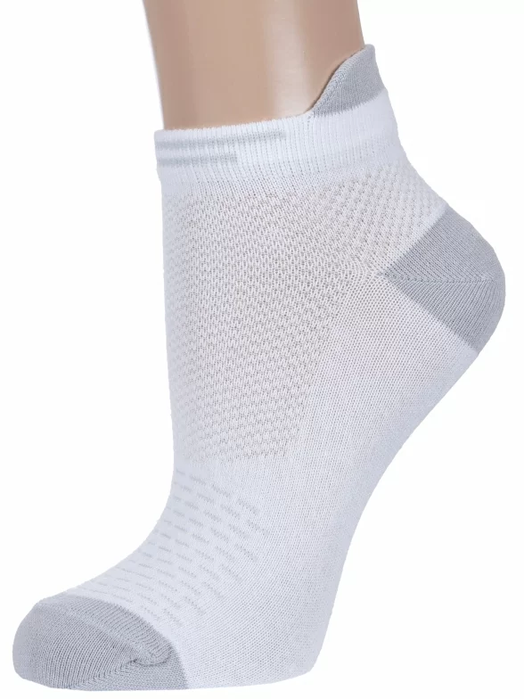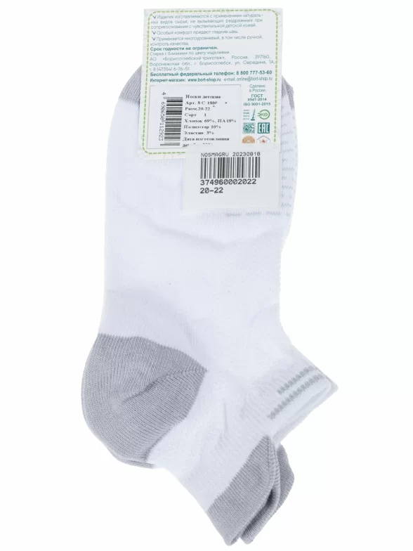 Круглогодичные короткие детские носки, цвет белый, спортивные, в сеточку, ажурные, шов обычный (не бесшовные), принт (рисунок): полоски, мелкий принт, контрастные пятка / мысок / резинка, с узором, состав: 69% хлопок, 18% полиамид, 10% полиэстер, 3% эластан, арт. 8С1800. Производитель «АО Борисоглебский трикотаж, Воронежская обл, Россия» под брендом «Борисоглебский трикотаж».