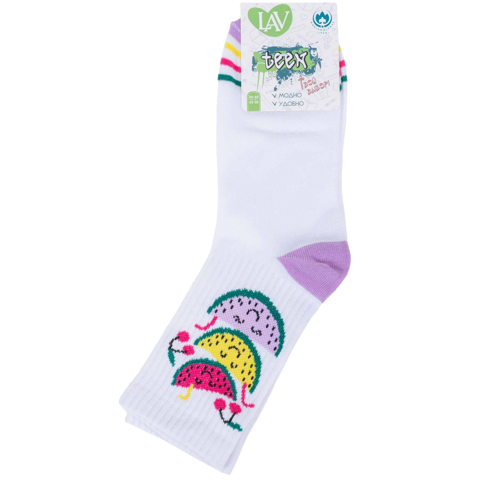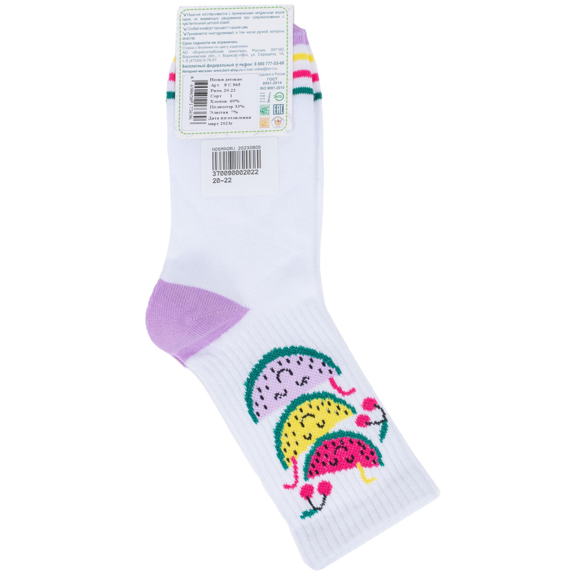 Круглогодичные укороченные детские носки, цвет белый, спортивные, повседневные, шов обычный (не бесшовные), принт (рисунок): овощи / фрукты / ягоды, контрастные пятка / мысок / резинка, в рубчик, с узором, состав: 60% хлопок, 33% полиэстер, 7% эластан, арт. 8С965. Производитель «АО Борисоглебский трикотаж, Воронежская обл, Россия» под брендом «Борисоглебский трикотаж».
