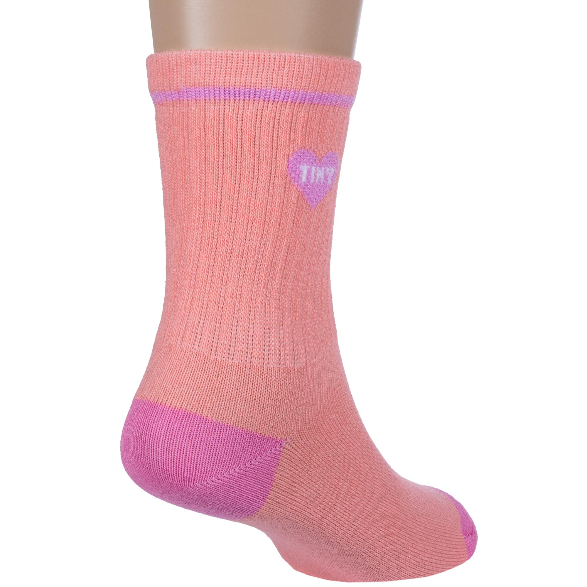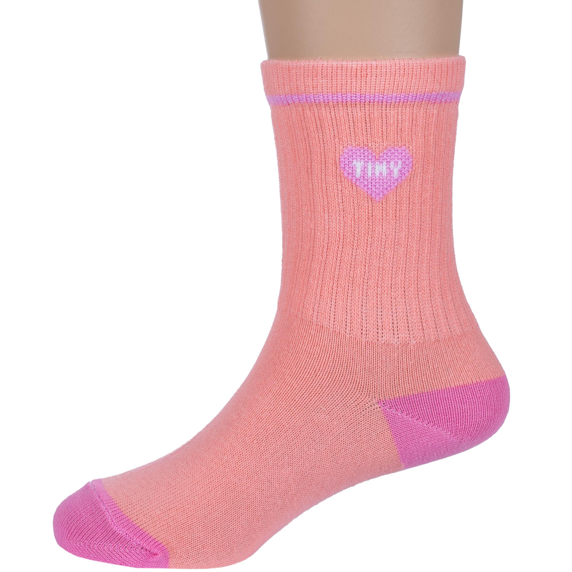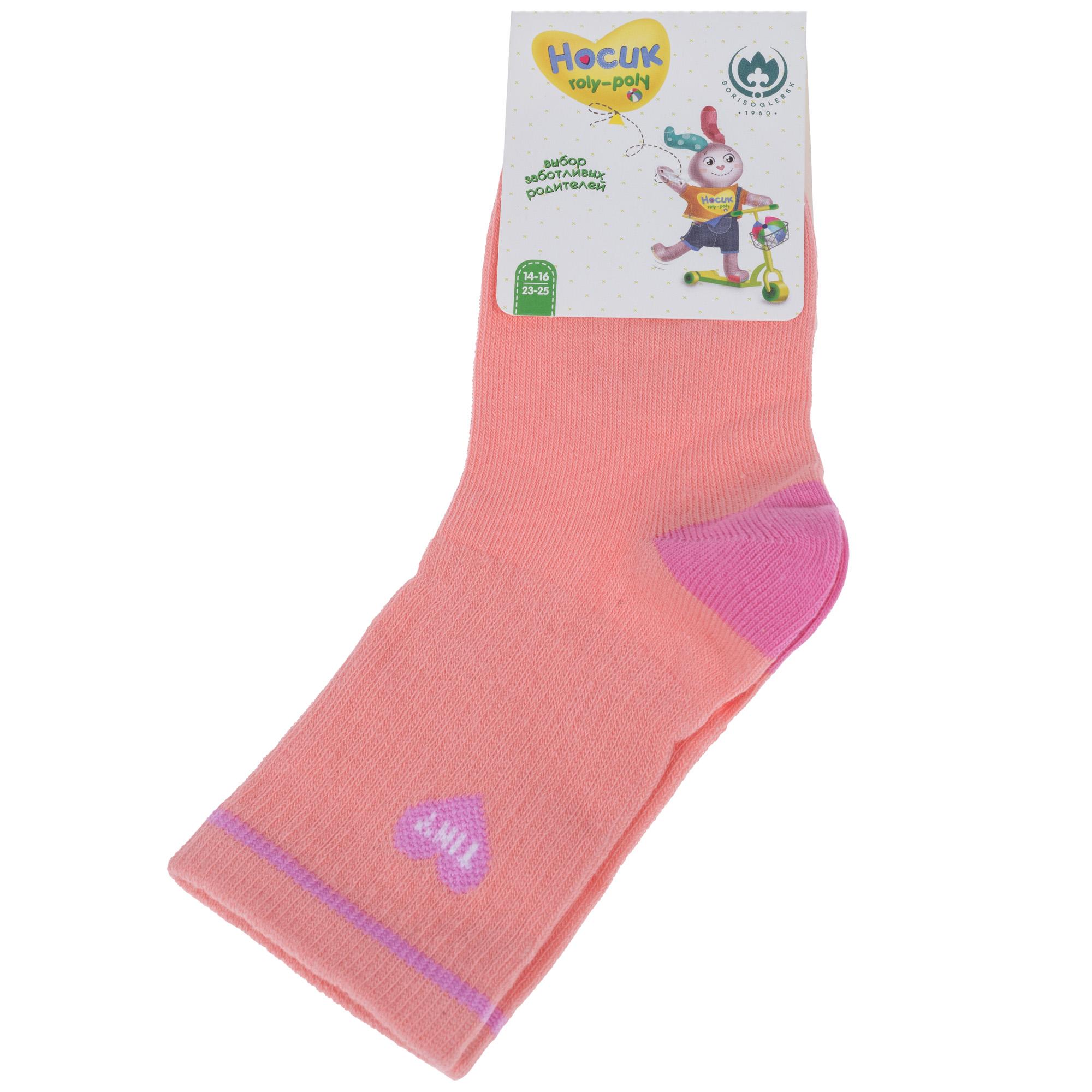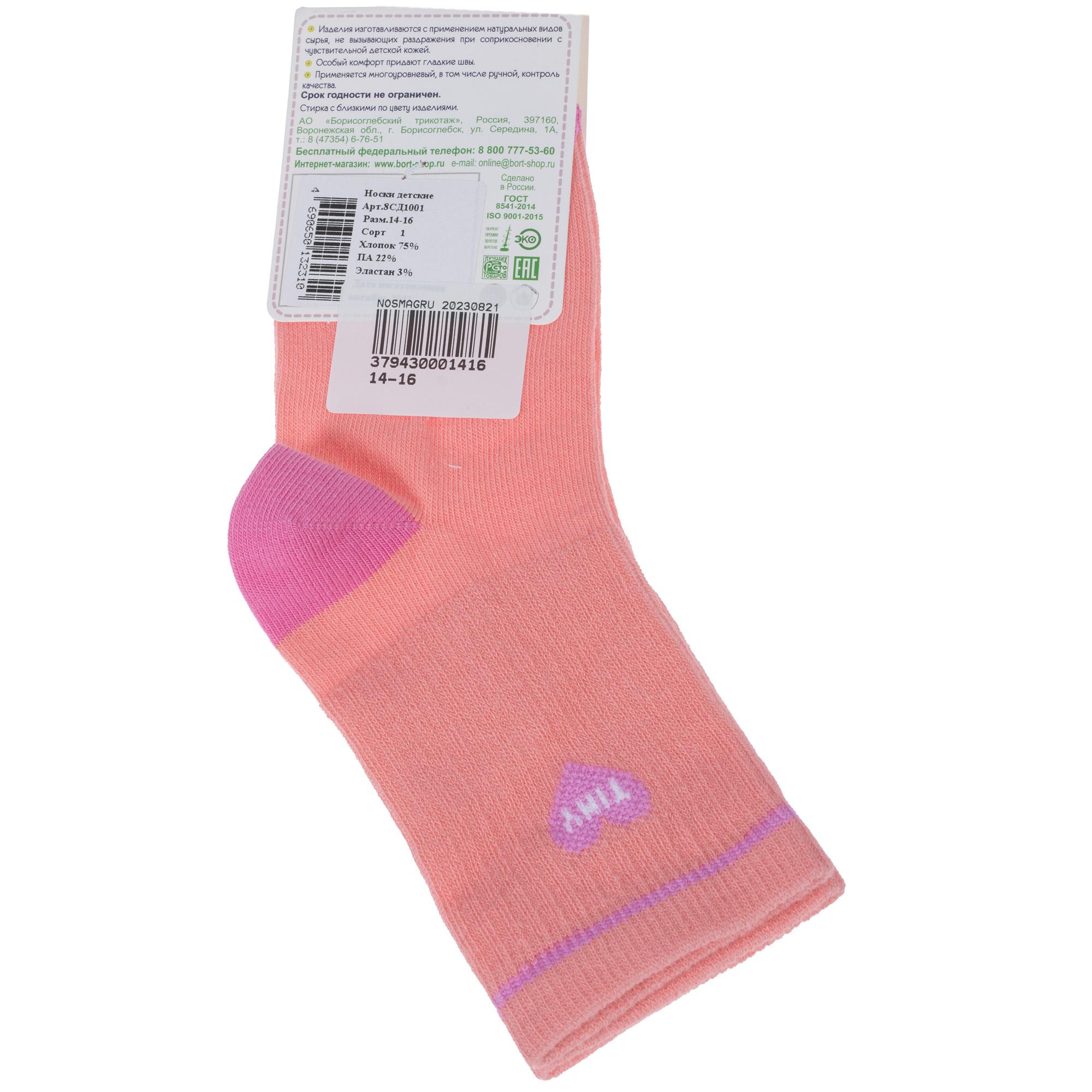 Круглогодичные средней длины детские носки, цвет розовый, спортивные, шов обычный (не бесшовные), принт (рисунок): сердечки / поцелуи / любовь, контрастные пятка / мысок / резинка, в рубчик, с узором, состав: 75% хлопок, 22% полиамид, 3% эластан, арт. 8СД1001. Производитель «АО Борисоглебский трикотаж, Воронежская обл, Россия» под брендом «Борисоглебский трикотаж».